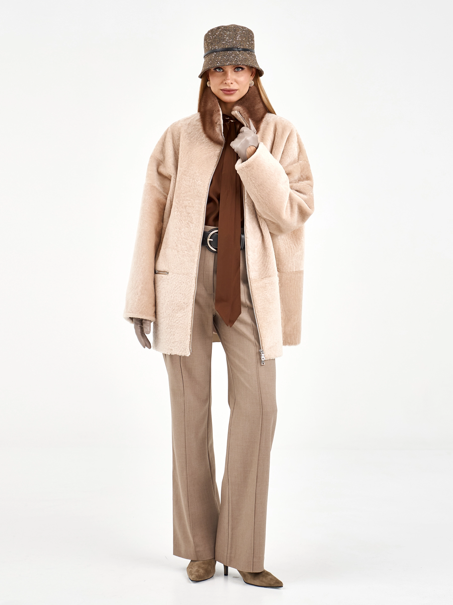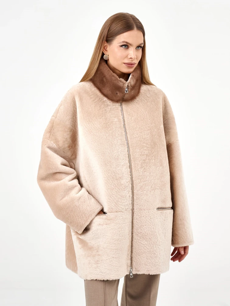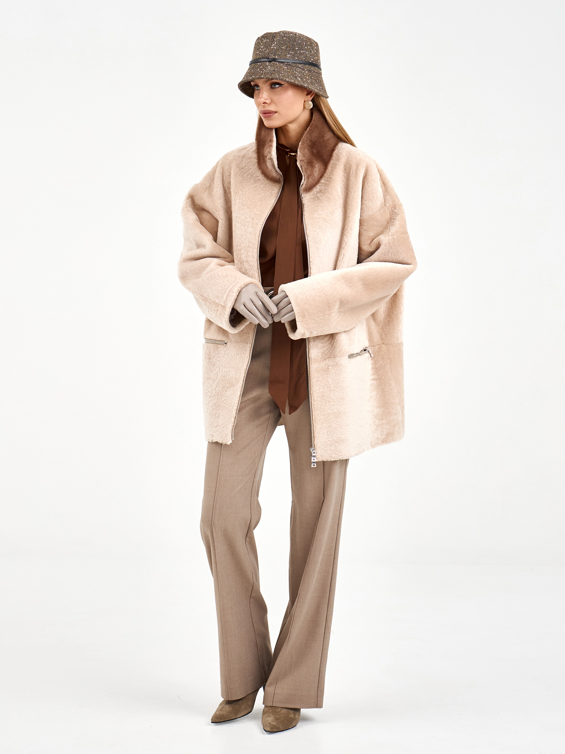 Дублёнка из астрагана свободного кроя изготовлена из премиальной овчины белого цвета. Она максимально тёплая, но при этом лёгкая и комфортная. Боковые карманы, как и само изделие, застёгиваются на молнии. Объёмный воротник-стойку дополнен густым мехом коричневой норки.