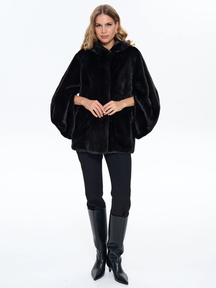 Женская шуба BRASCHI из натурального меха норки представлена в классическом прямом силуэте ультракороткой длины примерно 78 см, специально разработанной для удобства автоледи и активного образа жизни. Модель выполнена с аккуратными втачными рукавами и оснащена многофункциональным капюшоном-трансформером, который легко превращается в стильный объемный воротник, при этом лаконичный дизайн без декоративной отделки подчеркивает природную красоту и безупречное качество меха норки. Шуба застегивается на надежные металлические клипсы, имеет комфортную вискозную подкладку и выполнена в редком благородном оттенке Violet Fox — глубоком холодном цвете с изысканными фиолетово-синеватыми переливами, напоминающими мех чернобурой лисы, что придает образу особую роскошь и элегантность, сохраняя при этом все теплоизоляционные свойства для холодной зимы.