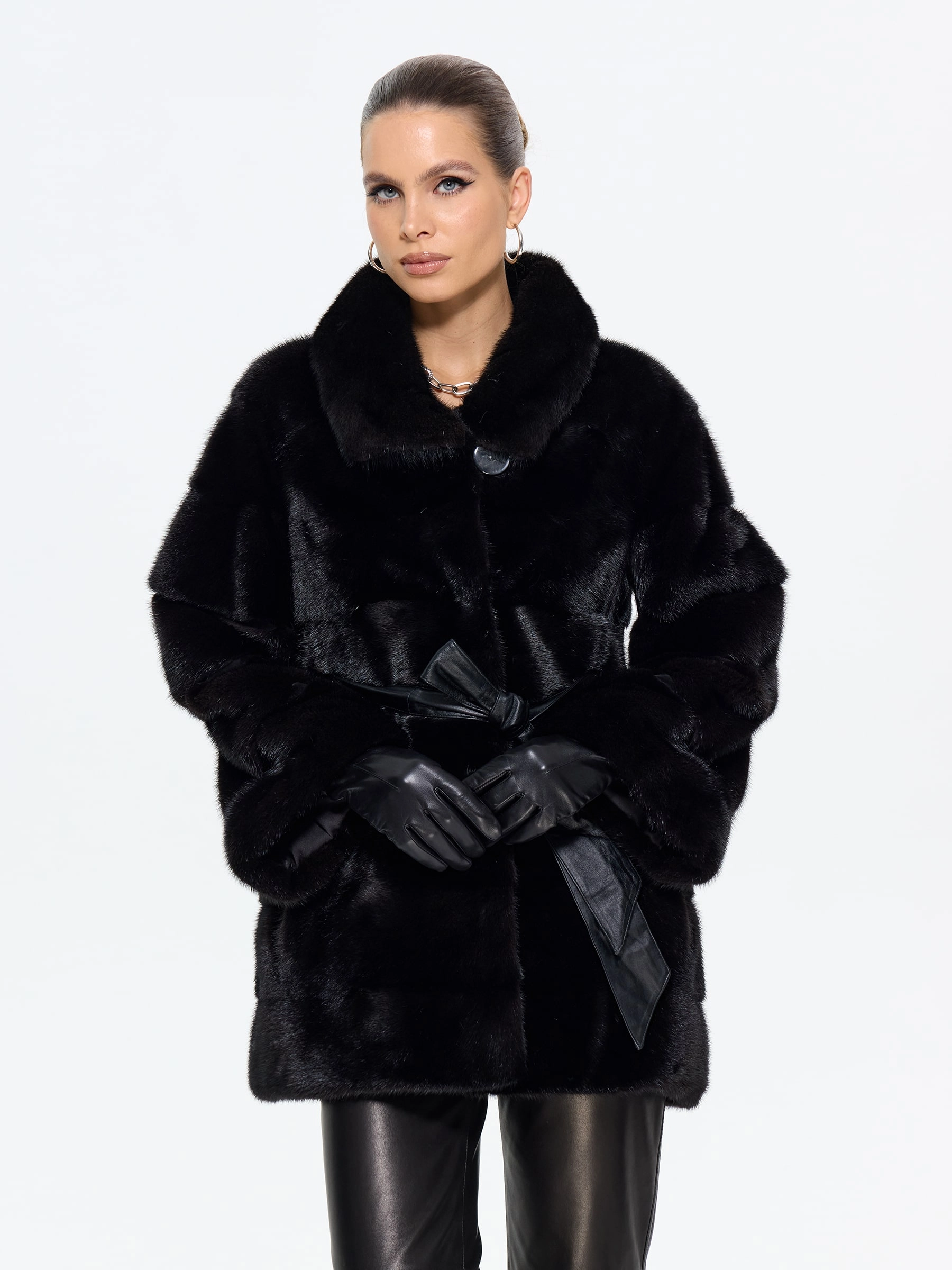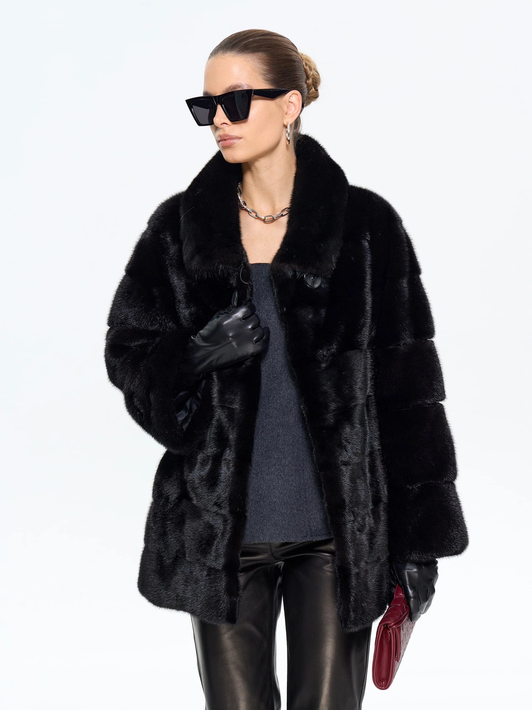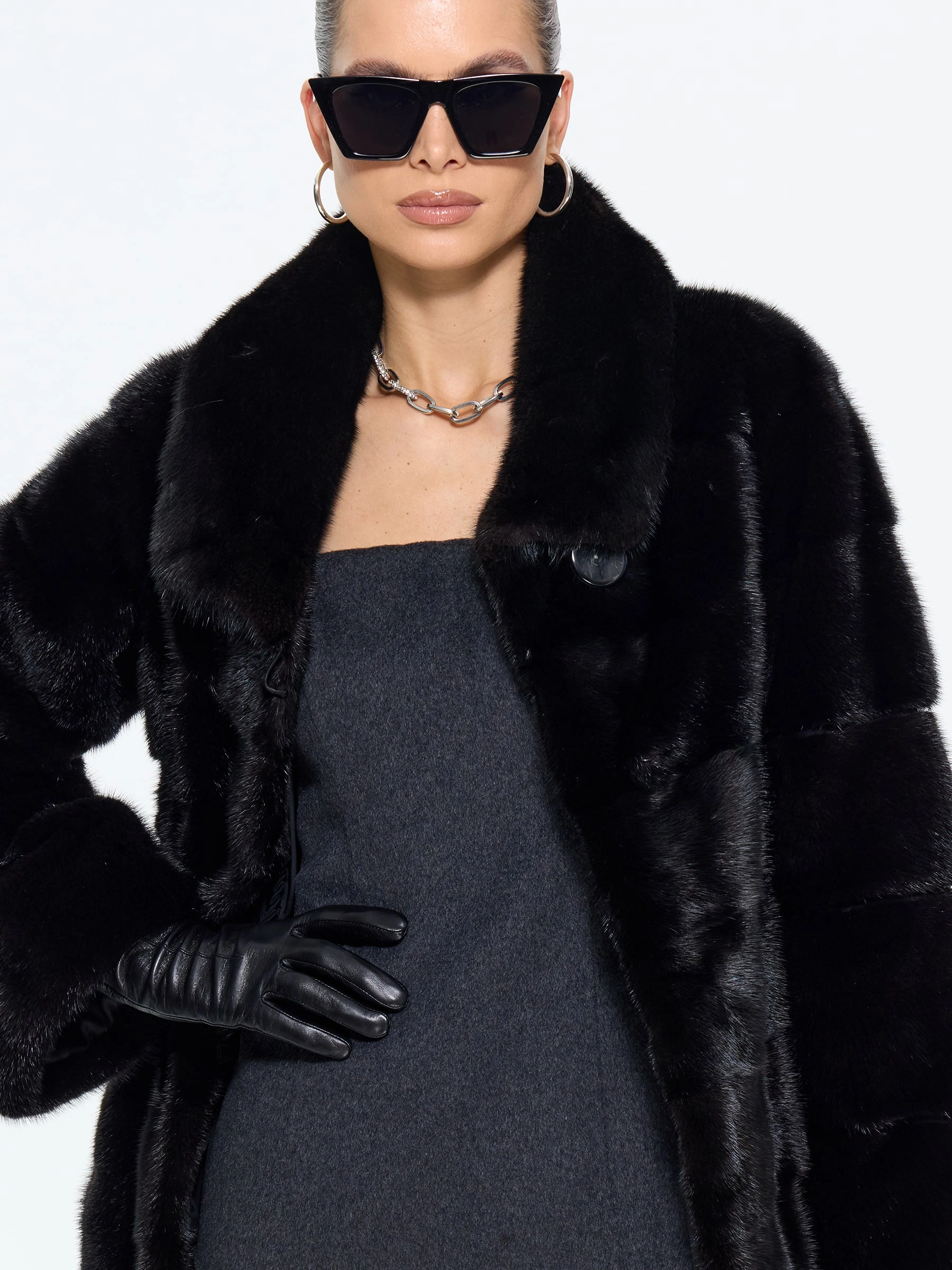 Классическая шуба из густого черного меха норки с блестящим шелковистым ворсом премиального качества сочетает удобство и элегантность. Универсальная длина и прямой крой обеспечивают комфорт для любого типа фигуры, делая модель идеальной для вождения и городских прогулок. Отложной воротник подчеркивает линию шеи, добавляя образу изысканности. Легкое и теплое изделие отлично защищает от мороза, не утяжеляя силуэт. Надежные клипсы-застежки фиксируют шубу, бережно сохраняя мех. MANAKAS — воплощение идеального баланса практичности и роскоши.