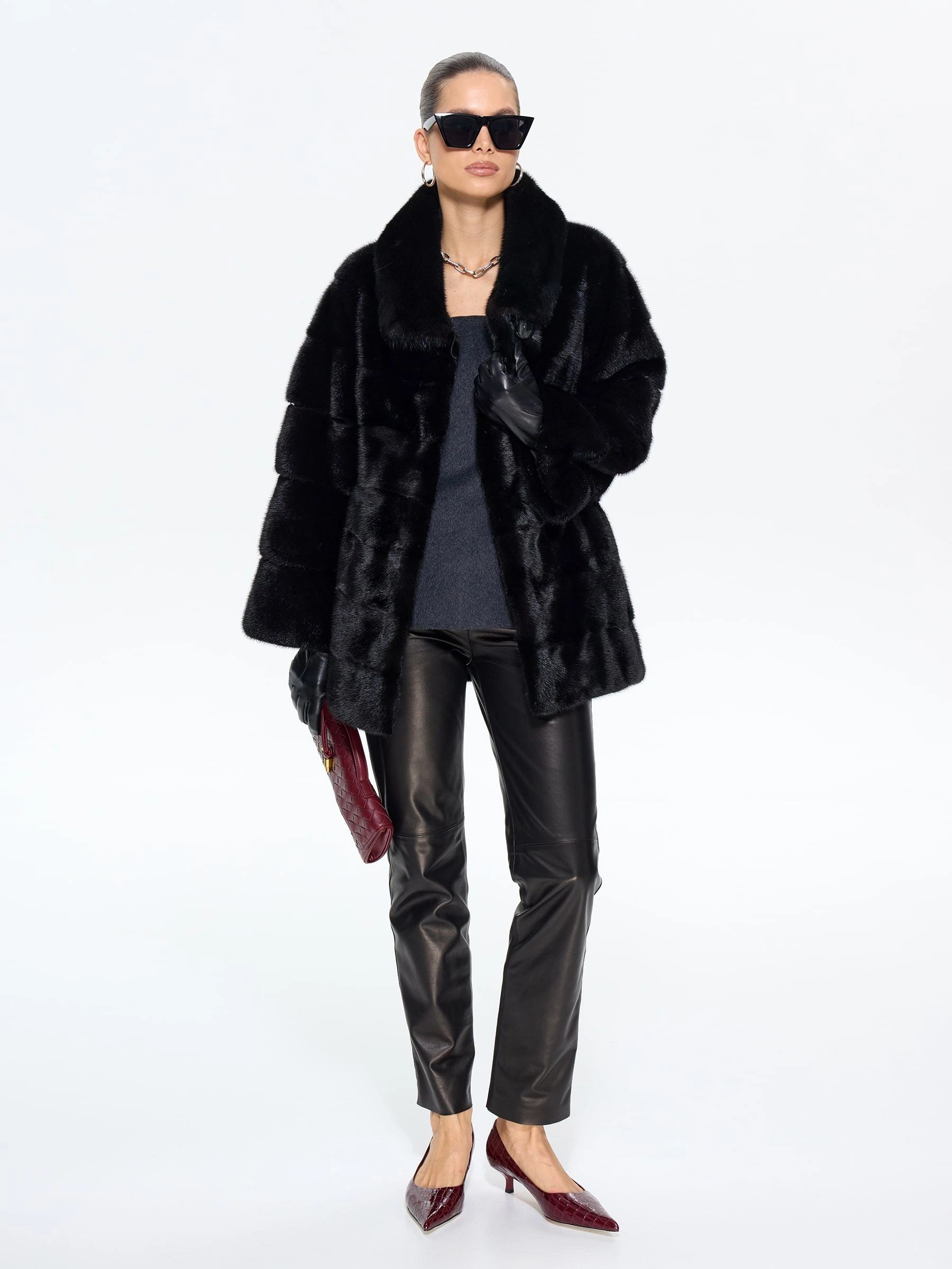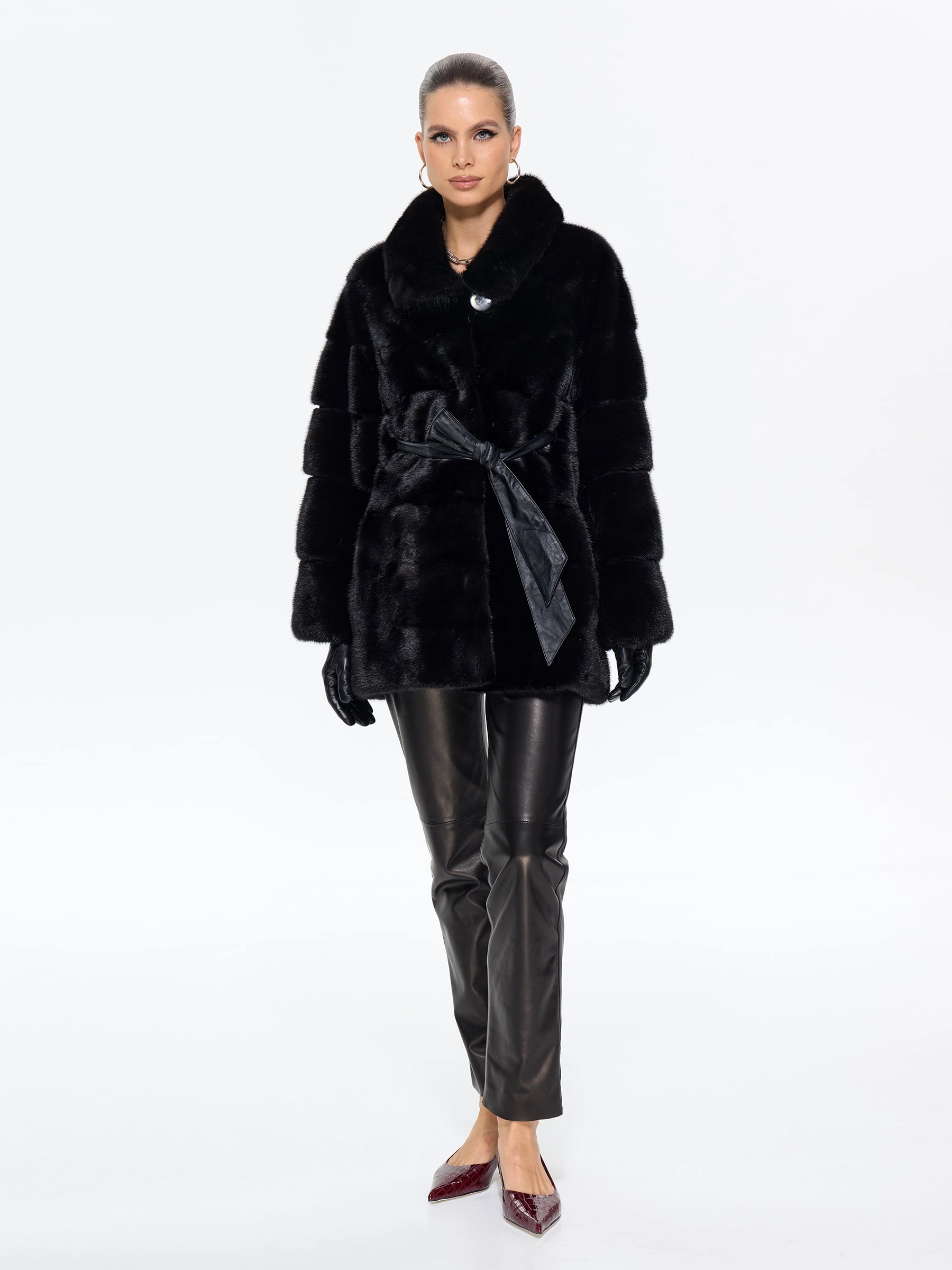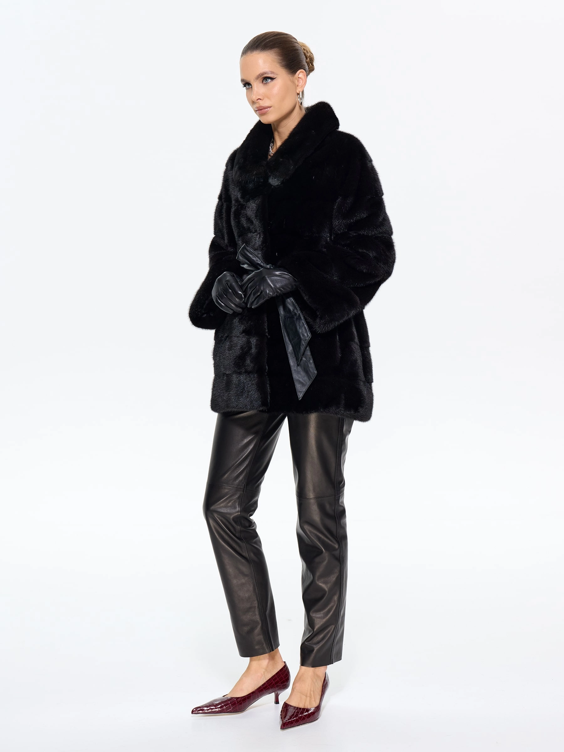 Классическая шуба из густого черного меха норки с блестящим шелковистым ворсом премиального качества сочетает удобство и элегантность. Универсальная длина и прямой крой обеспечивают комфорт для любого типа фигуры, делая модель идеальной для вождения и городских прогулок. Отложной воротник подчеркивает линию шеи, добавляя образу изысканности. Легкое и теплое изделие отлично защищает от мороза, не утяжеляя силуэт. Надежные клипсы-застежки фиксируют шубу, бережно сохраняя мех. MANAKAS — воплощение идеального баланса практичности и роскоши.