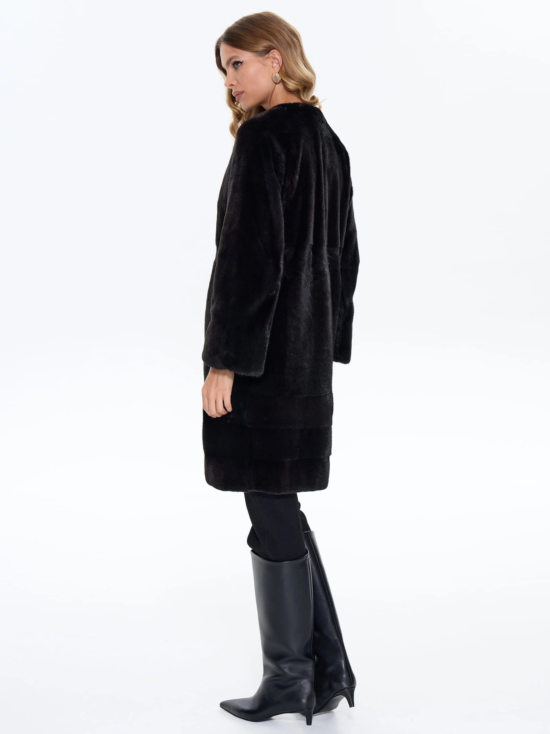 Для пошива этой шубы мастера использовали густой мех норки глубокого черного цвета с металлическим отливом, где шкурки выложены перпендикулярно хребтовой линии, создавая эффект плетеной текстуры. Универсальный прямой крой визуально стройнит фигуру, а отсутствие воротника дает свободу для объемных снудов и шелковых платков, в то время как бесшовное соединение плеча и рукава реглана устраняет давление на верхнюю часть тела, обеспечивая абсолютную свободу движений. Усиленные проймы с двойной строчкой предотвращают деформацию при ношении объемной одежды, а длина midi, закрывающая бедра и часть колен, создает оптимальный баланс тепла и мобильности. Изделие с двумя боковыми карманами идеально подходит для города, удобно в транспорте и отлично сохраняет тепло в суровые морозы, завершая образ аккуратной застежкой на скрытых клипсах.