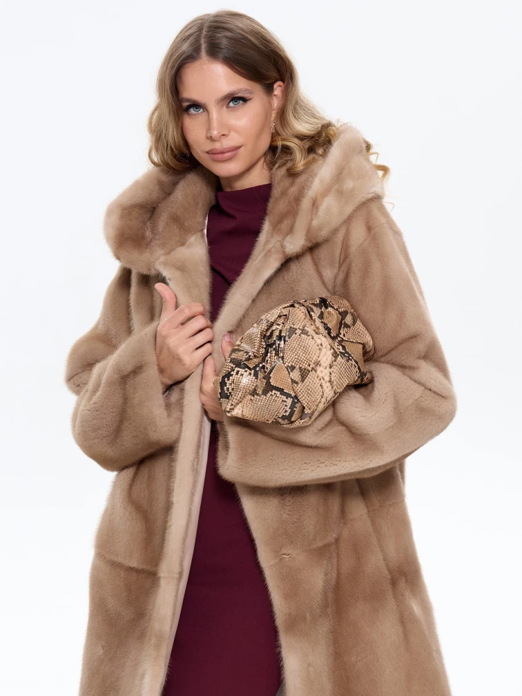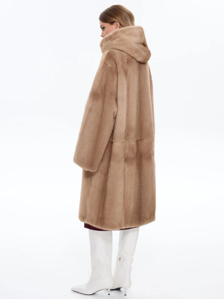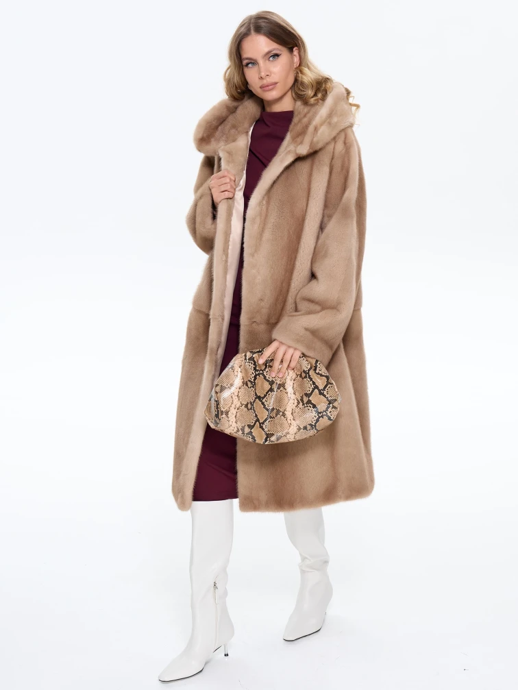 Товар длинная норковая женская шуба с капюшоном жанет, пастельная, размер 52, артикул 65170.