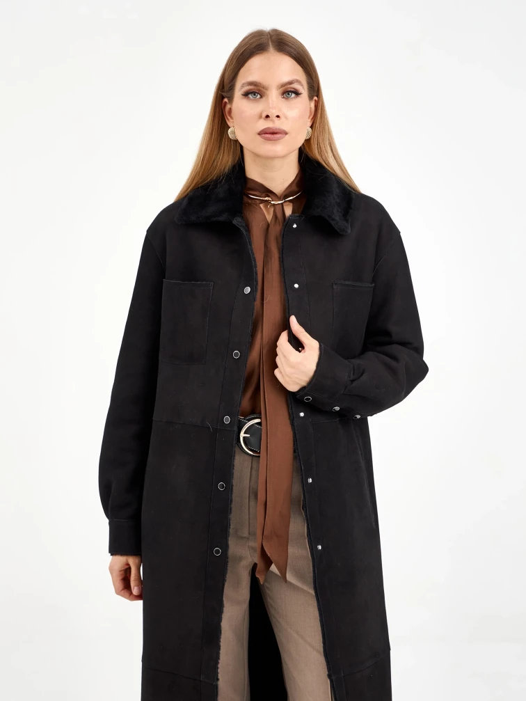 Длинная замшевая женская дубленка 2086, черная, размер 44, артикул 64980