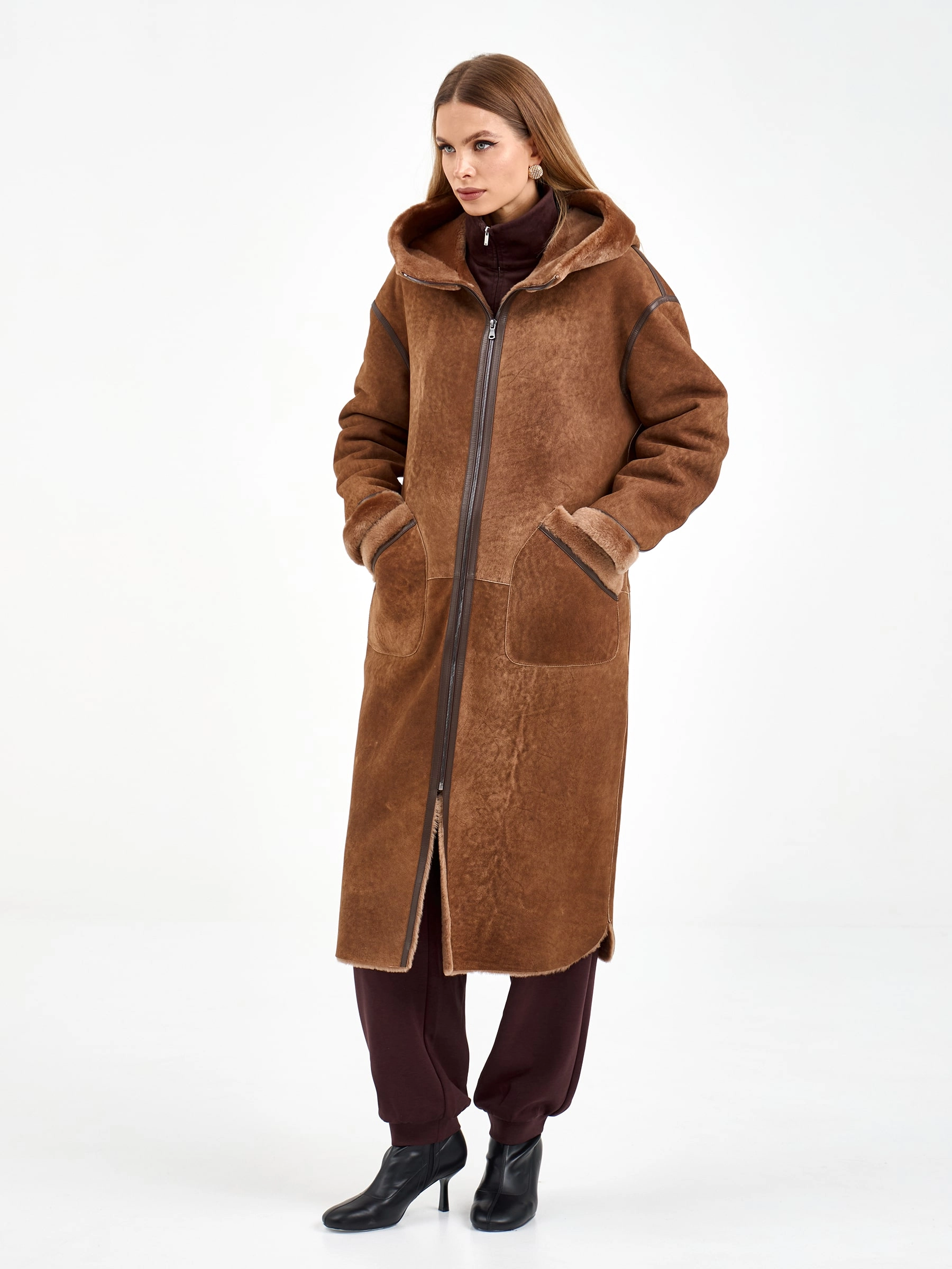 Длинная дубленка с капюшоном из элитной овчины мерино. Модель свободного кроя длиной 115 см с несъемным капюшоном и спущенным рукавом создает элегантный повседневный образ. Дополнена длинным поясом для регулирования силуэта, меховой опушкой капюшона и стильными кожаными кантами. Стилисты рекомендуют носить с объемными свитерами, удлиненными платьями и высокими сапогами — такой ансамбль подчеркнет вашу элегантность и подарит ощущение комфорта в холодные дни. Идеальное сочетание роскоши, тепла и непревзойденного стиля.