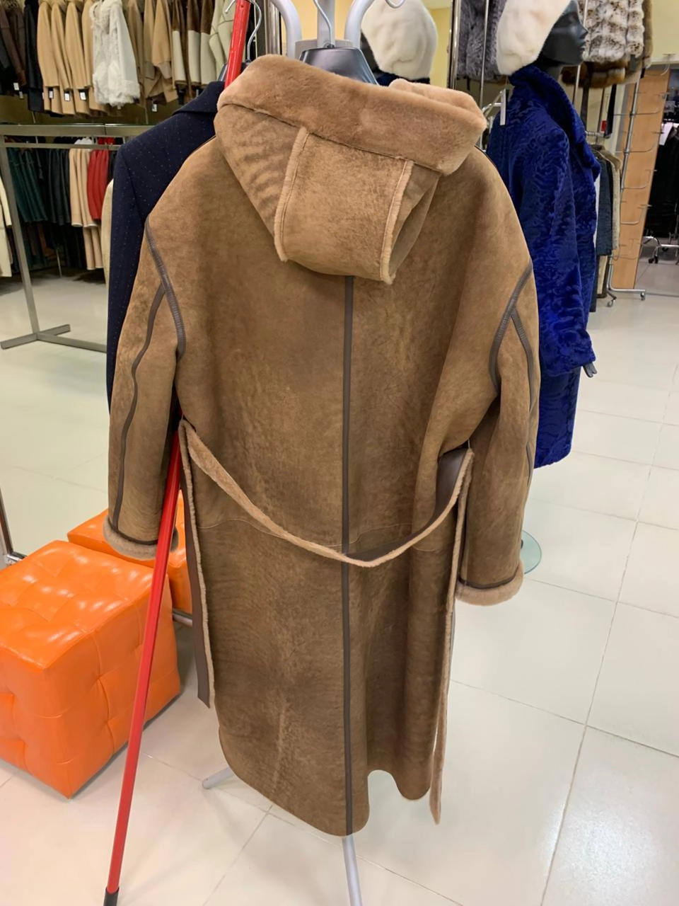 Товар длинная женская дубленка с капюшоном 2073, бежевая, размер 46, артикул 65240. Длина изделия 115 см.
