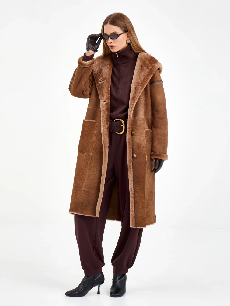Эта модель создана для тех, кто ценит уют и стиль. Длинная дубленка из натуральной овчины мерино свободного кроя с глубоким капюшоном согреет и завершит любой образ. Детали, на которые стоит обратить внимание: изящный кожаный кант по линиям кроя и практичные накладные боковые карманы. Расслабленный силуэт и спущенный рукав создают ощущение непринужденной элегантности. Стилисты рекомендуют носить ее с объемным свитером, прямыми джинсами и ботинками челси для создания модного повседневного лука с драйвом.