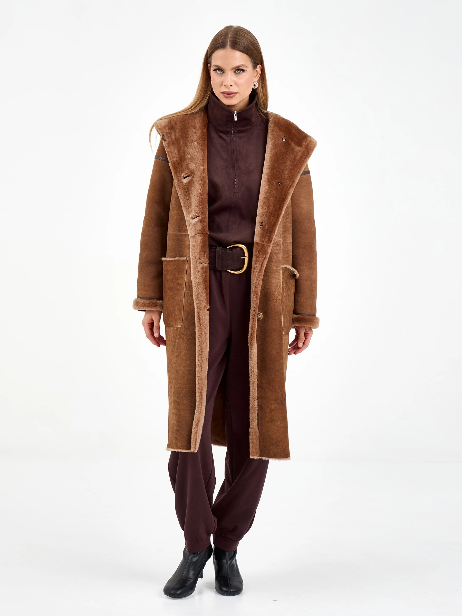 Товар длинная женская дубленка с капюшоном 2079, коричневая, размер 46, артикул 65120 выполнен из овчина "мерино" с застежкой пуговицы. Рассчитан на сезон: зима. Длина изделия 110 см, силуэт свободный.