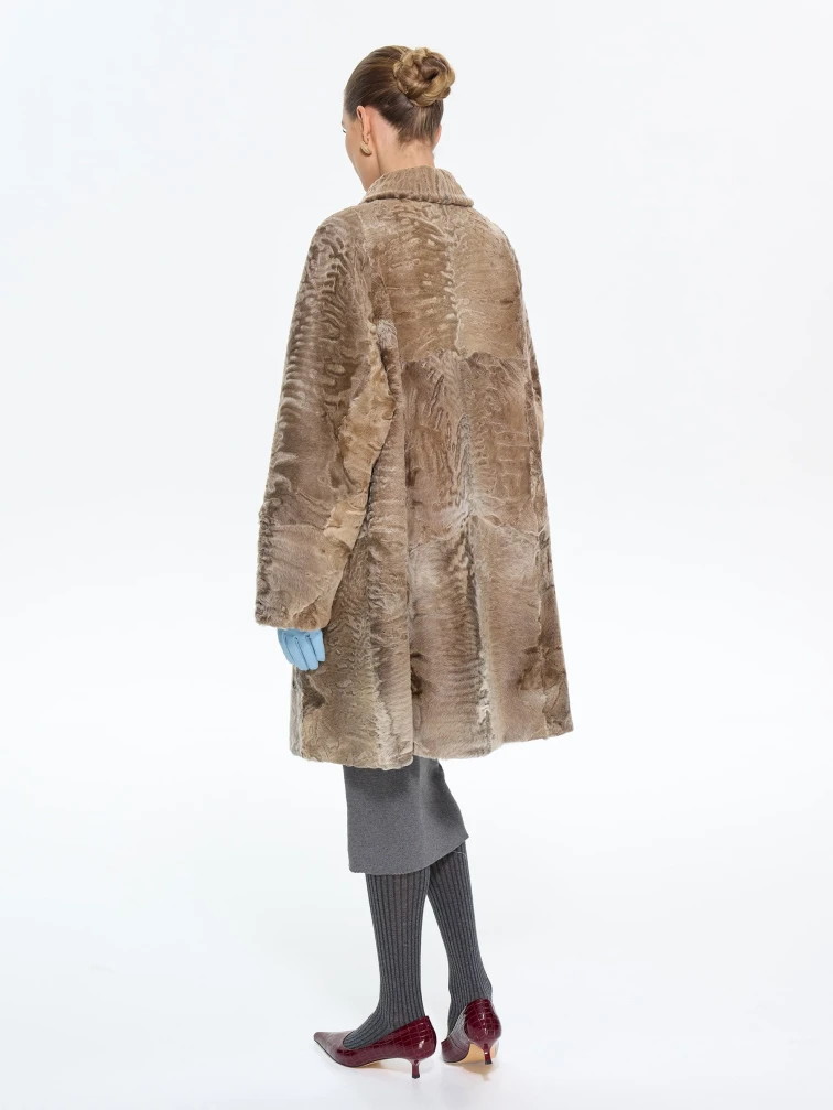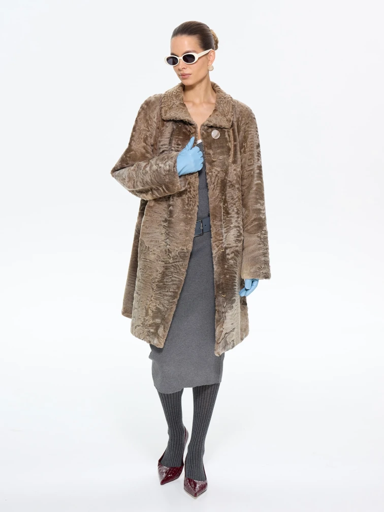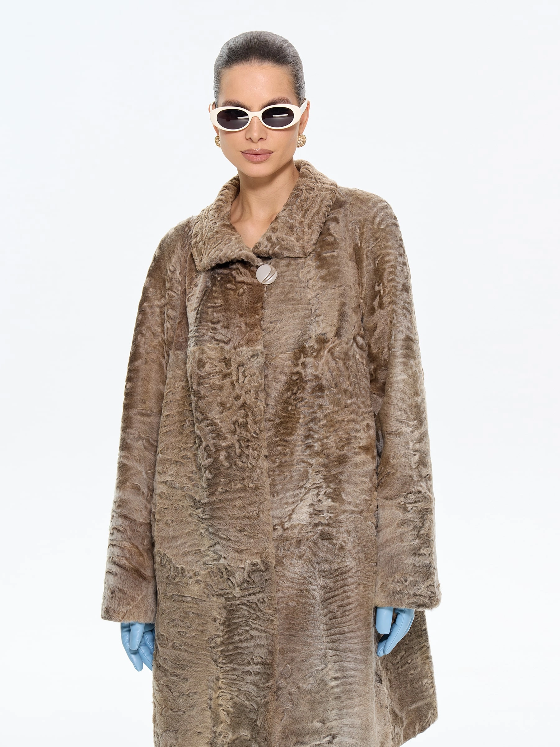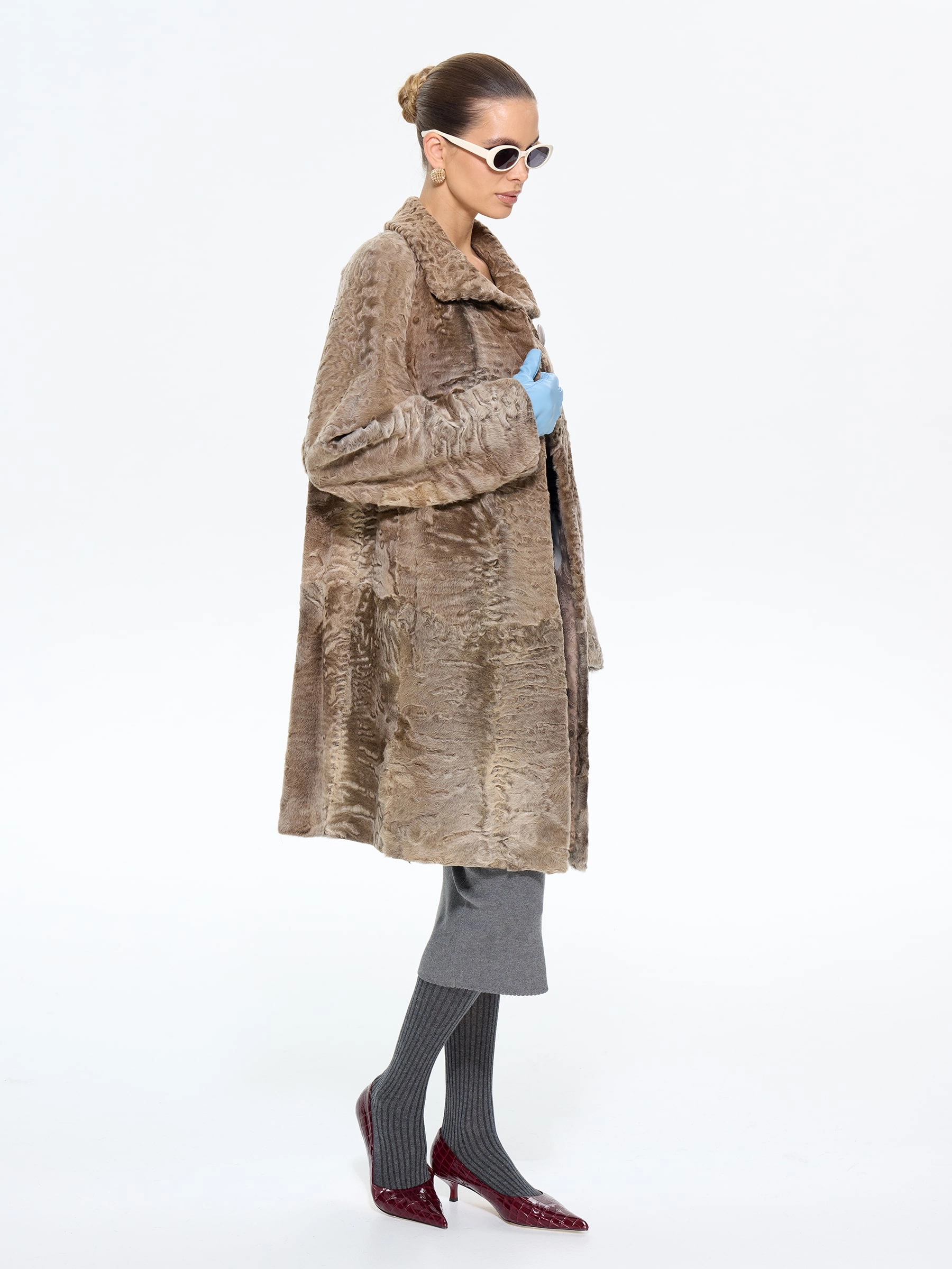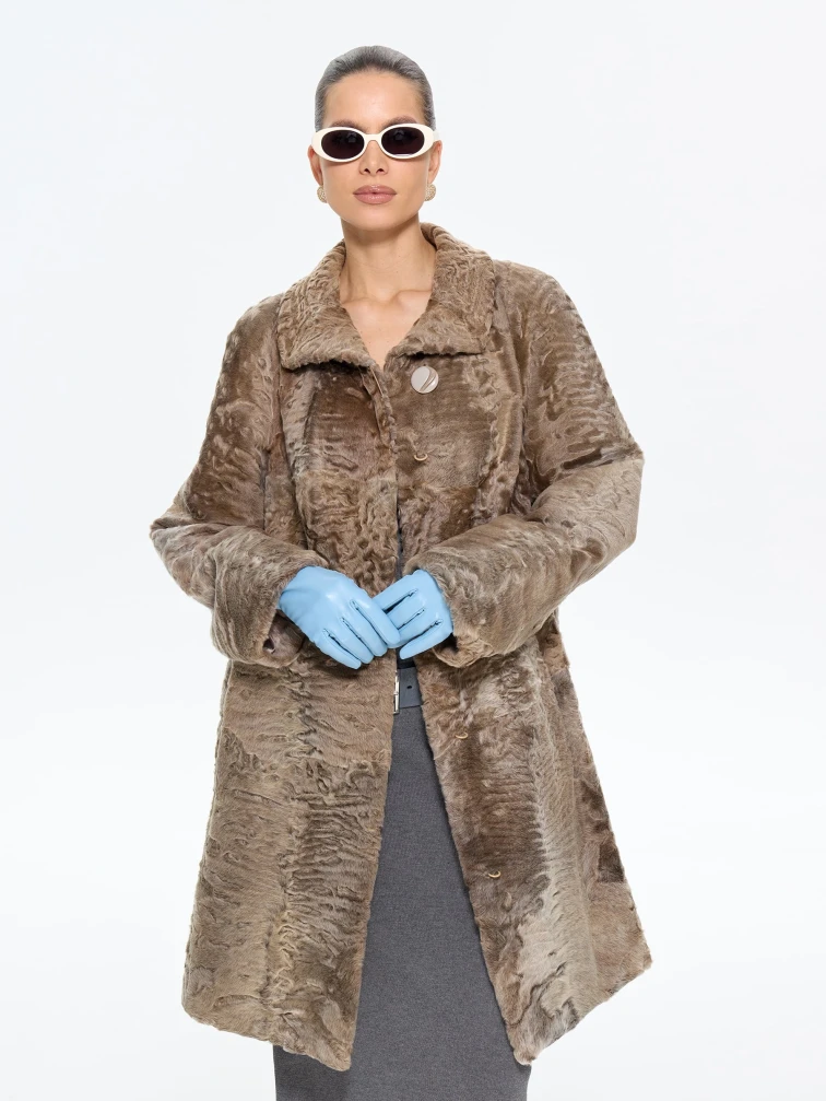 Изящная шуба из меха каракульчи премиум-класса в бежевом оттенке с элегантным воротником апаш. Модель с силуэтом легкая трапеция длиной 95 см создает утонченную элегантность и неповторимый шарм. Стилисты рекомендуют носить эту шубу с кожаными сапогами-челси и узкими джинсами, дополнив объемным свитером, или с платьем-миди и сапогами-ботфортами для вечернего образа. Завершите образ шелковым платком и структурированной сумкой - это идеальное воплощение вечной классики и современной элегантности.