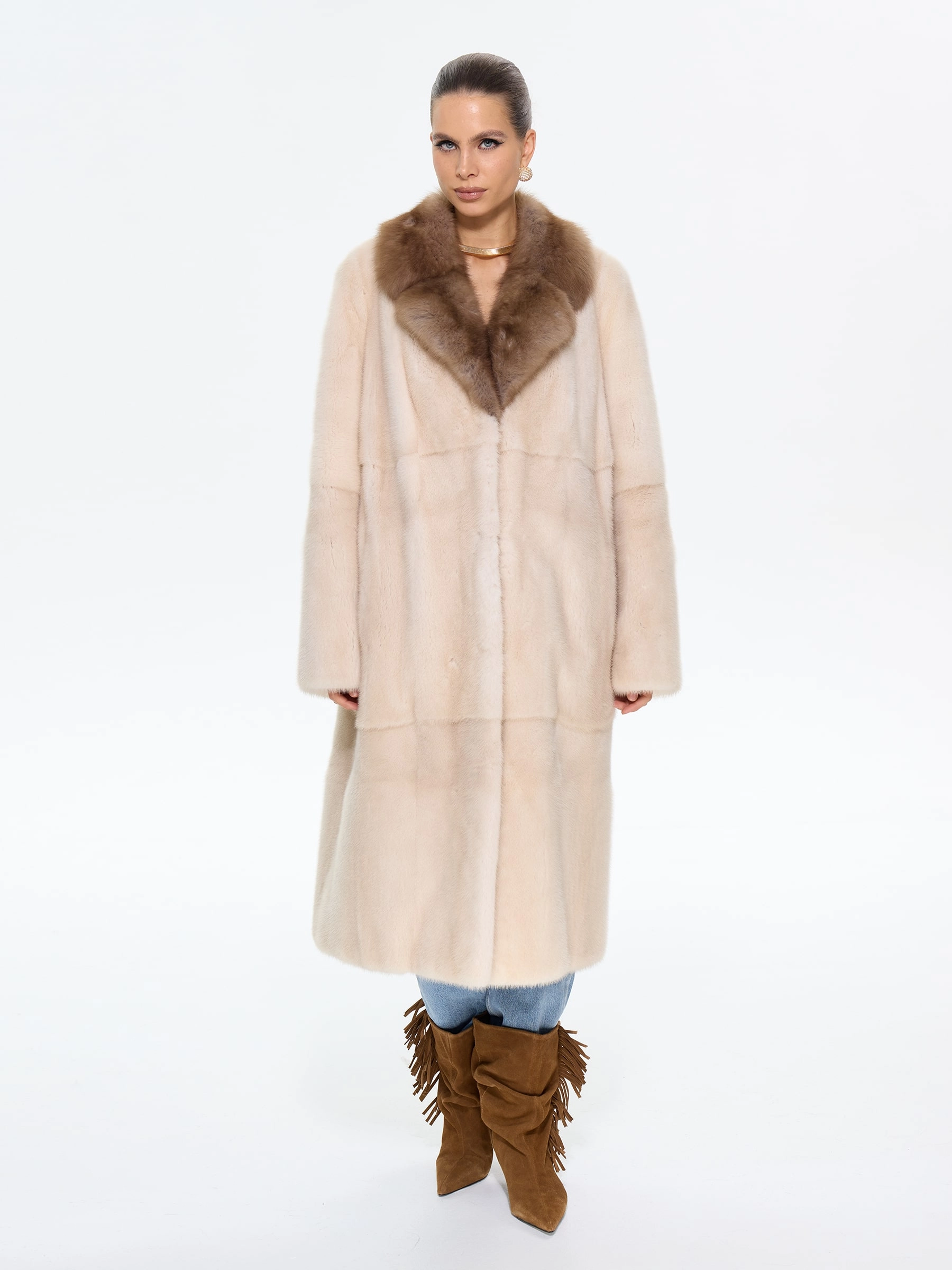 Изысканная длинная шуба из меха норки премиум-класса в белоснежном оттенке с элегантным английским воротником, отделанным ценным мехом соболя. Прямой силуэт длиной 108 см создает стройный вертикальный силуэт, подчеркивая аристократическую элегантность и зимний шарм. Стилисты рекомендуют носить эту модель с кожаными перчатками и сапогами до колена, дополнив сумочкой-портфелем, или с вязаной шапкой и утепленными ботильонами для повседневного образа. Белоснежная шуба из качественной норки с соболиной отделкой станет жемчужиной вашего гардероба, подчеркивая безупречный вкус в любой ситуации.