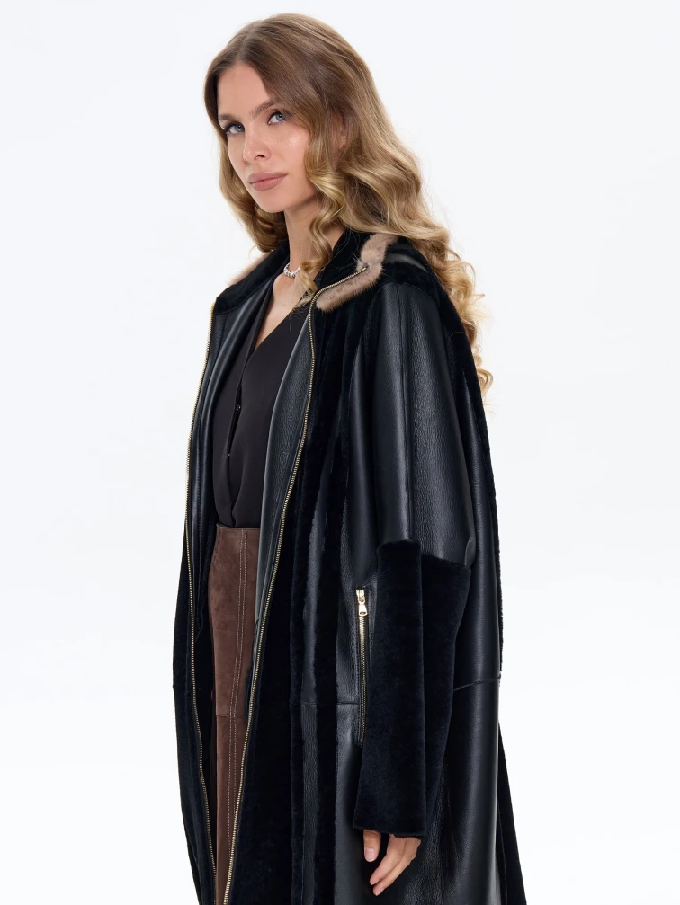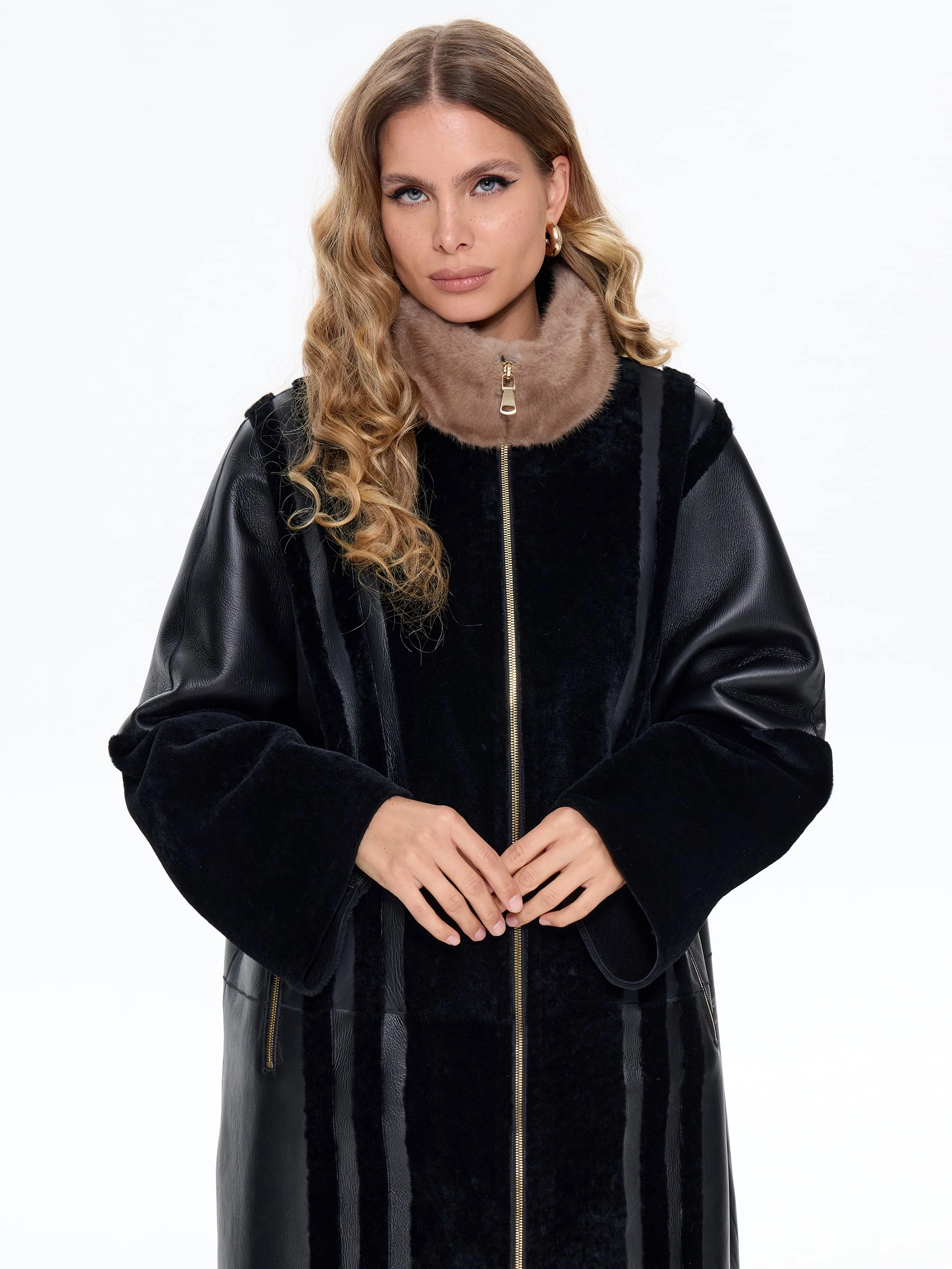 Товар женская дубленка на молнии с норковым воротником премиум класса 2040, черная, размер 46, артикул 63120 выполнен из овчина "мерино" с застежкой молния. Рассчитан на сезон: осень-зима. Длина изделия 110 см, силуэт прямой.