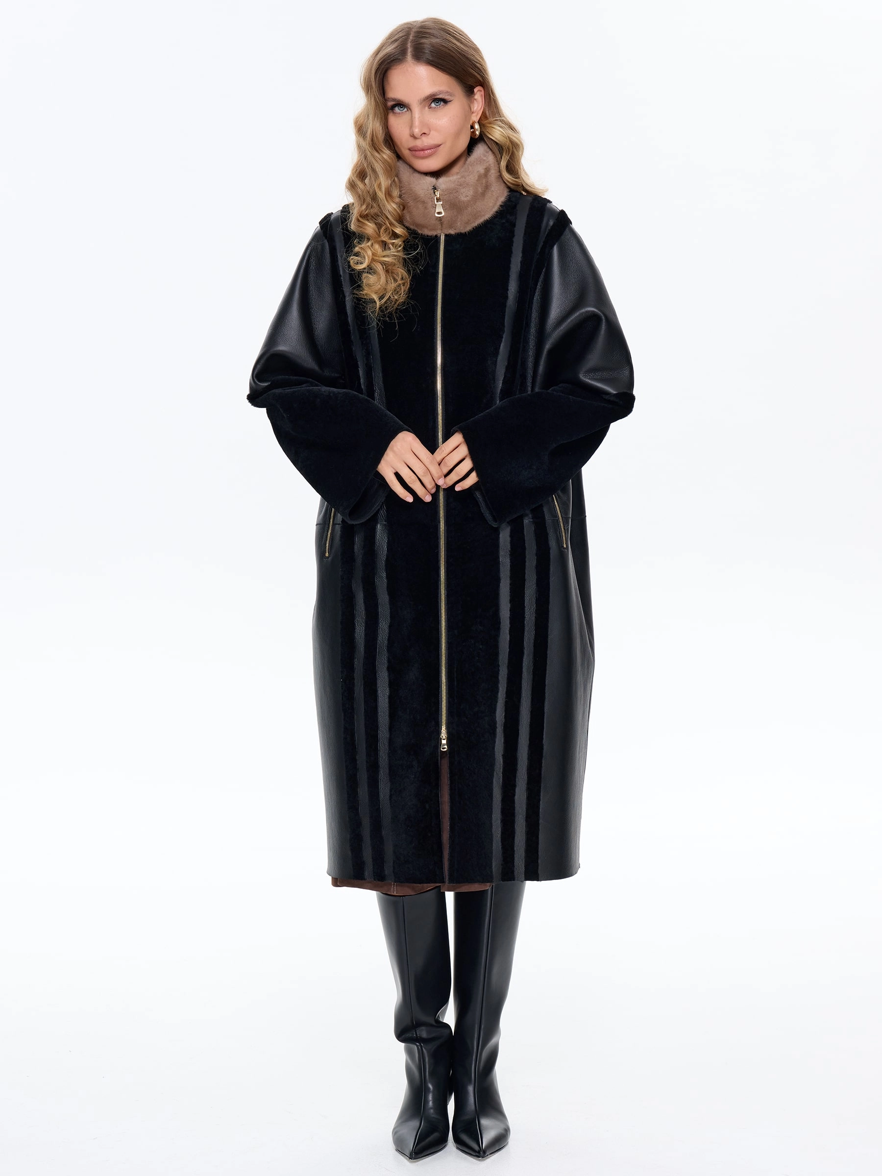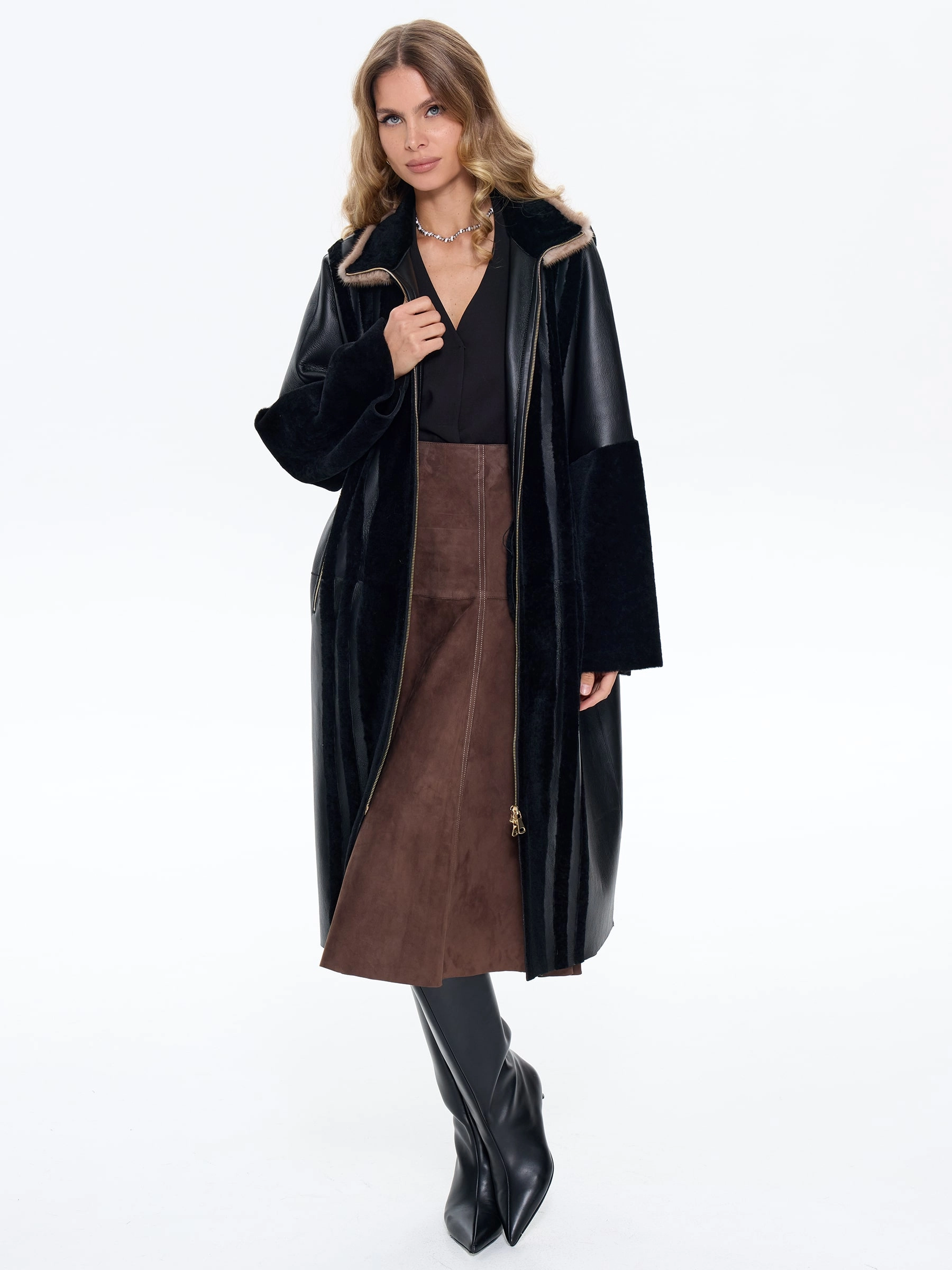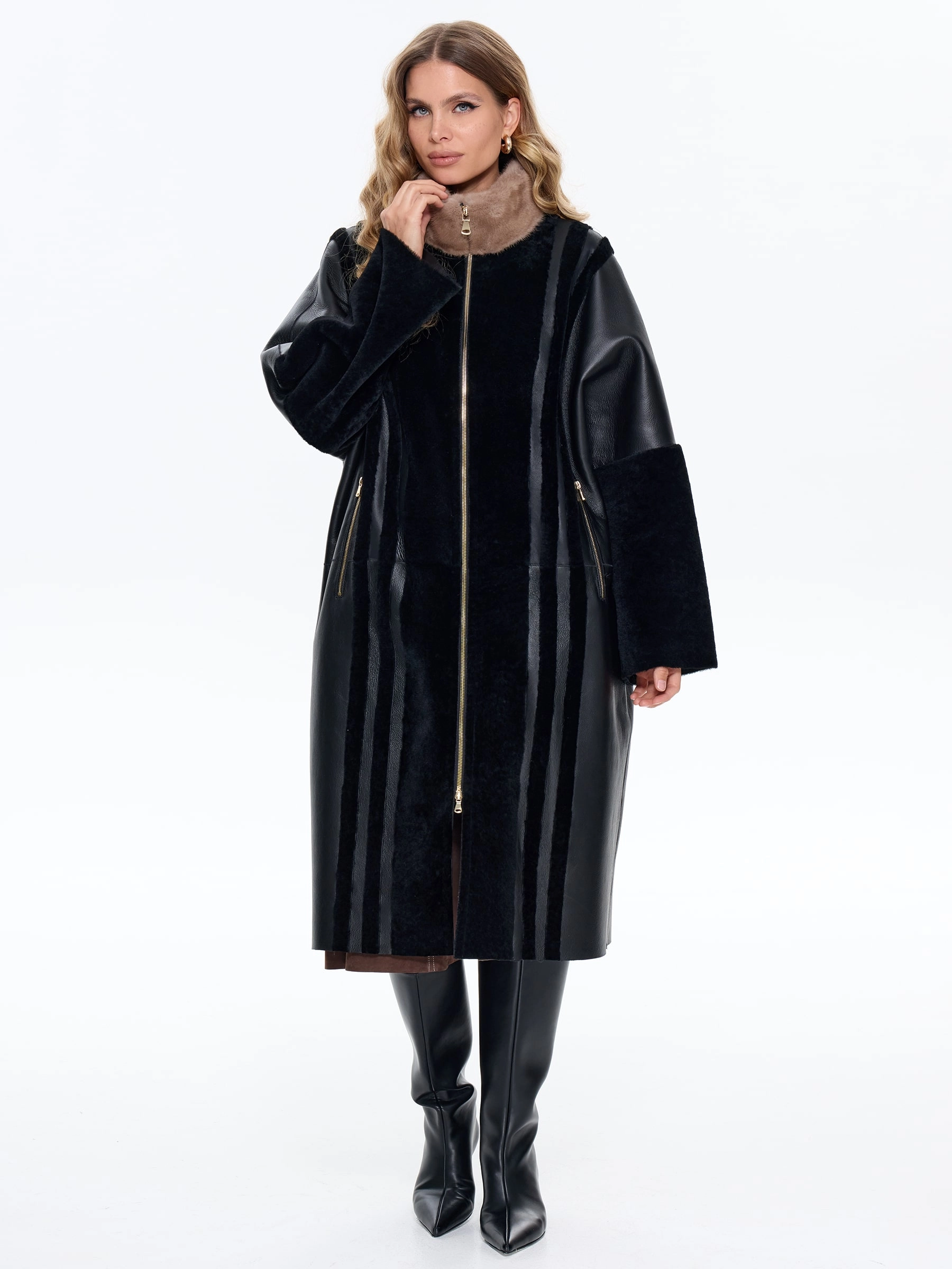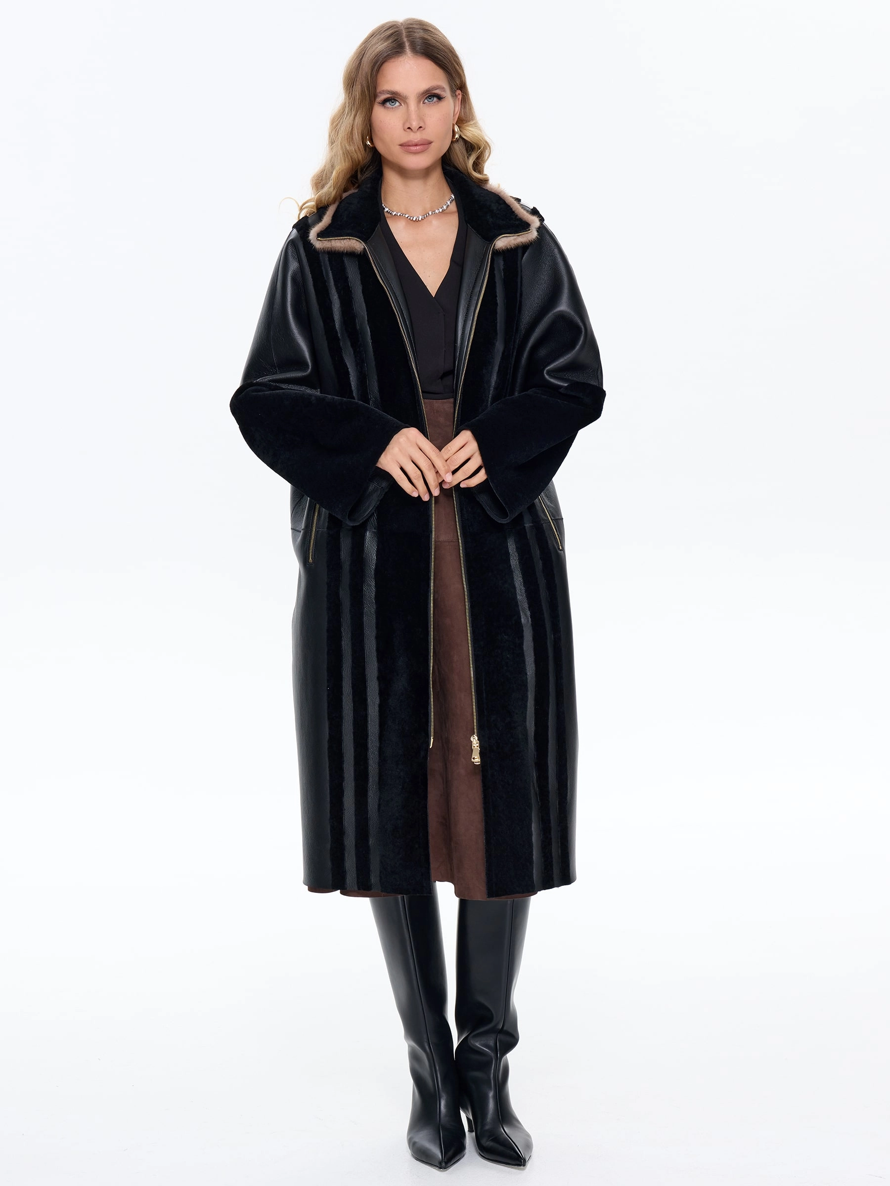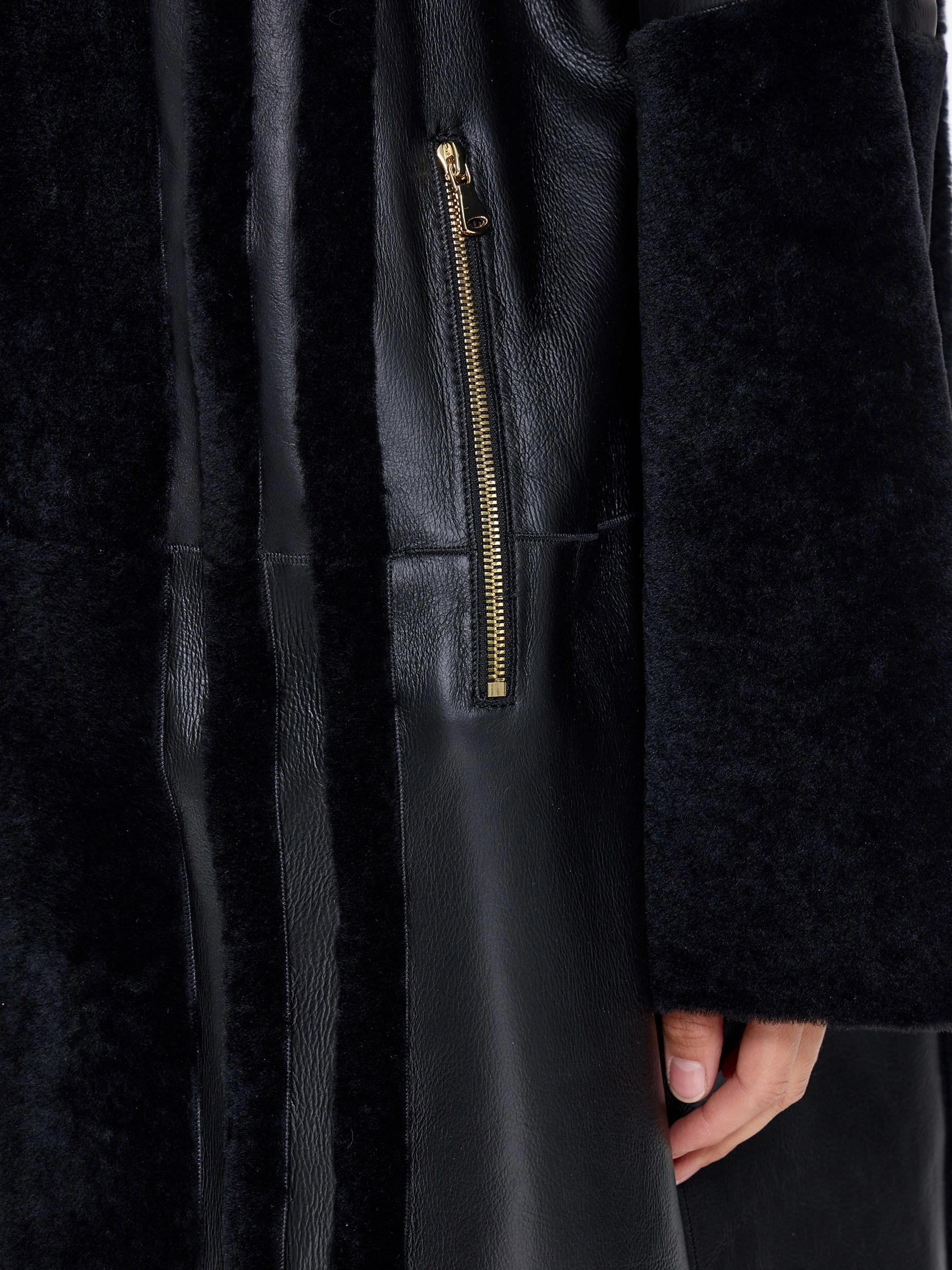 Очень лаконичная длинная дубленка в классическом черном цвете - прямое доказательство, что элегантной можно оставаться даже в холодные морозные дни. Модель свободного кроя выполнили из стриженной овчины с гладкой фактурой, для отделки использовали изнаночные бархатистые полосы. Дополнительной защитой от ветра послужил воротник-стойка из нежной пушистой норки. Два боковых кармана, как и само изделие застегиваются крупными молниями в цвете-золото.