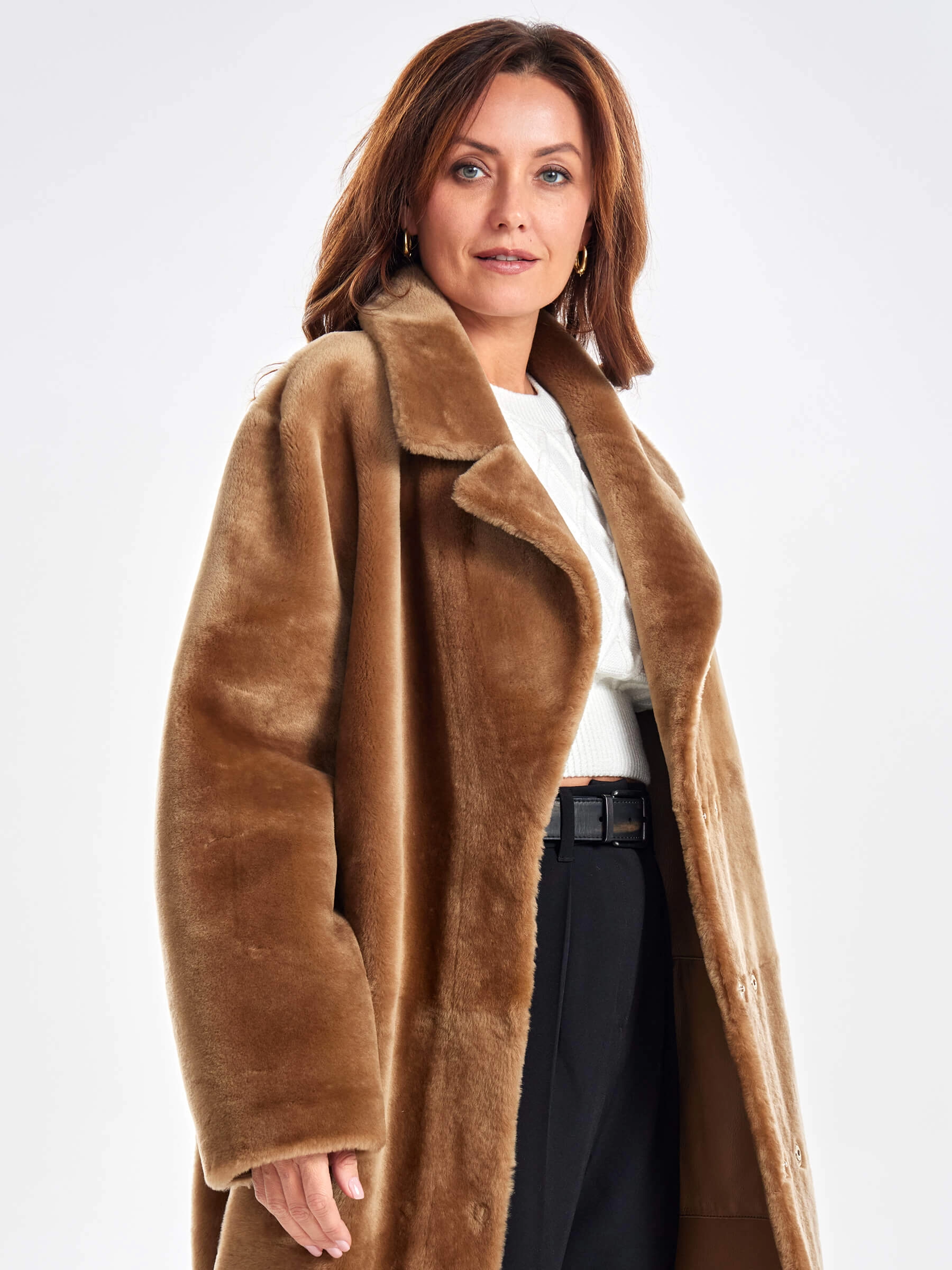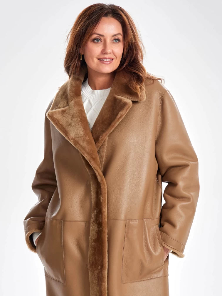 Пальто из овчины коричневого цвета прямого кроя с английским воротником. Застежка-кнопки. Модель дополнили двумя большими карманами. Просто и элегантно. Длинный кожаный пояс сформирует приталенный силуэт.
