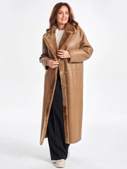 Товар двустороннее женское пальто из меховой овчины премиум класса 2030, коричневое, размер 44, артикул 63290 выполнен из овчина "мерино" с застежкой кнопки. Рассчитан на сезон: осень-зима. Длина изделия 125 см, силуэт прямой.
