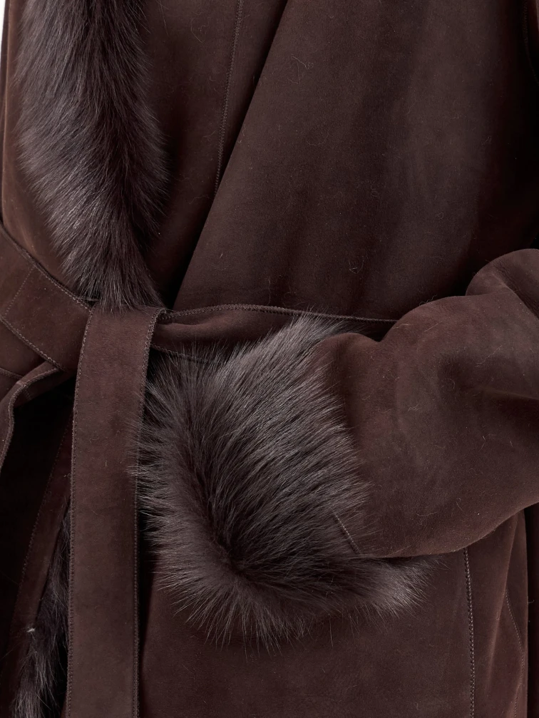 Эта длинная дубленка из натуральной овчины без капюшона воплощает современную классику. Свободный силуэт и запах, фиксируемый поясом, дарят комфорт и универсальность. Благодаря роскошной тосканской овчине и шалевидному воротнику модель выглядит по-настоящему дорого. Для создания законченного образа наденьте ее с водолазкой, кожаными брюками и уггами — это идеальный ансамбль для города в холодные дни.