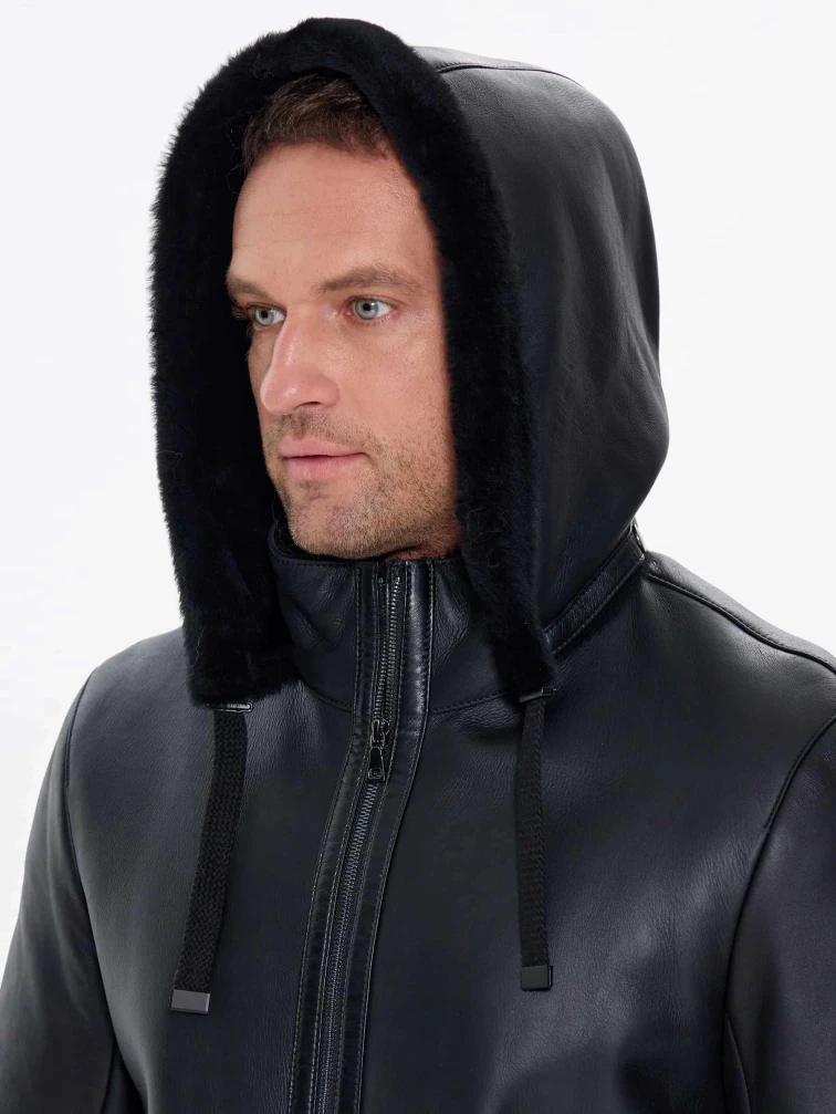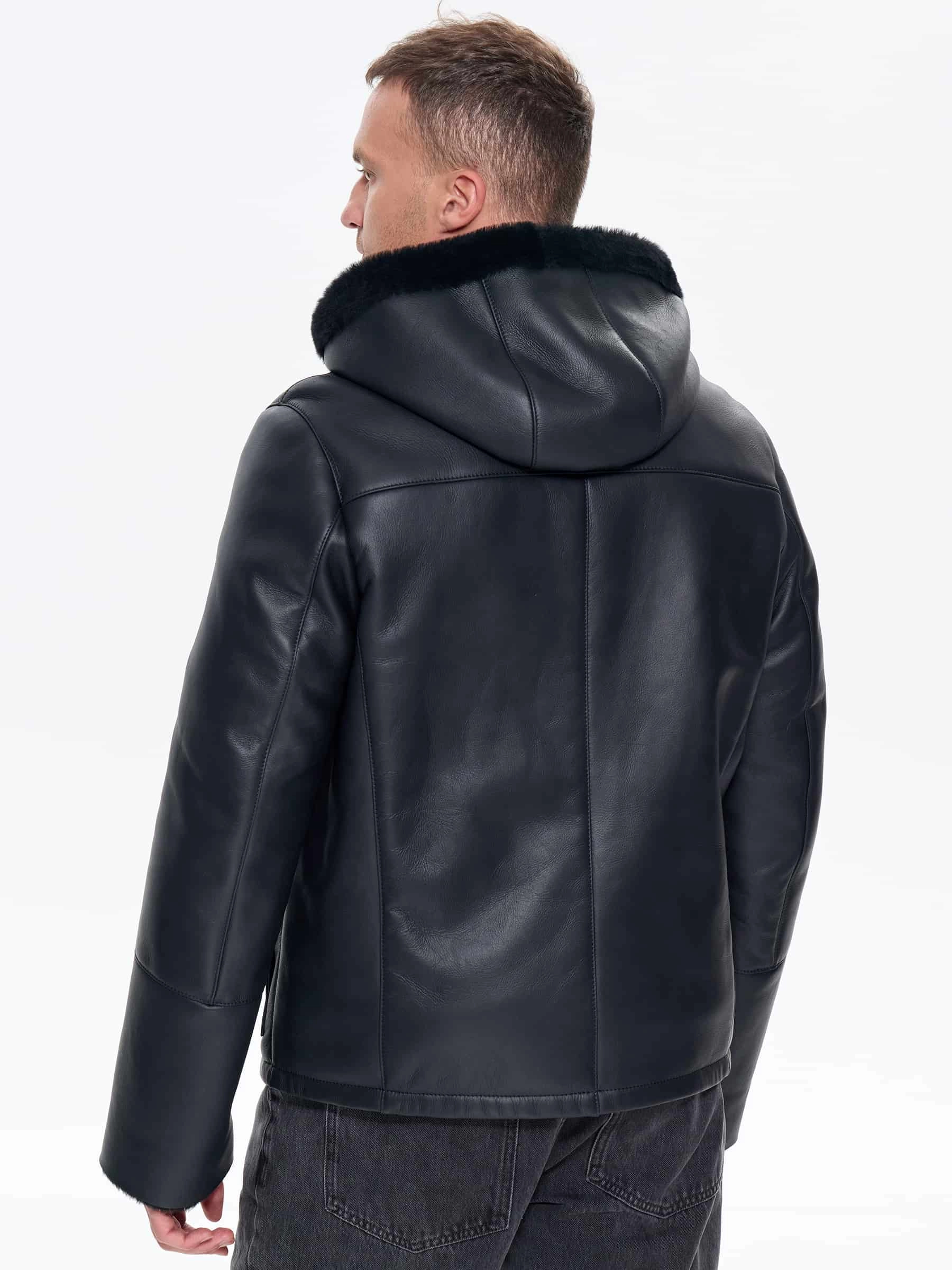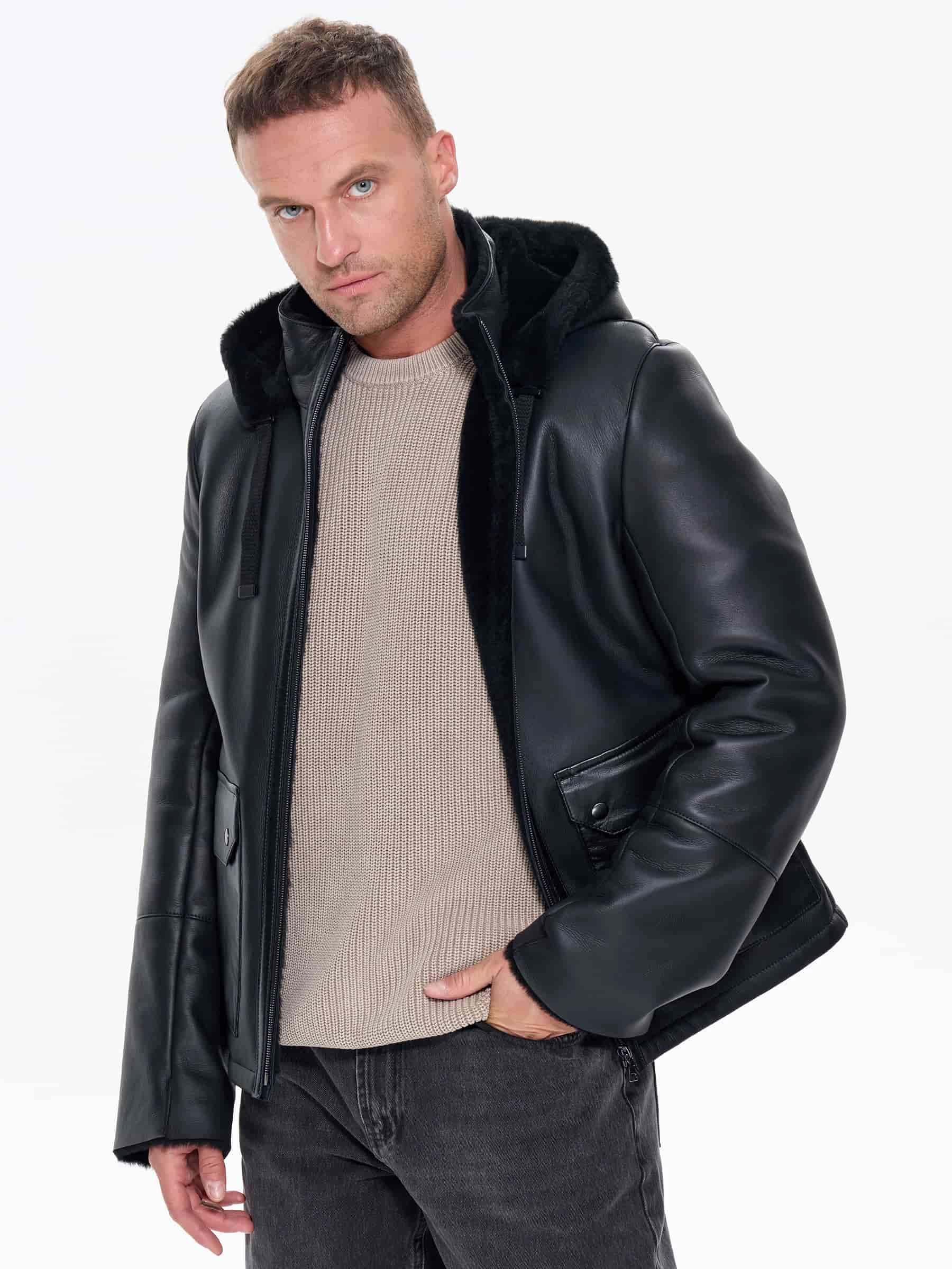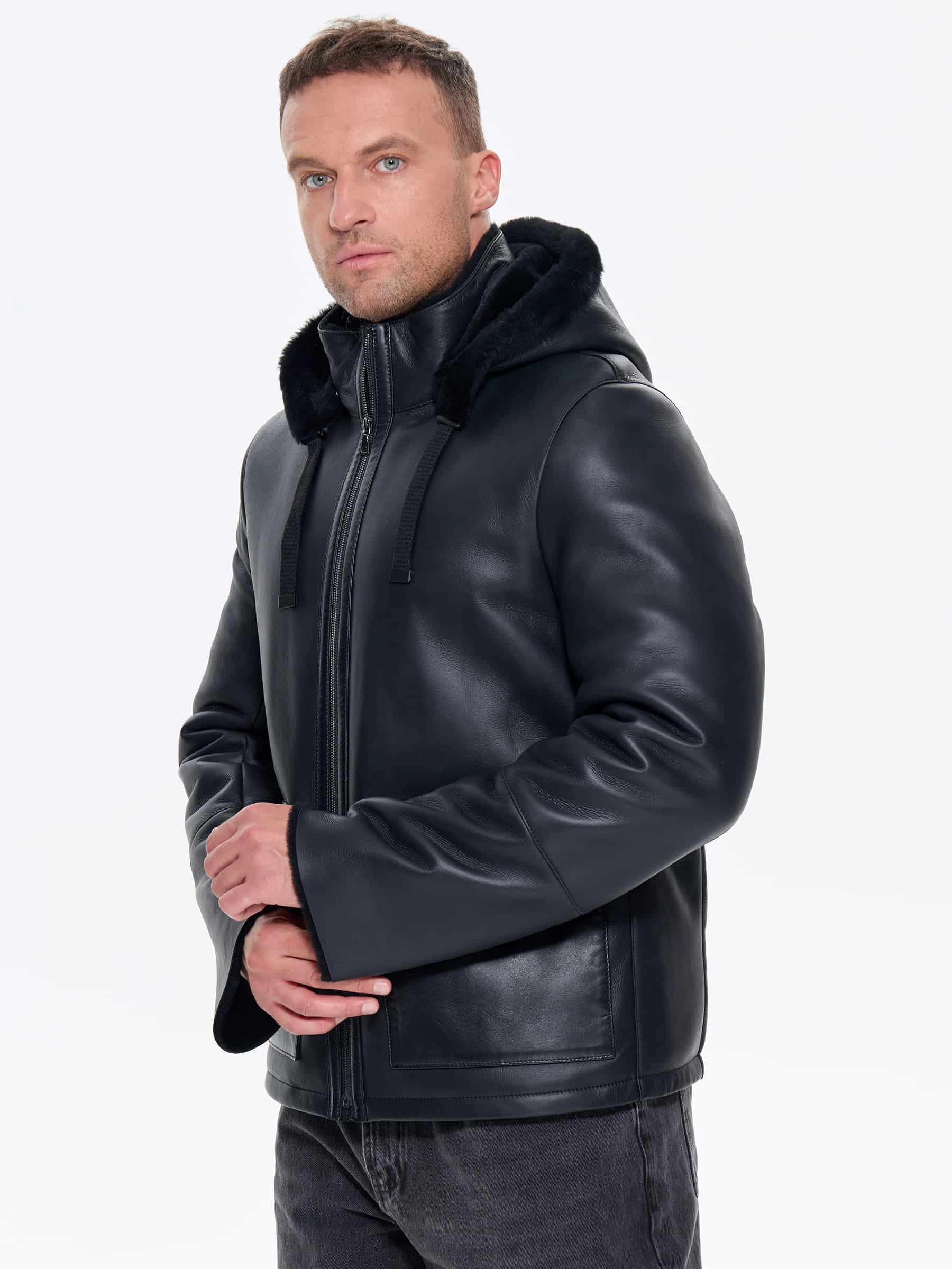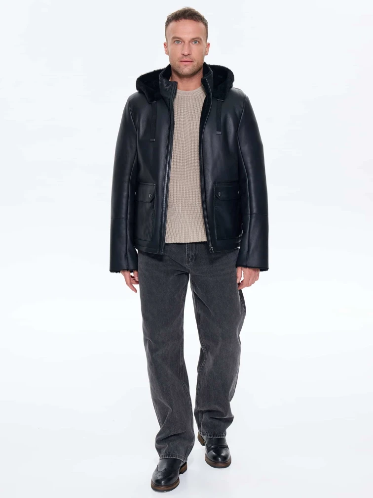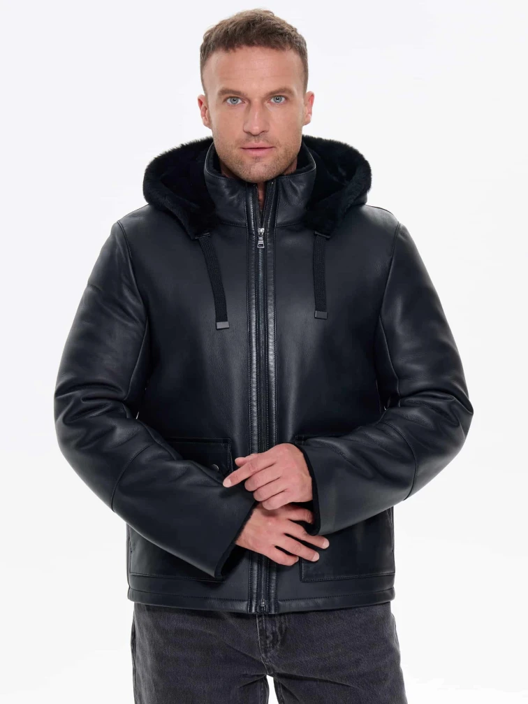 Короткая мужская дубленка с капюшоном премиум класса 441, черная, размер 50, артикул 41230