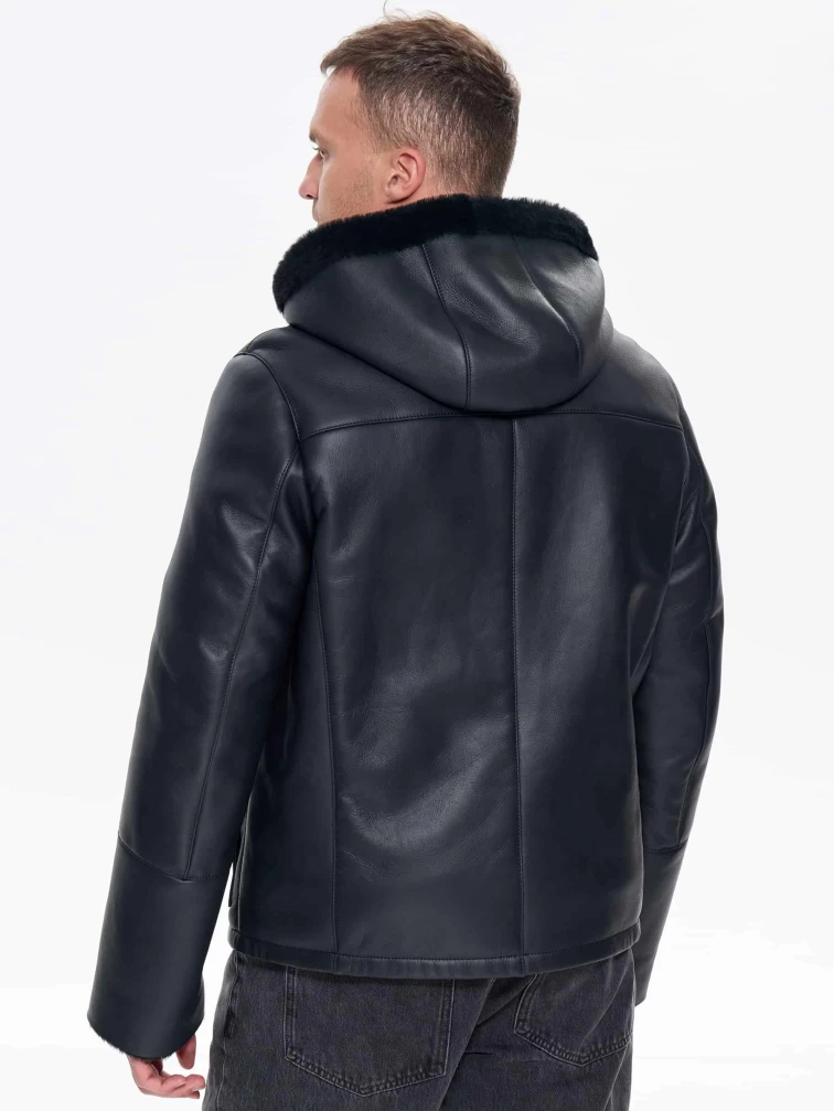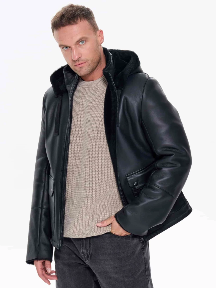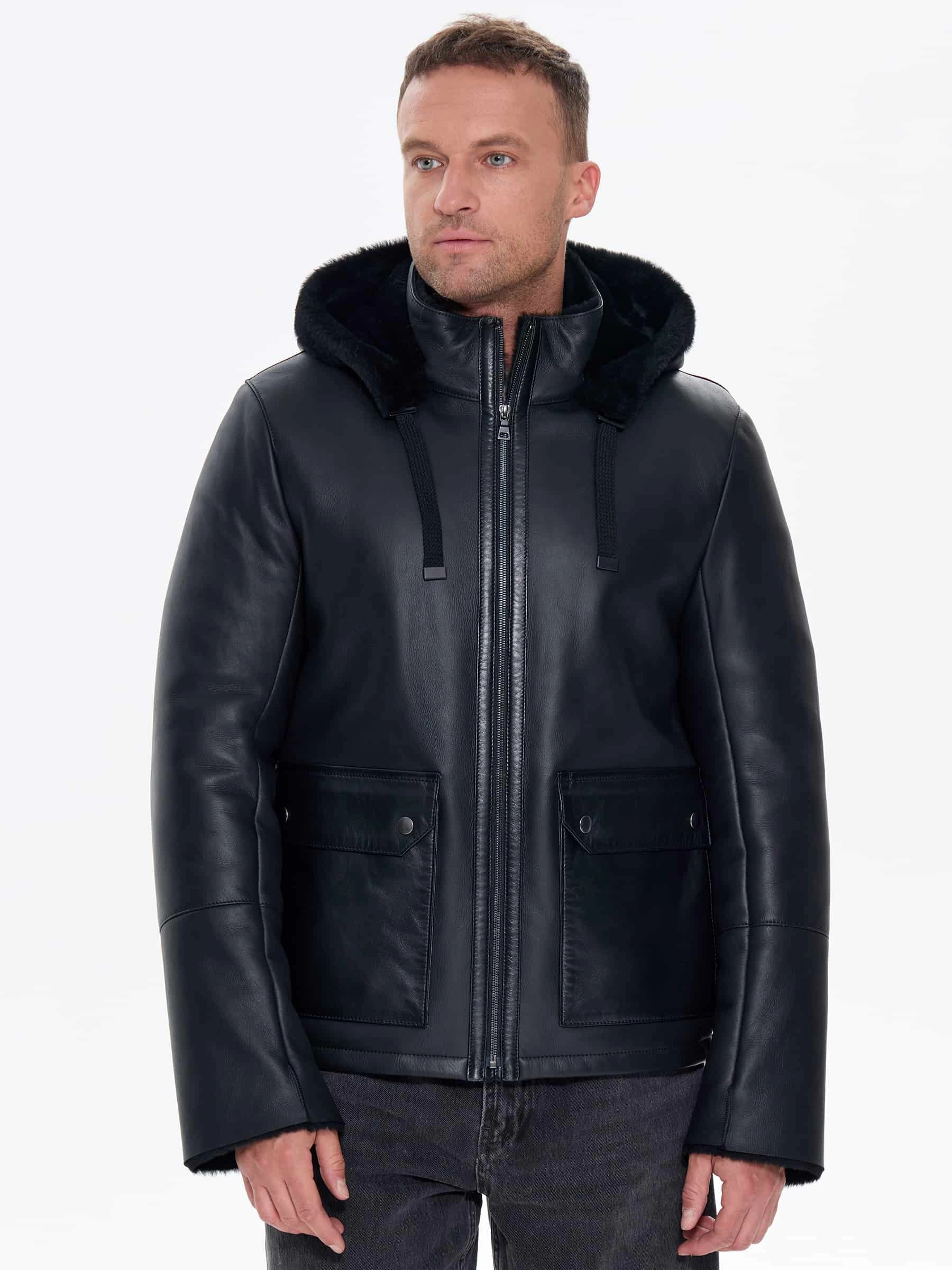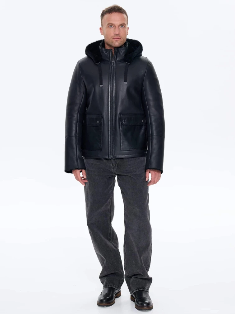 Товар короткая мужская дубленка с капюшоном премиум класса 441, черная, размер 50, артикул 41230 выполнен из овчина "мерино" с застежкой молния. Рассчитан на сезон: зима. Длина изделия 68 см, силуэт прямой.