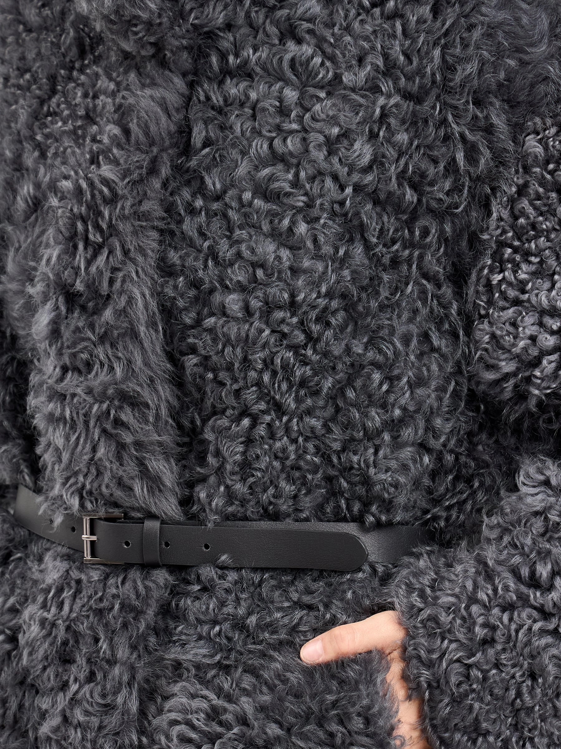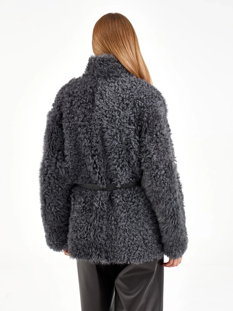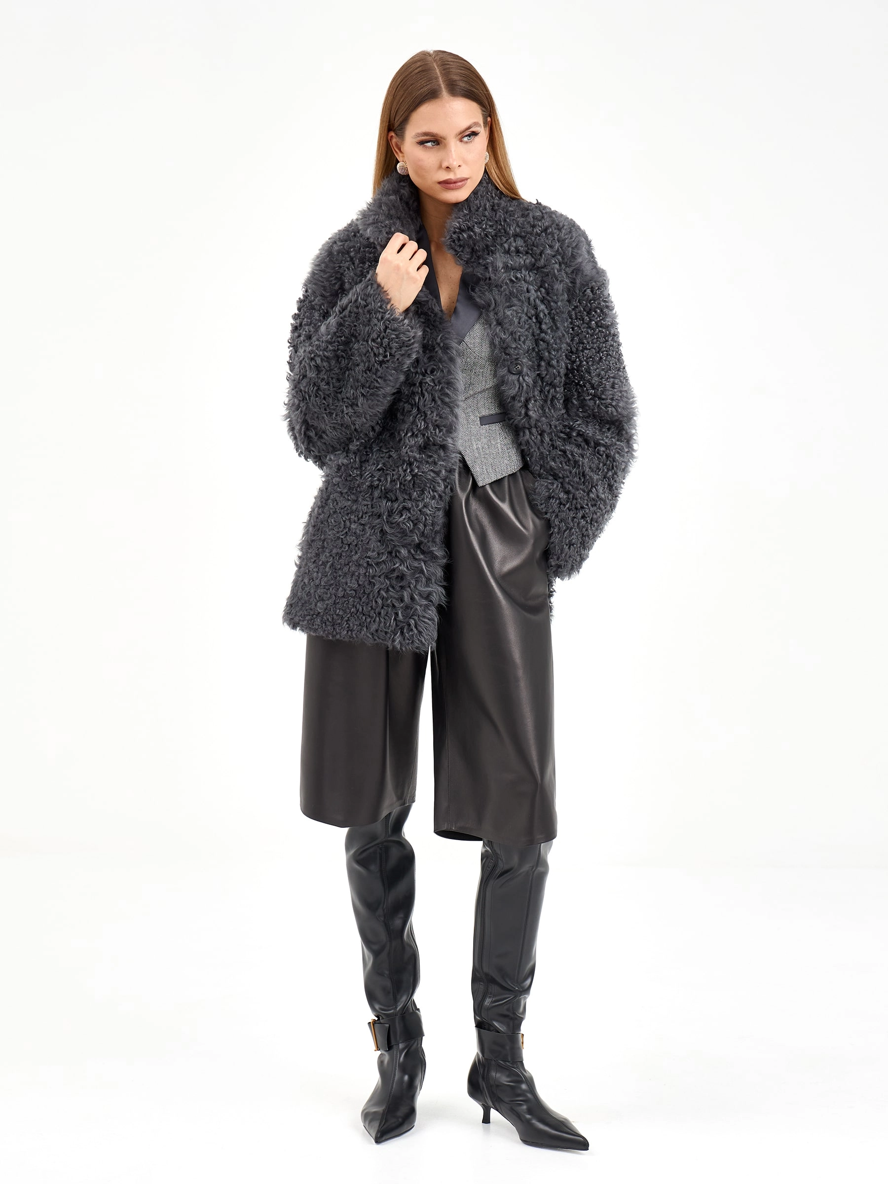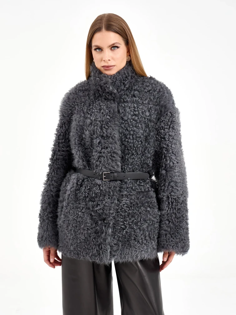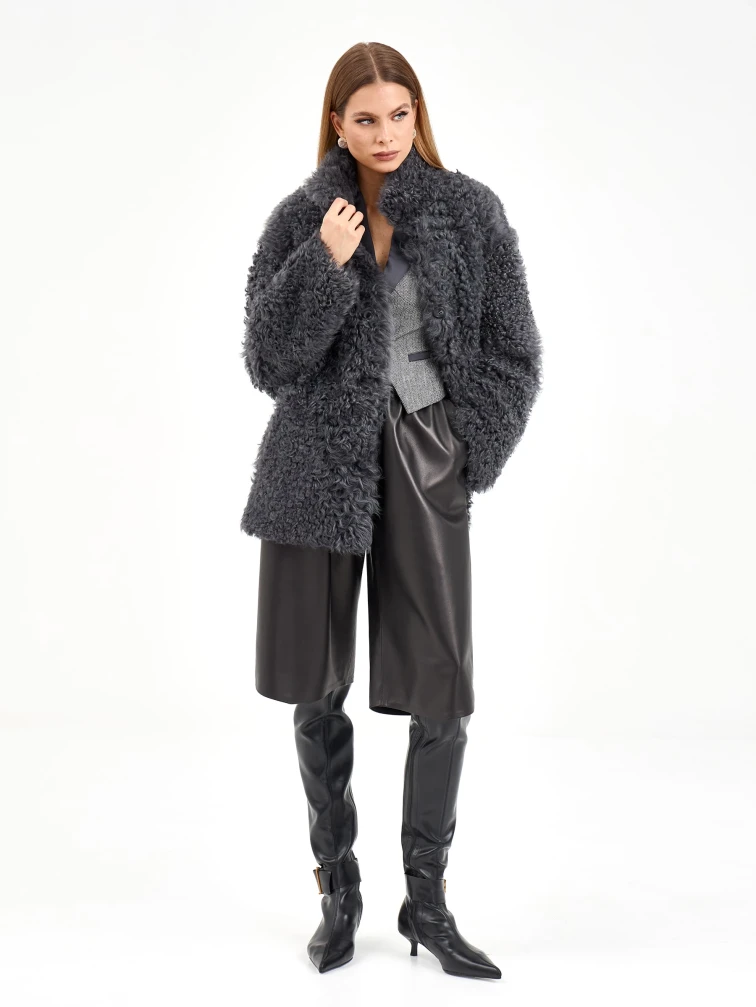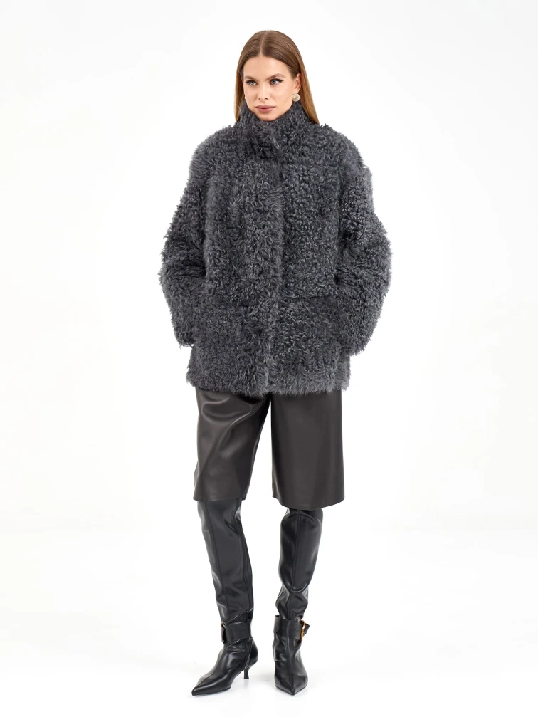 Короткая дубленка из натуральной овчины «Тиградо» с выразительной текстурой крупного завитка. Эта модель не для скромных! Свободный силуэт, спущенный рукав и воротник-стойка создают образ с характером. Совет стилиста: наденьте с кожаными брюками и грубыми ботинками для уличного шика или с однотонным платьем и сапогами-челси для контраста фактур.