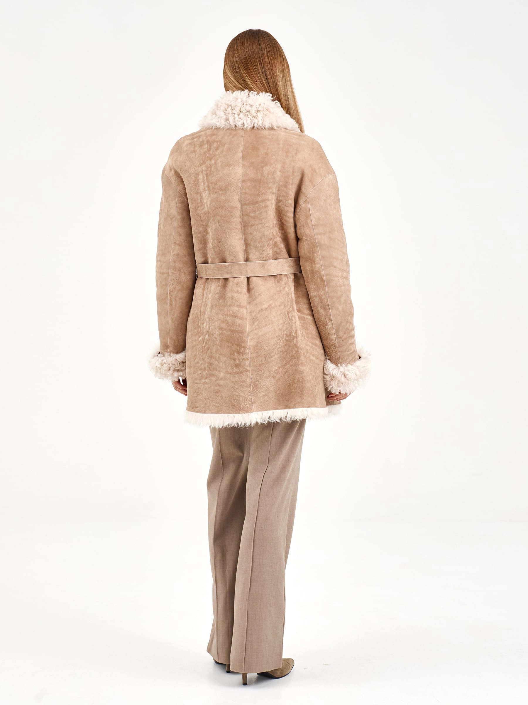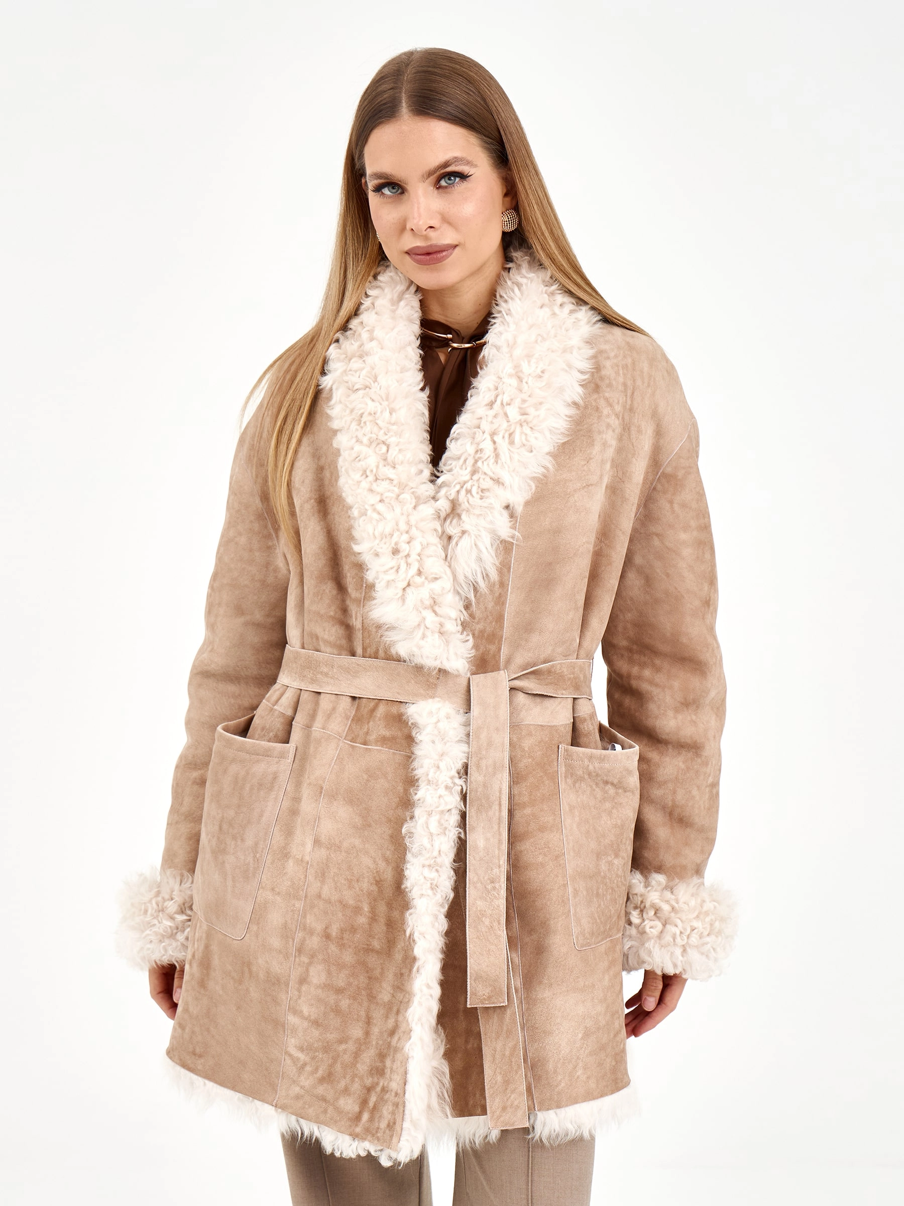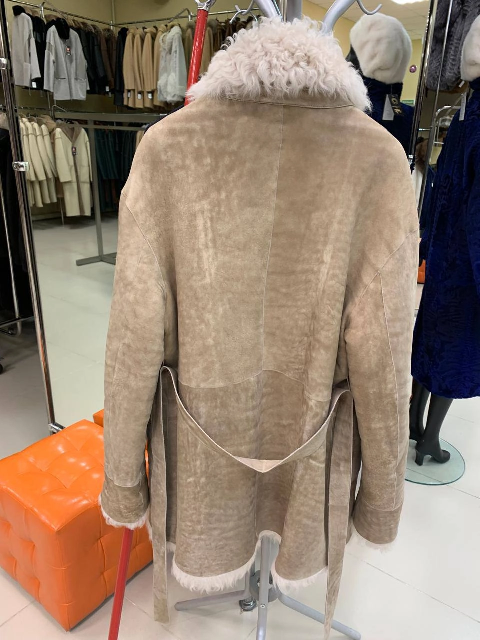 Товар короткая женская дубленка из тиградо 2078, бежевая, размер 44, артикул 65270. Длина изделия 80 см.