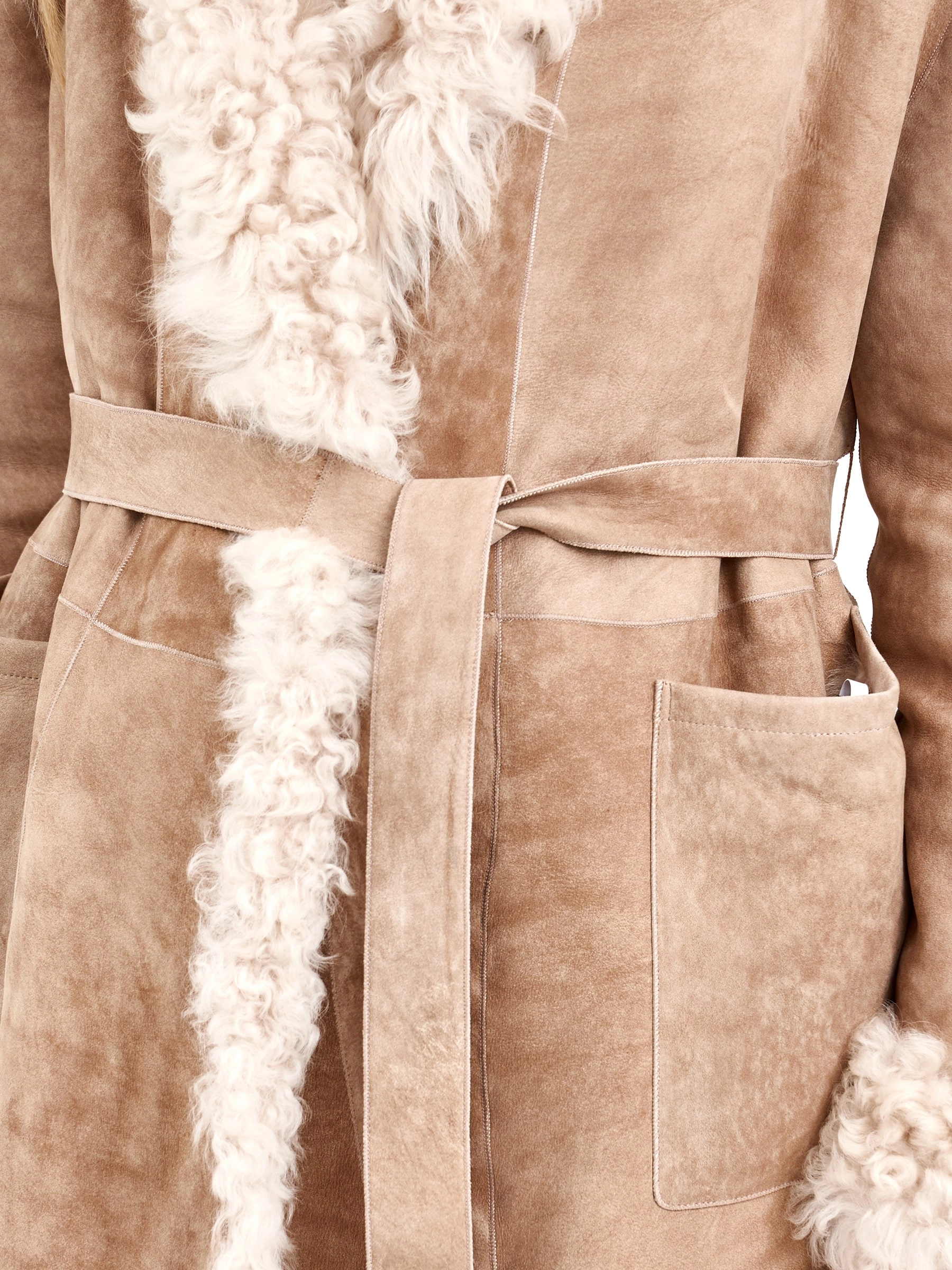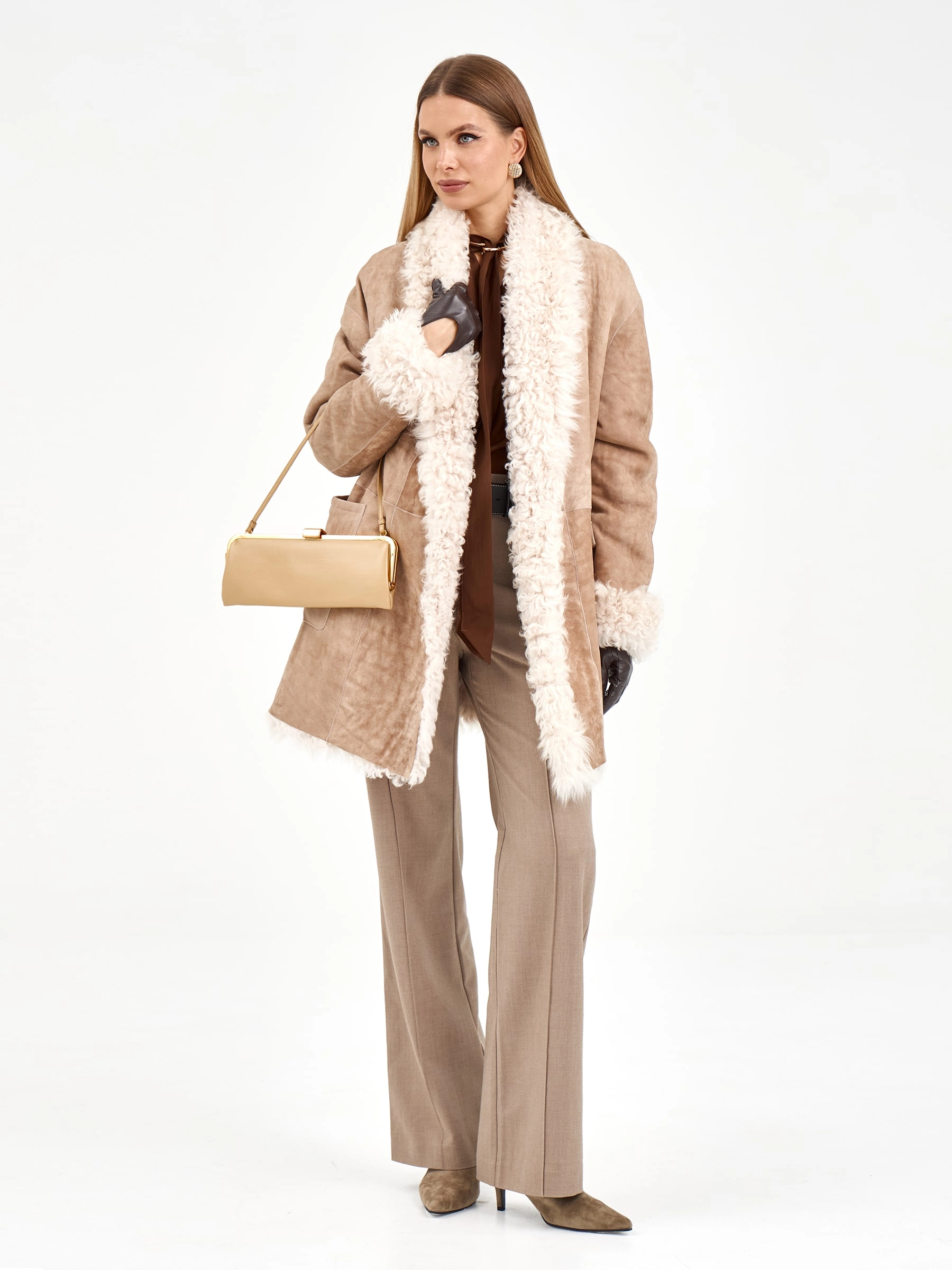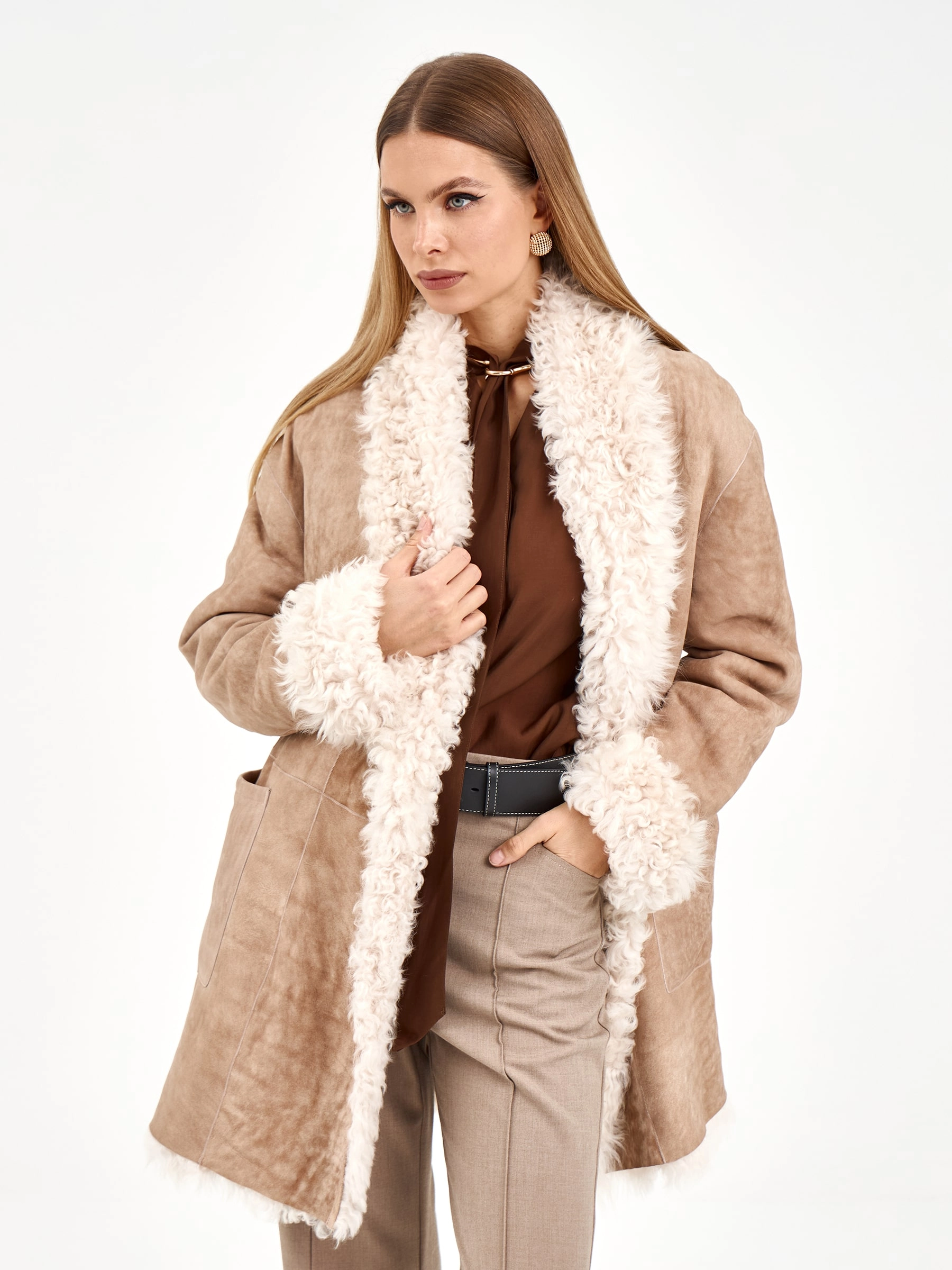 Товар короткая женская дубленка из тиградо 2078, бежевая, размер 44, артикул 65270. Длина изделия 80 см.