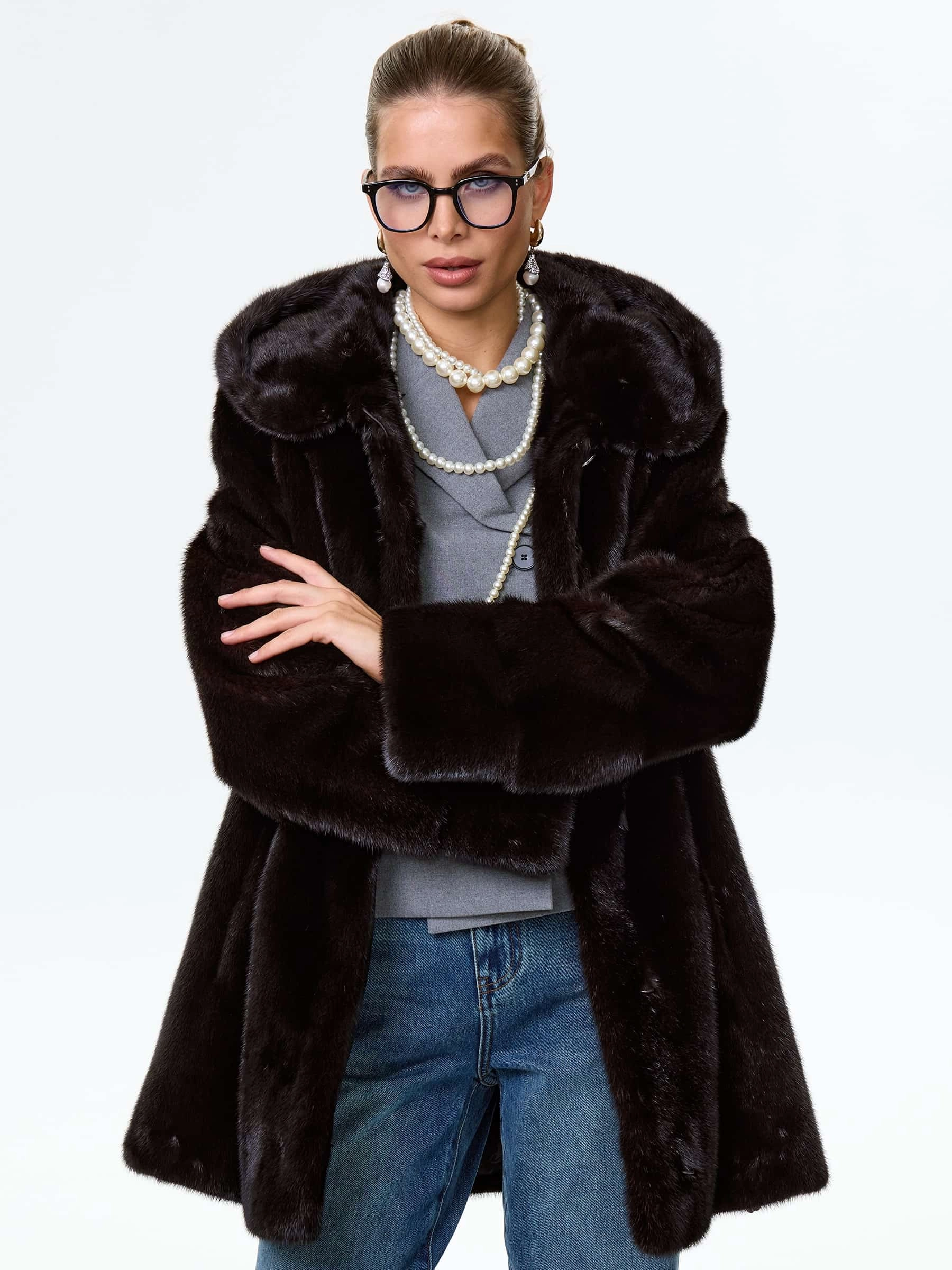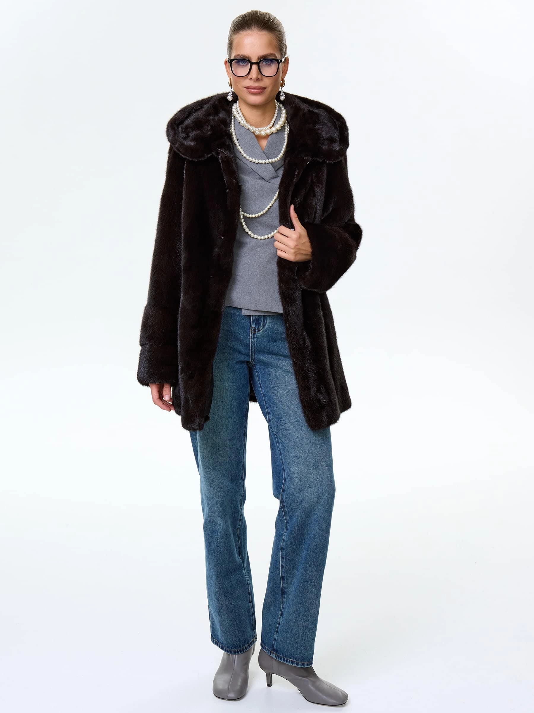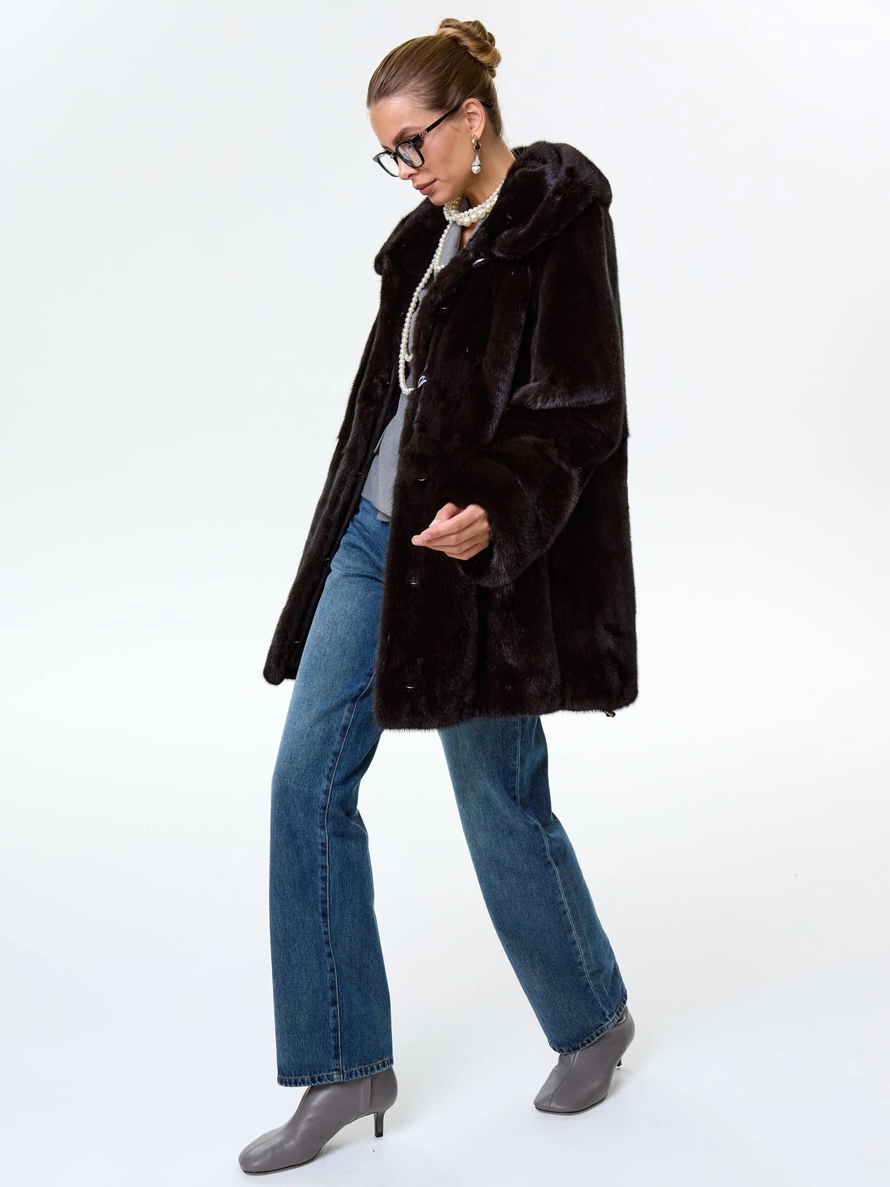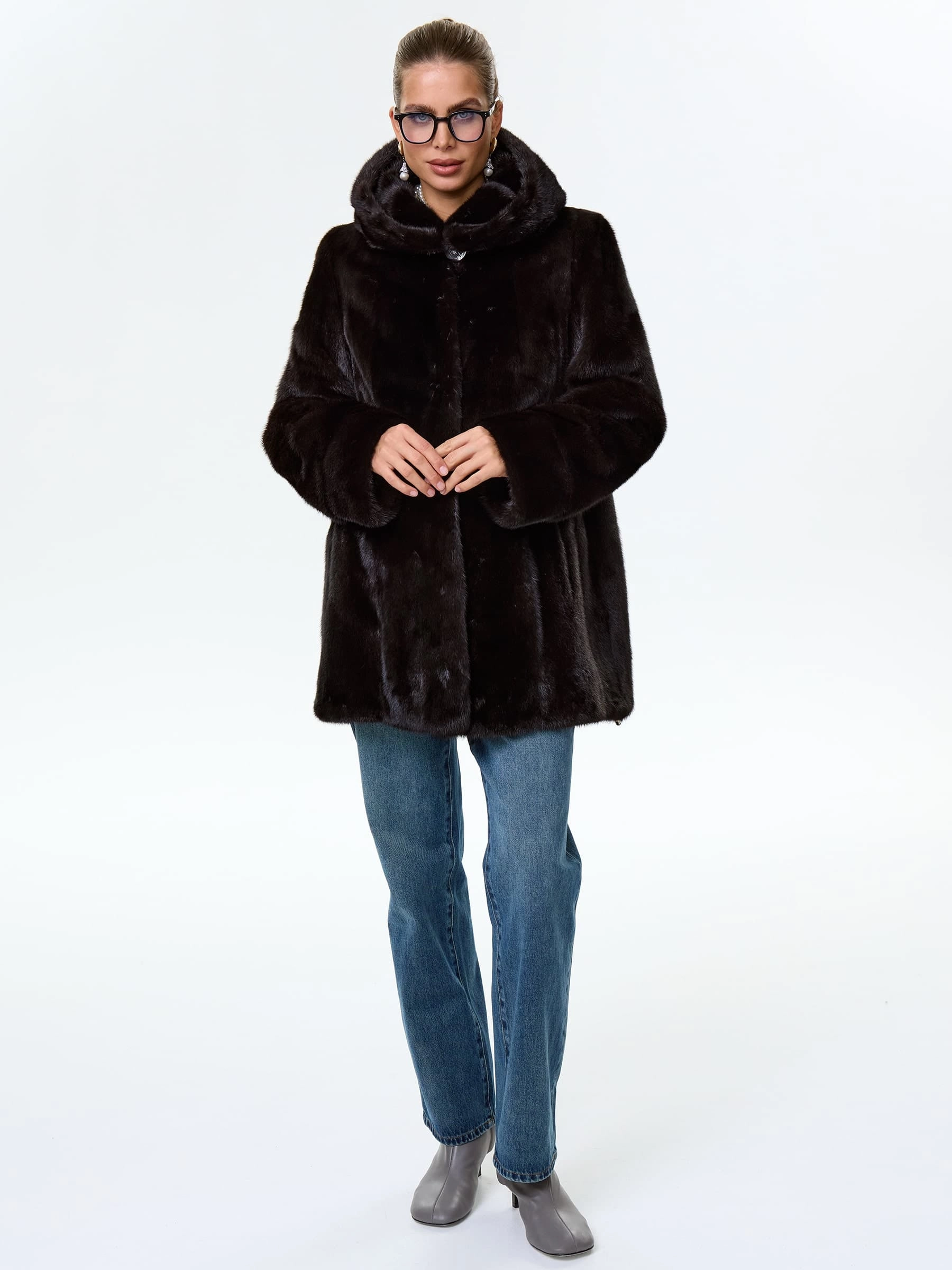 Укороченную шубку с глубоким капюшоном выполнили из густого шелковистого меха норки. Прямой крой, два врезных боковых кармана. Внутренние кулиски дают возможность эксперементировать с изделием изменив силуэт.Застежка клипсы. Классическая модель одинаково гармонично смотреться как с любыми брюками, платьем или длинной юбкой.