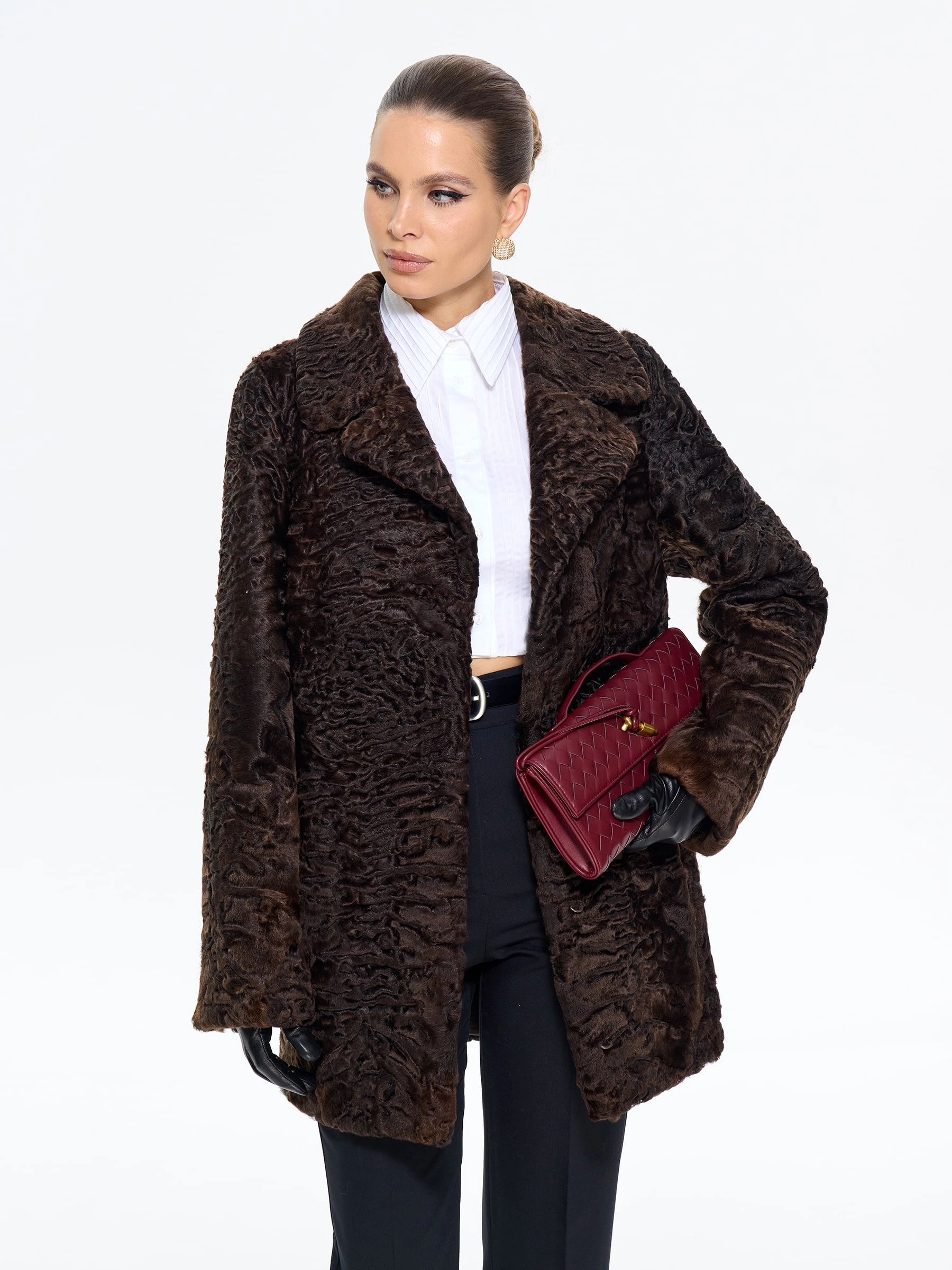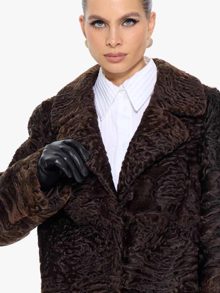 Элегантная шуба из меха каракульчи премиум-класса с английским воротником прямого силуэта. Классическая длина 80 см и втачной рукав создают утонченный образ, который дополнит кожаными перчатками и сапогами-челси для повседневной элегантности или с платьем-футляром для вечернего выхода. Эта модель — воплощение вечного шарма и аристократического стиля в коричневом оттенке.