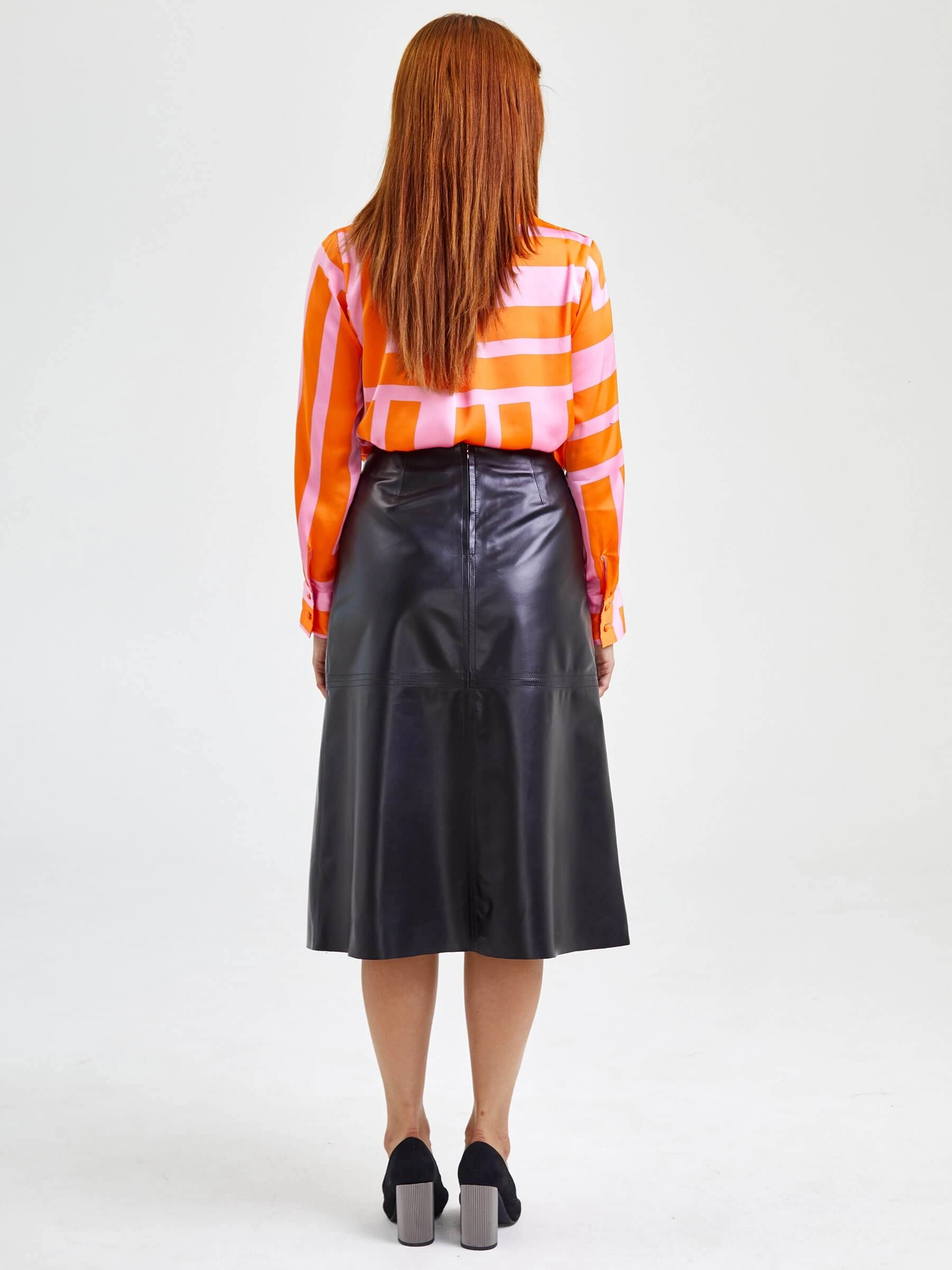 Юбка-миди из натуральной чёрной кожи воплощает эталон элегантности и итальянское качество. Глубокий насыщенный чёрный цвет с благородным матовым блеском подчёркивает премиальную фактуру кожи, которая идеально облегает фигуру. Расклешённый крой А-силуэта создаёт женственный силуэт — длина 76 см обеспечивает идеальный баланс, прикрывая колени и открывая щиколотки. Удлинённая линия пояса мягко корректирует талию, а боковая молния сохраняет чистоту линий. Сочетайте с белоснежной блузой для офиса, с объёмным свитером для города или с атласным топом для вечера — эта чёрная кожаная юбка станет универсальной основой гардероба на все сезоны, подчёркивая ваш безупречный вкус и статус.