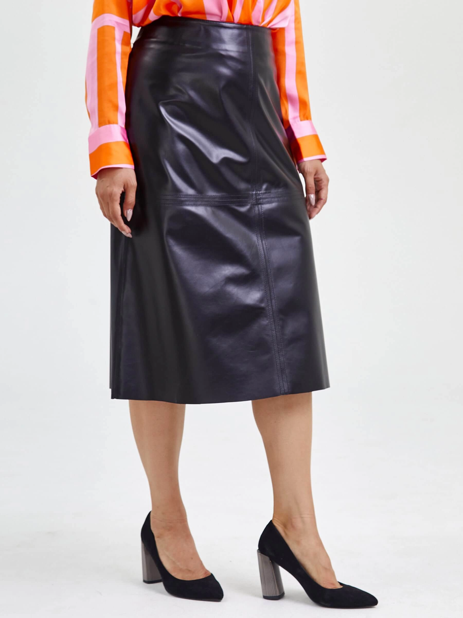 Товар кожаная юбка миди 09, черная, размер 46, артикул 85560 выполнен из натуральной кожи с застежкой молния. Рассчитан на сезон: демисезон. Длина изделия 76 см, силуэт расклешенный.