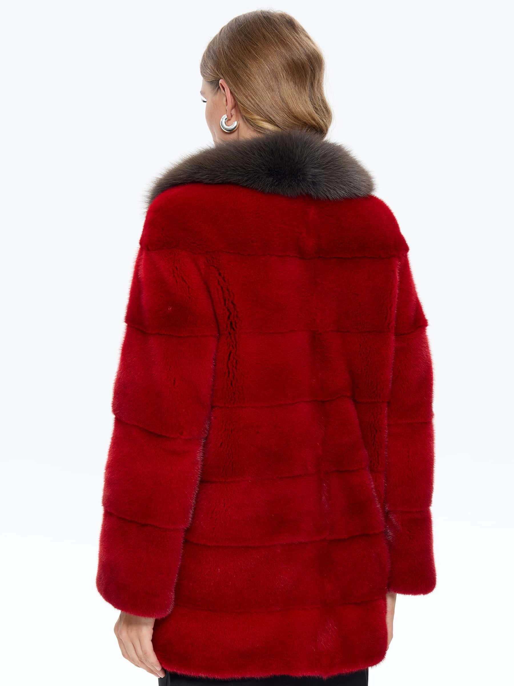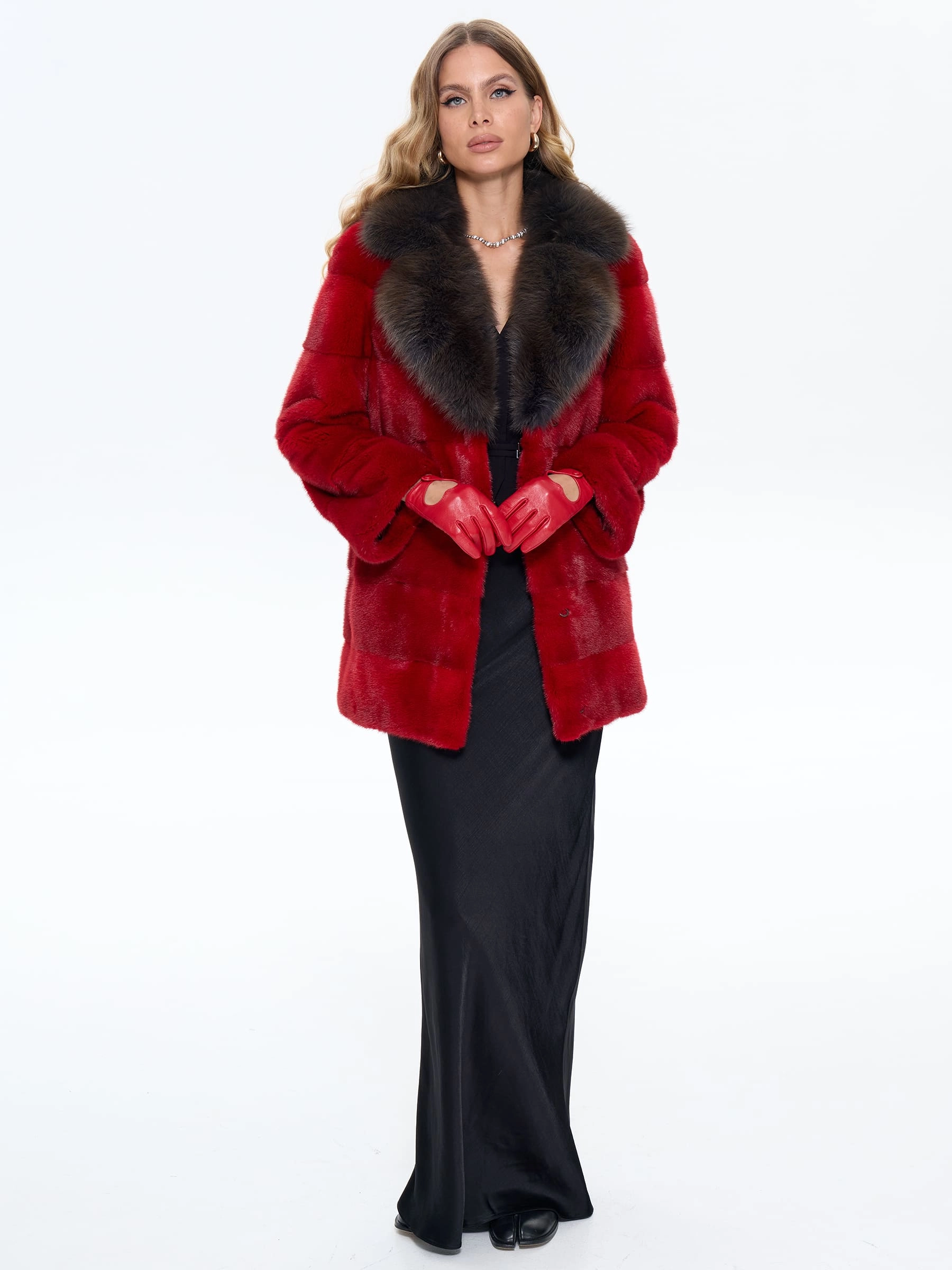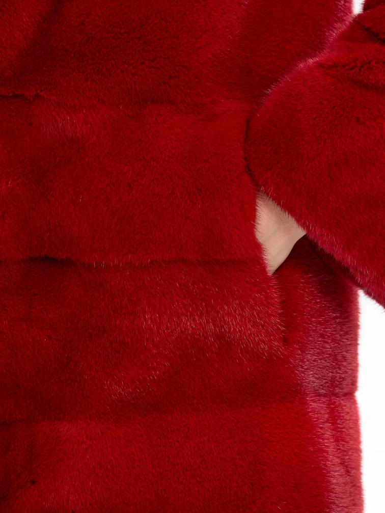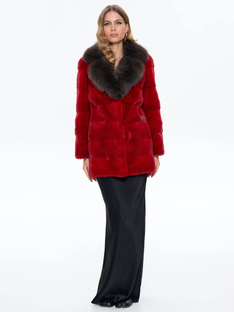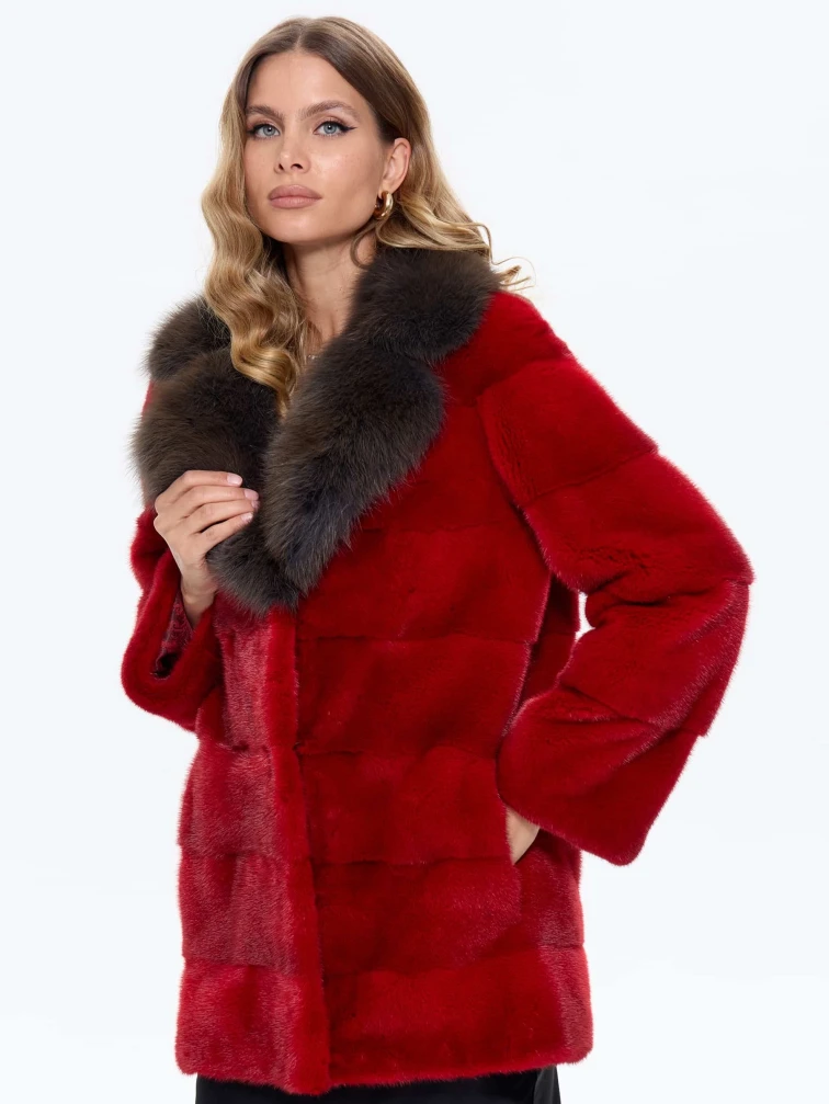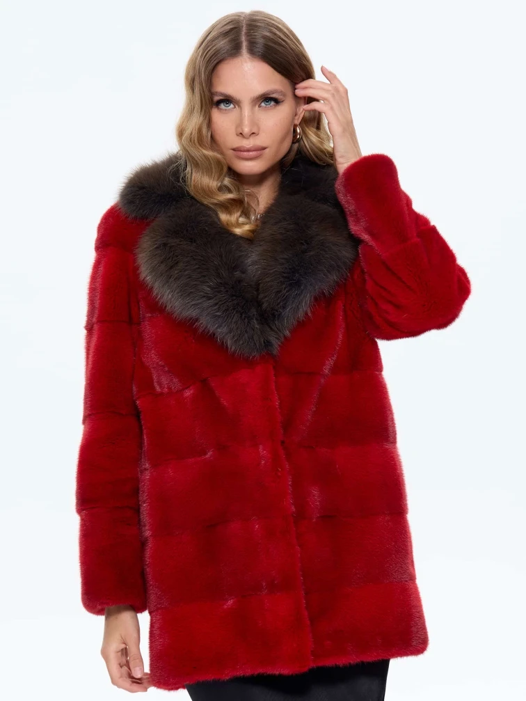 Товар красная норковая шуба с куницей 2б, размер 44, артикул 65180.