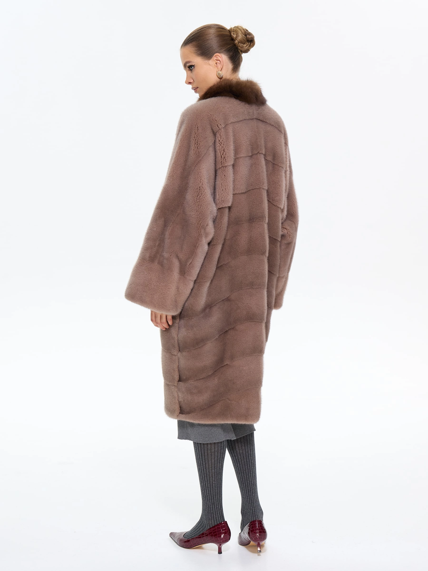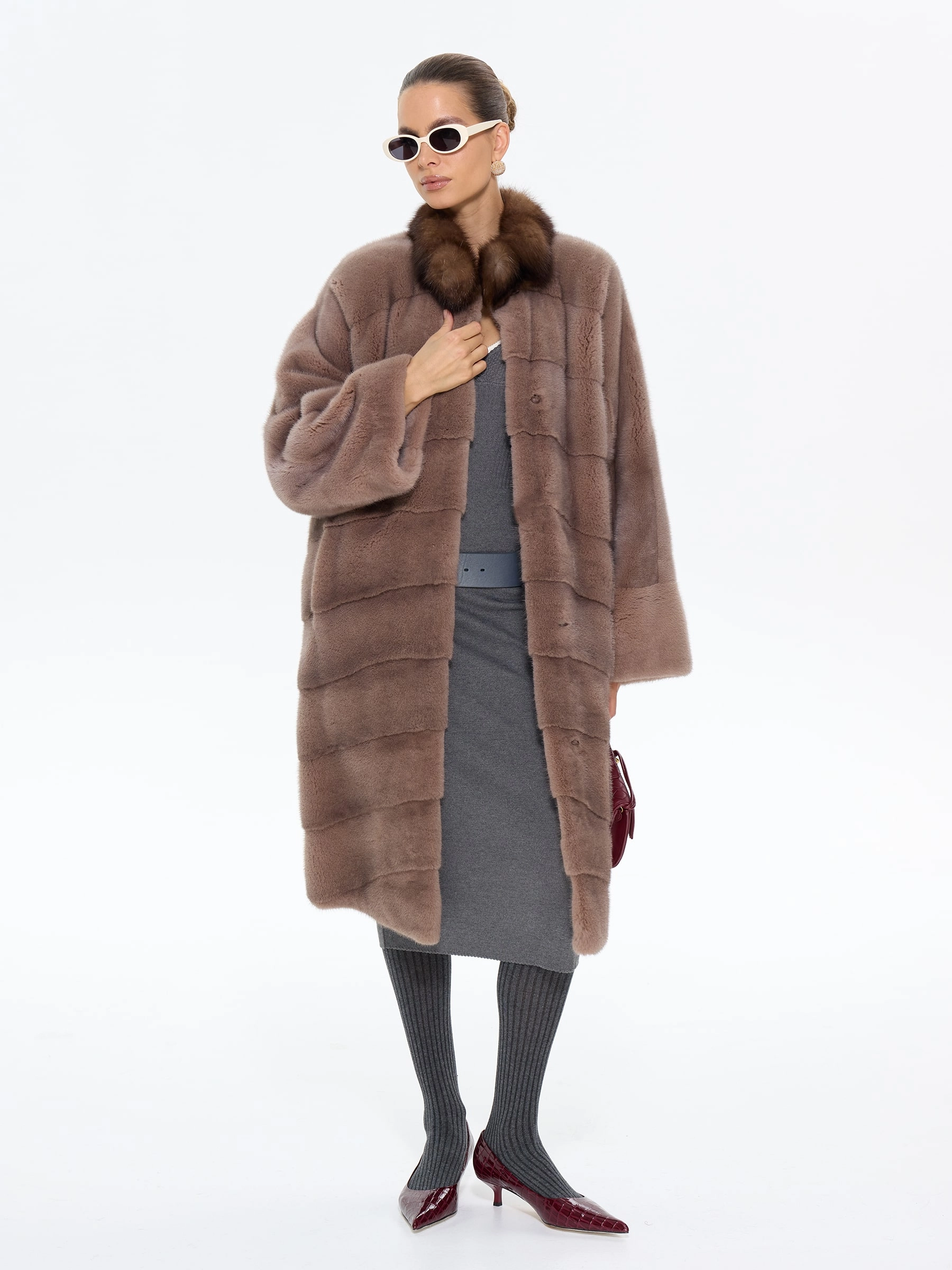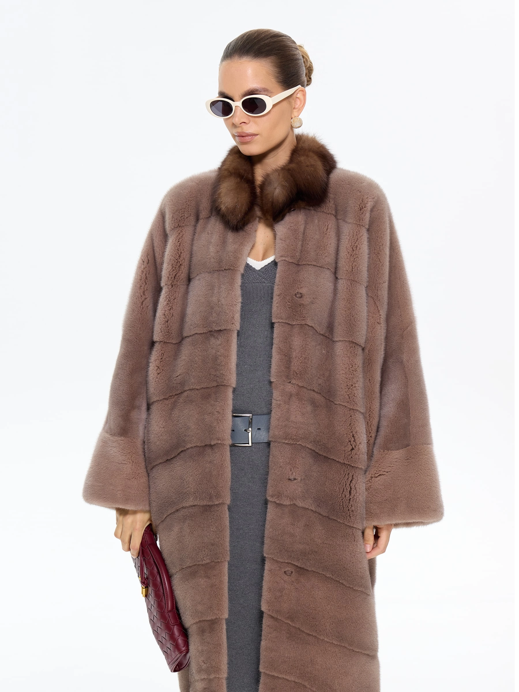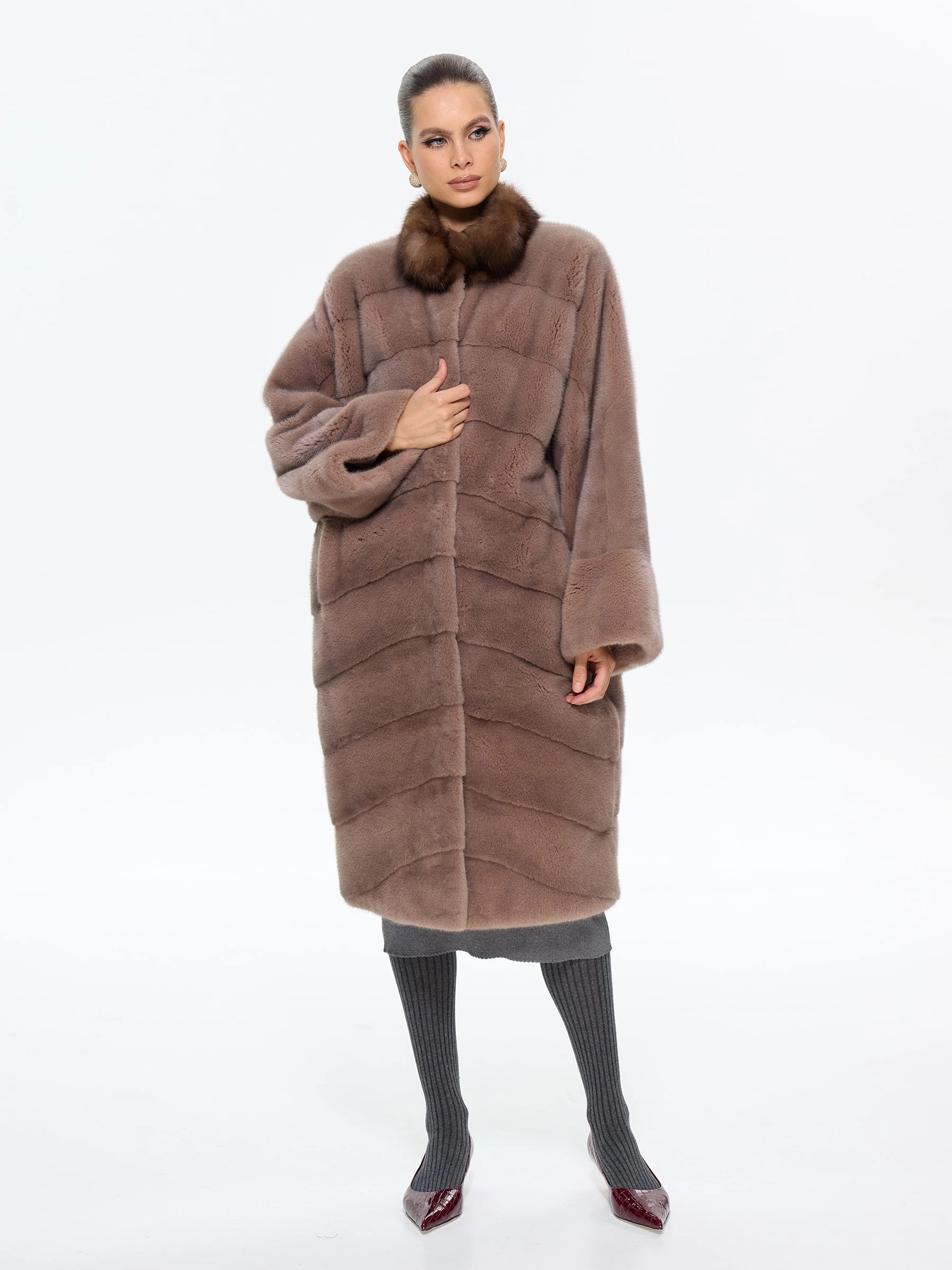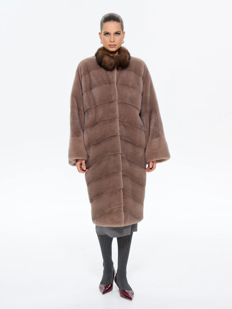 Роскошная длинная шуба из меха норки премиум-класса в шоколадном оттенке "какао" с элегантной стойкой, отделанной мехом соболя. Модель прямого силуэта длиной 110 см с диагональной раскладкой меха и свободным рукавом кимоно подчеркивает аристократическую элегантность и неповторимый шарм. Стилисты рекомендуют носить эту шубу с кожаными сапогами-челси и узкими брюками для повседневного образа или с платьем-футляром и жемчужными серьгами для вечернего выхода. Идеальное сочетание вечной классики и современной роскоши для истинных ценительниц утонченного стиля.