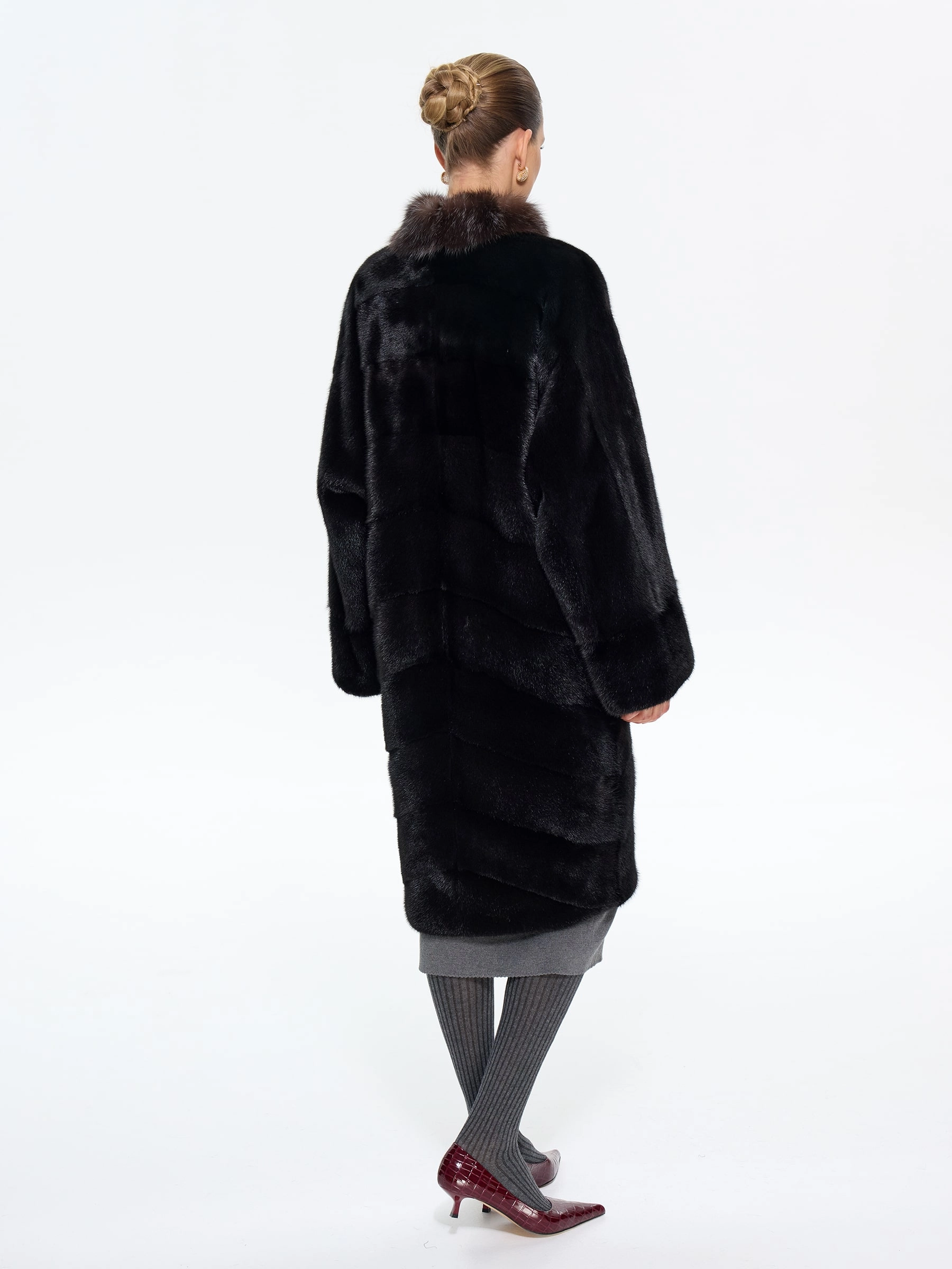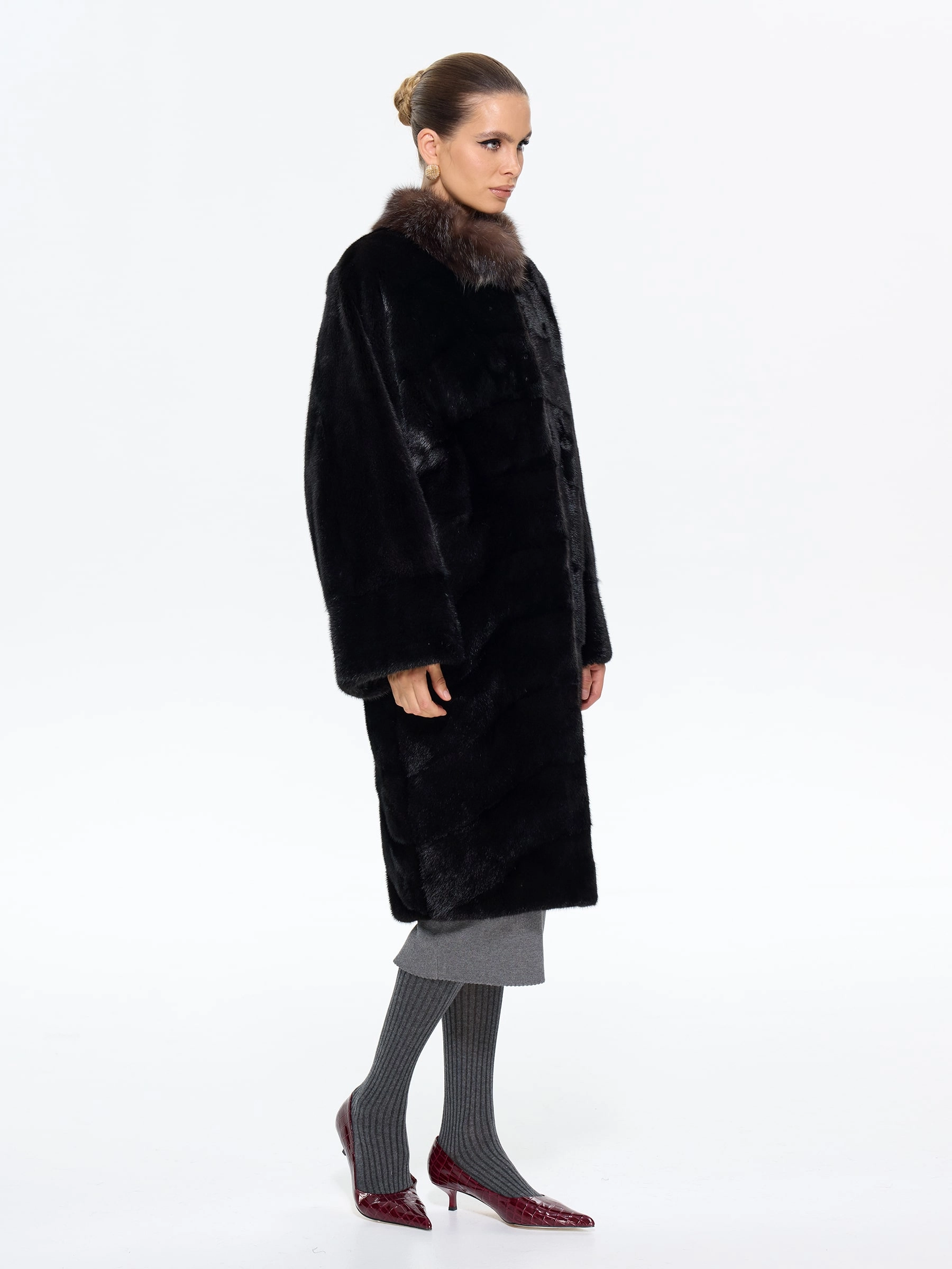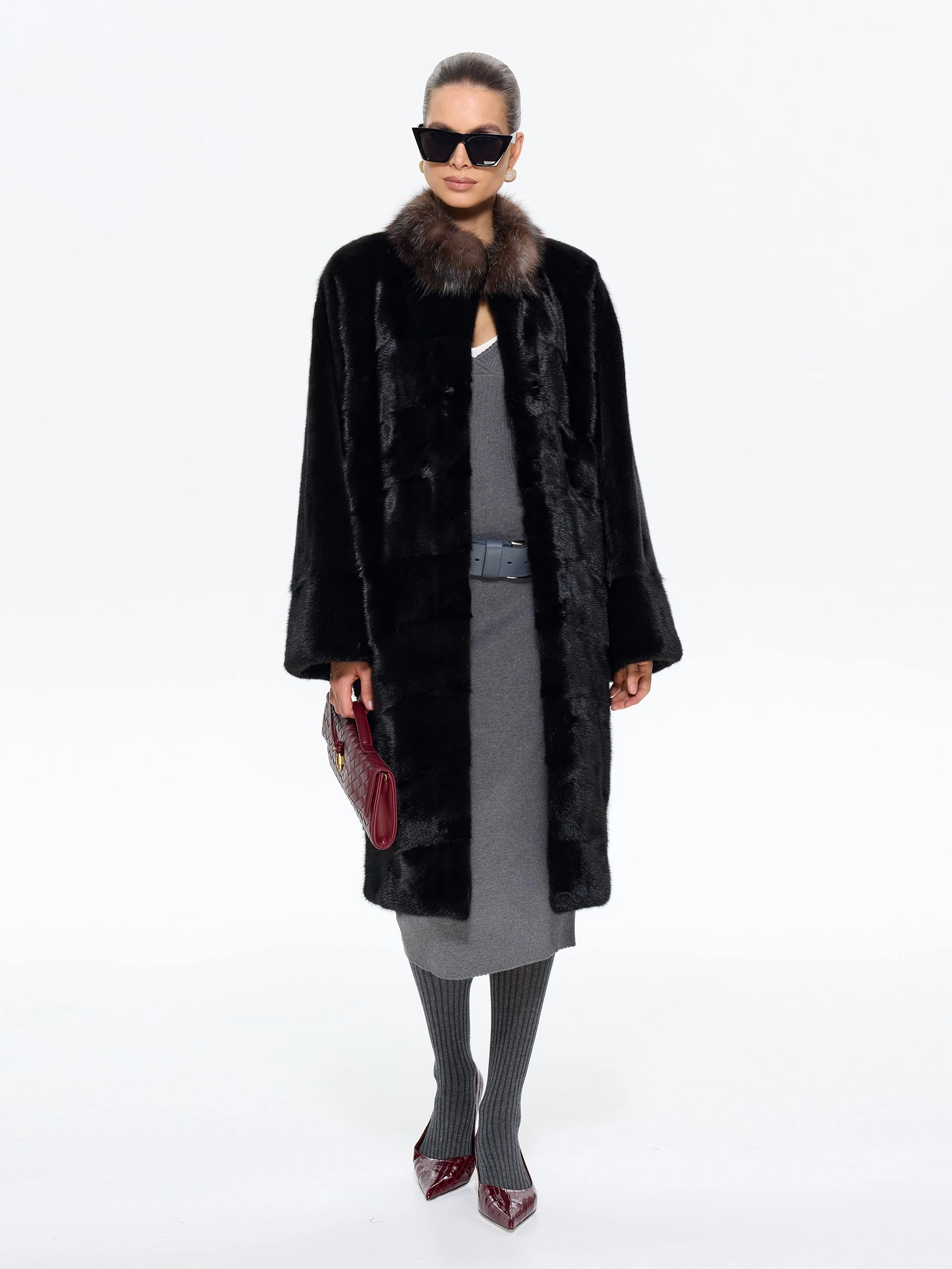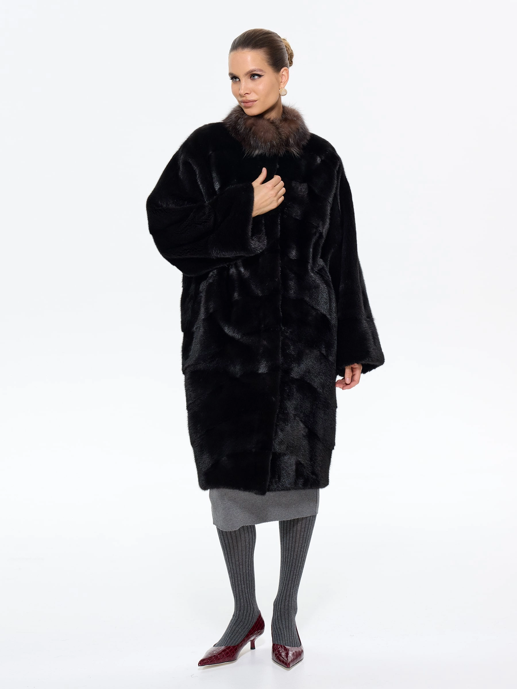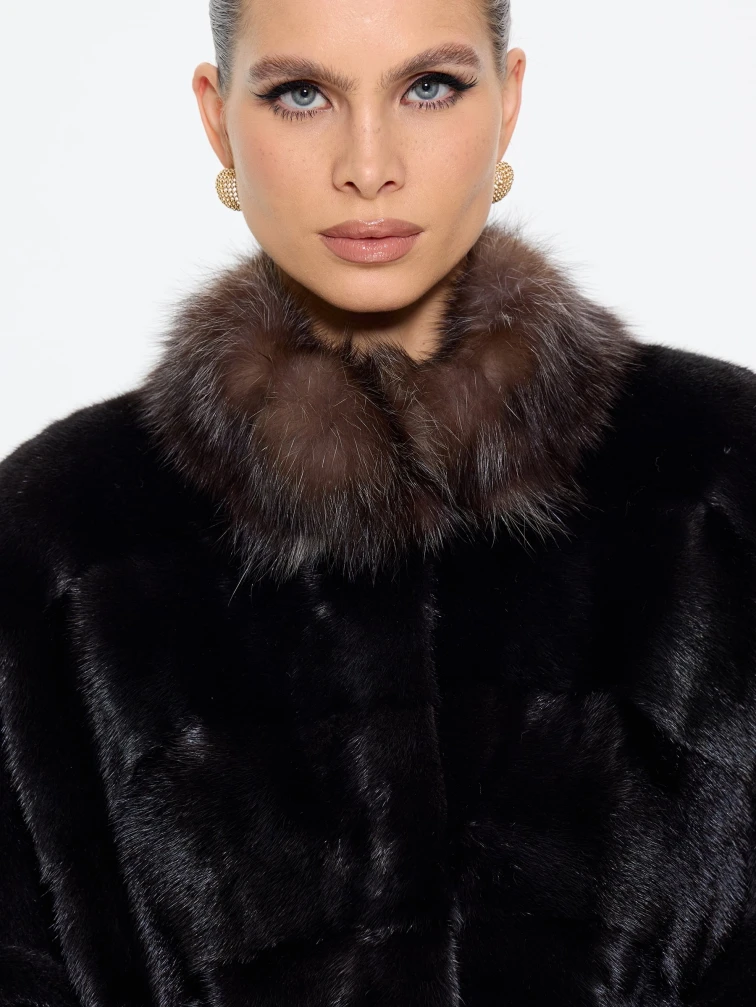 Роскошная длинная шуба из меха норки премиум-класса в шоколадном оттенке "какао" с элегантной стойкой, отделанной мехом соболя. Модель прямого силуэта длиной 110 см с диагональной раскладкой меха и свободным рукавом кимоно подчеркивает аристократическую элегантность и неповторимый шарм. Стилисты рекомендуют носить эту шубу с кожаными сапогами-челси и узкими брюками для повседневного образа или с платьем-футляром и жемчужными серьгами для вечернего выхода. Идеальное сочетание вечной классики и современной роскоши для истинных ценительниц утонченного стиля.