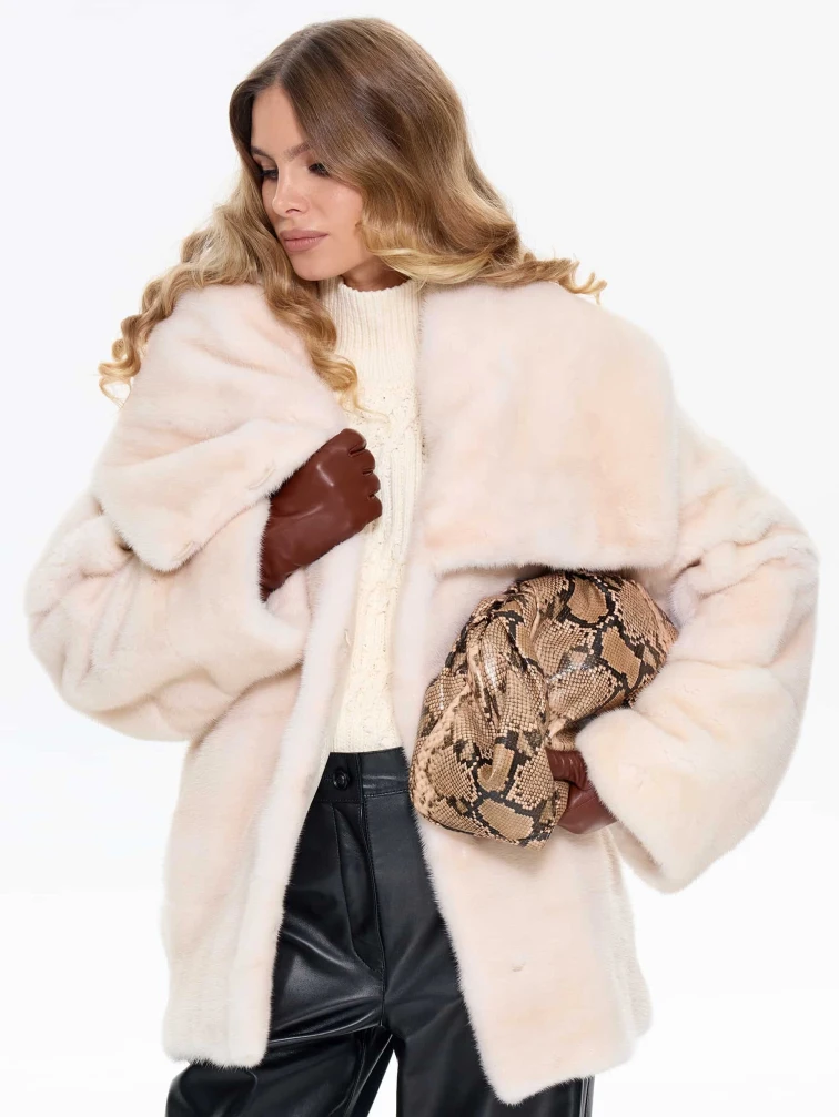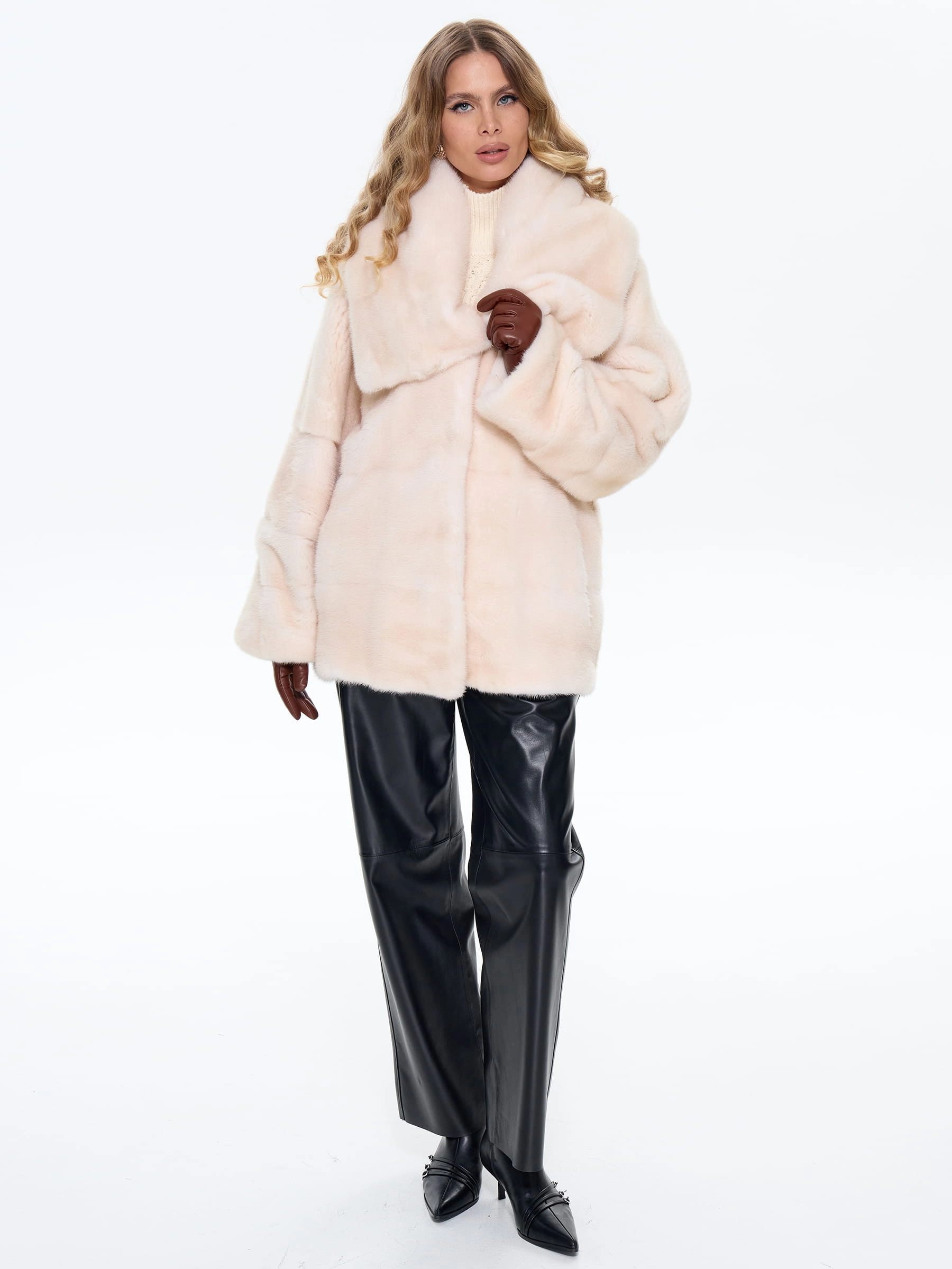 Поперечная женская норковая шуба BRASCHI LS 005, бежевая, размер 40, артикул 34350