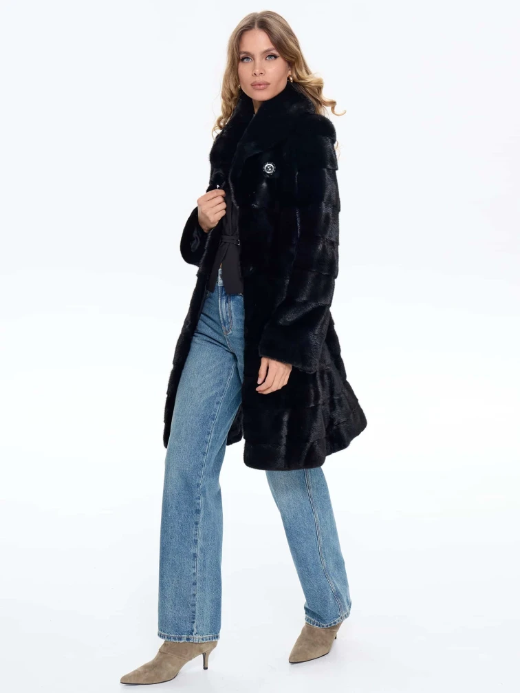 Элегантная приталенная шуба из густого меха натуральной норки в диагональной раскладке сочетает сдержанную роскошь и практичность. Нежный шелковистый мех с объемным эффектом мягко облегает фигуру, подчеркивая талию без ограничения движений. Трансформирующийся воротник-шале варьируется от строгой стойки до роскошных складок. Гипоаллергенная подкладка с антистатической обработкой обеспечивает комфорт, а скрытые клипсы и два боковых кармана добавляют практичности.