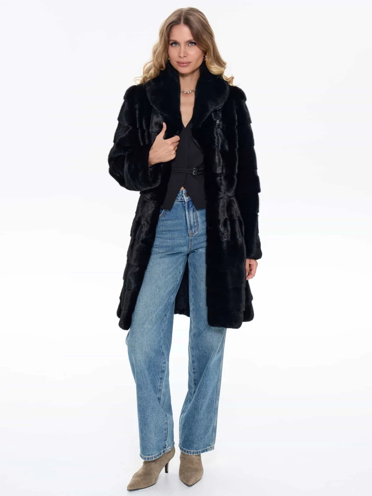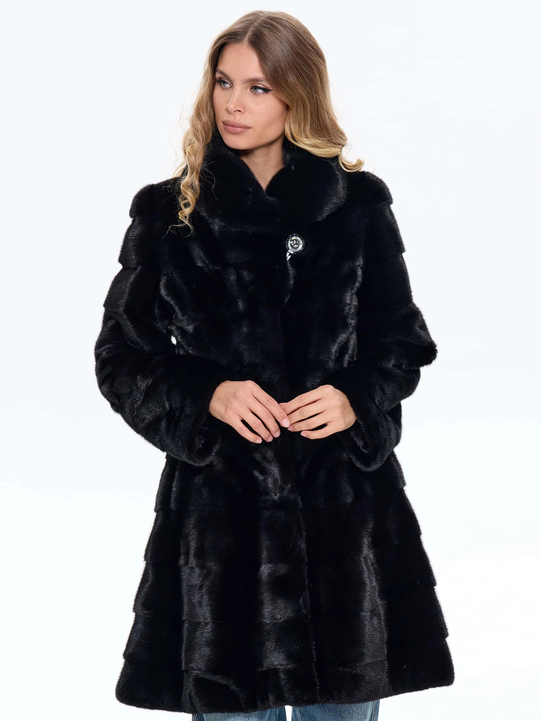Товар поперечная женская шуба из меха норки manakas wmf10026, черная, размер 40, артикул 34300 выполнен из норка с застежкой клипсы. Рассчитан на сезон: зима. Длина изделия 93 см, силуэт приталенный .