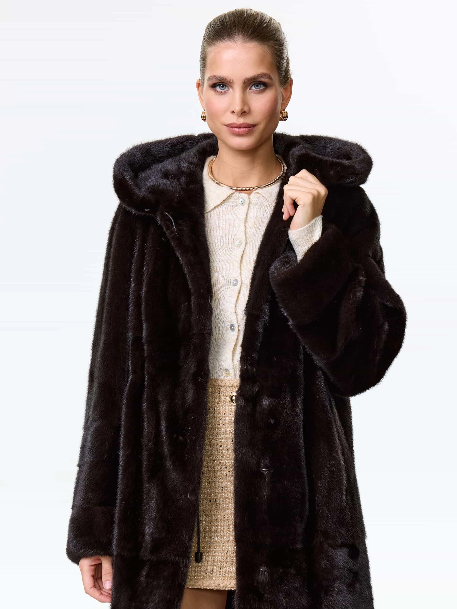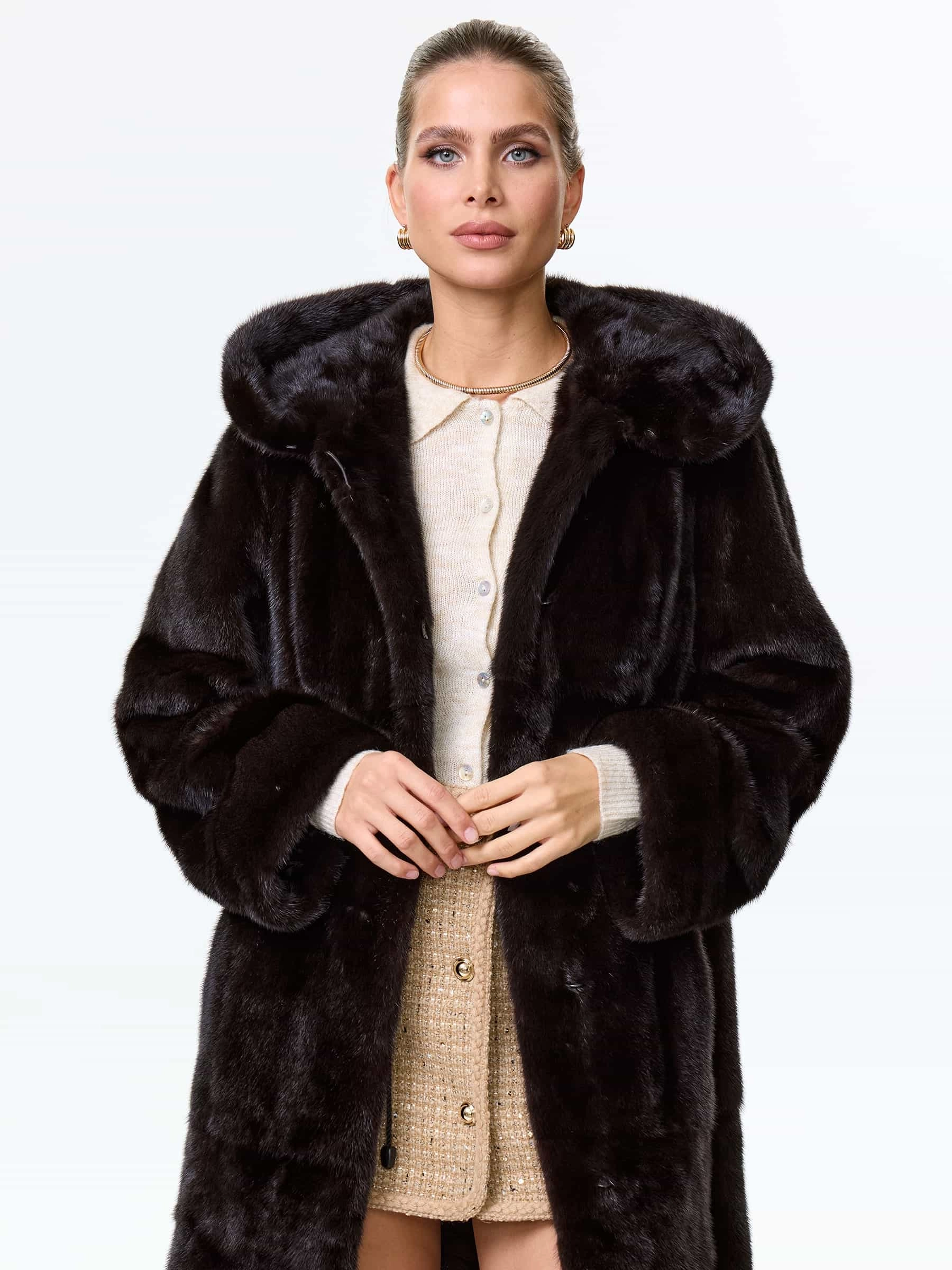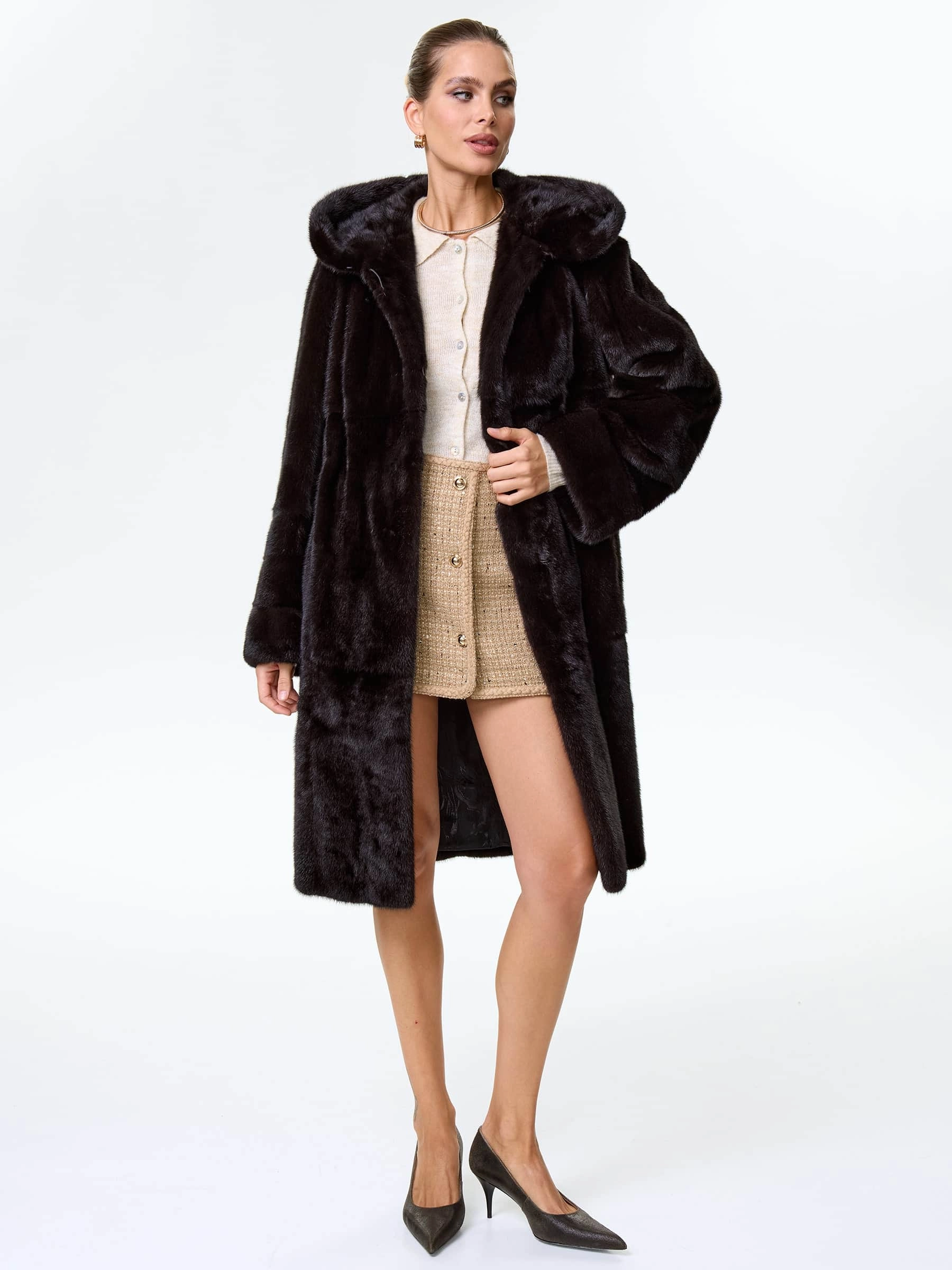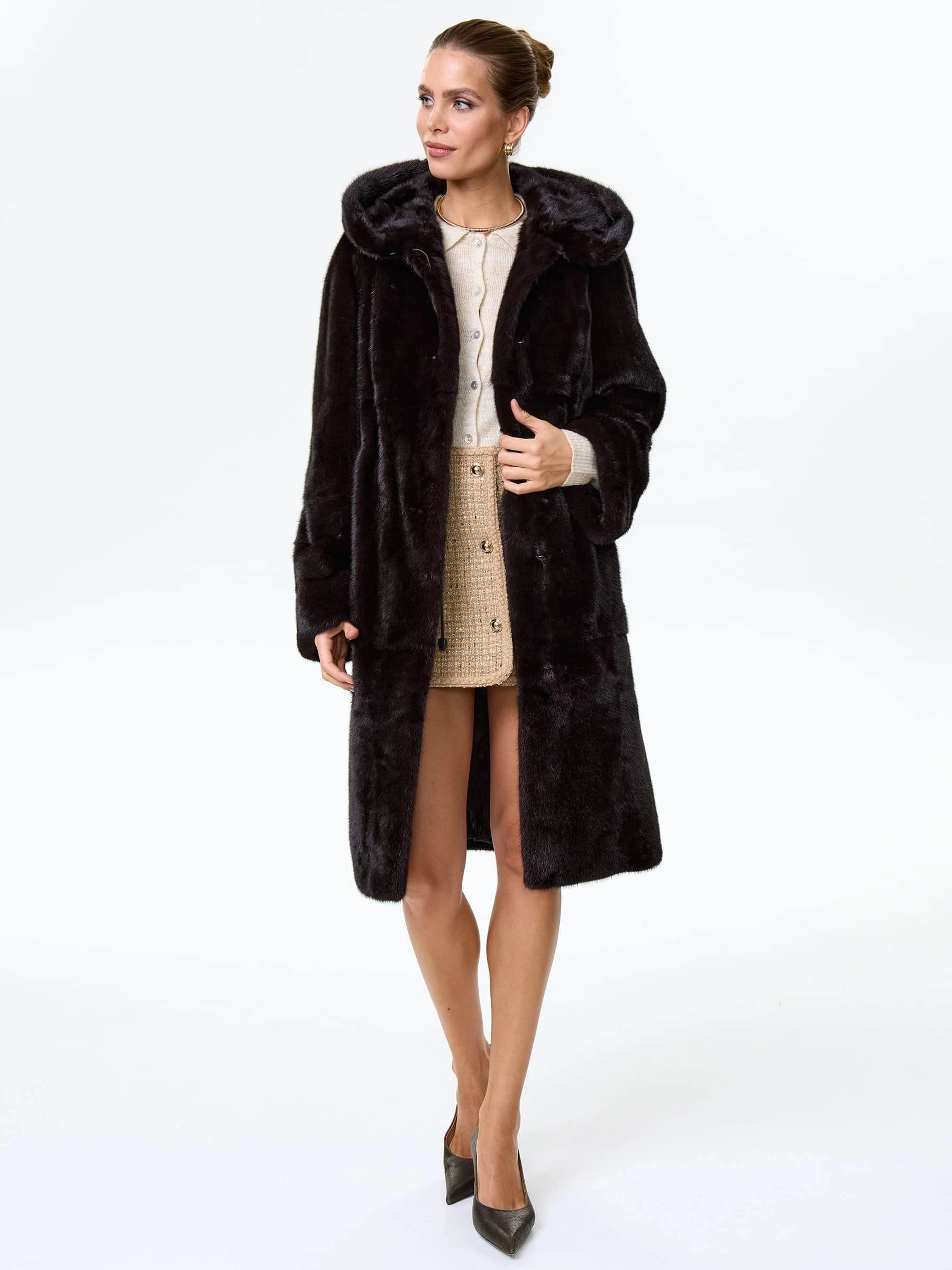 Товар шуба длинная из меха норки женская надежда(к), черная, размер 48, артикул 64530 выполнен из норка с застежкой клипсы. Рассчитан на сезон: зима. Длина изделия 102 см, силуэт прямой.
