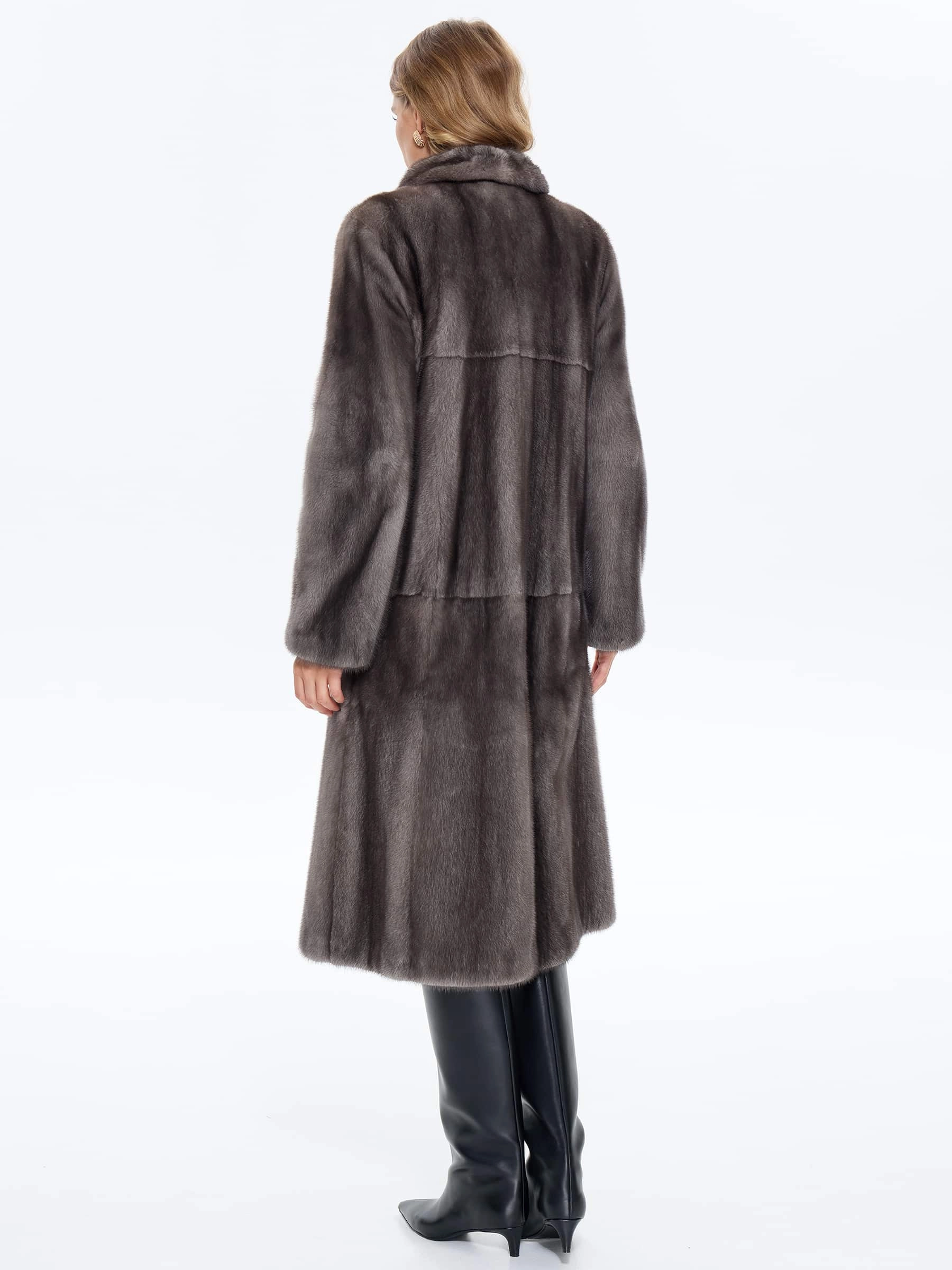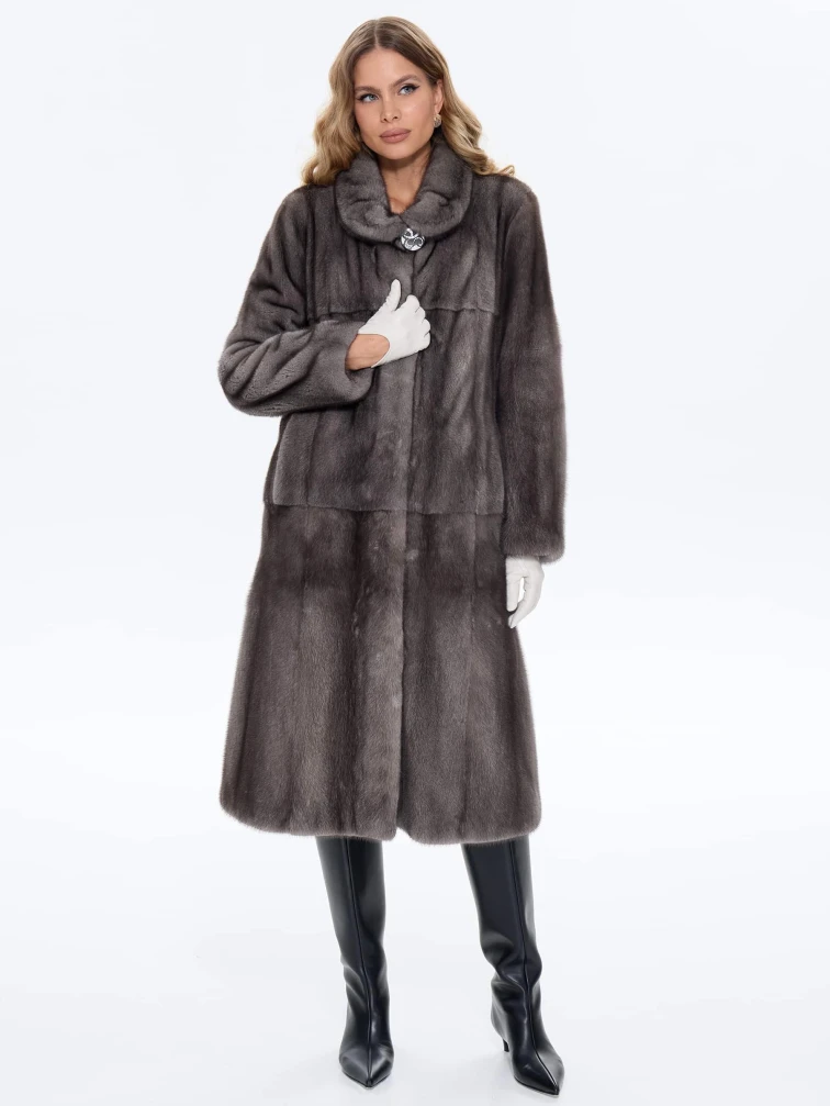Для пошива длинной классической шубы мастера использовали нежный густой мех норки в темно-сером цвете, меняющем насыщенность при разном освещении. Полуприлегающий крой мягко подчеркивает талию, сохраняя свободу движений. Длина до щиколотки обеспечивает максимальную защиту от мороза. Лаконичный воротник-стойка надежно защищает шею от ветра. Изделие дополнено двумя удобными боковыми карманами. Застёжка на скрытых клипсах завершает образ. Модель сочетает вневременную роскошь с повседневным комфортом