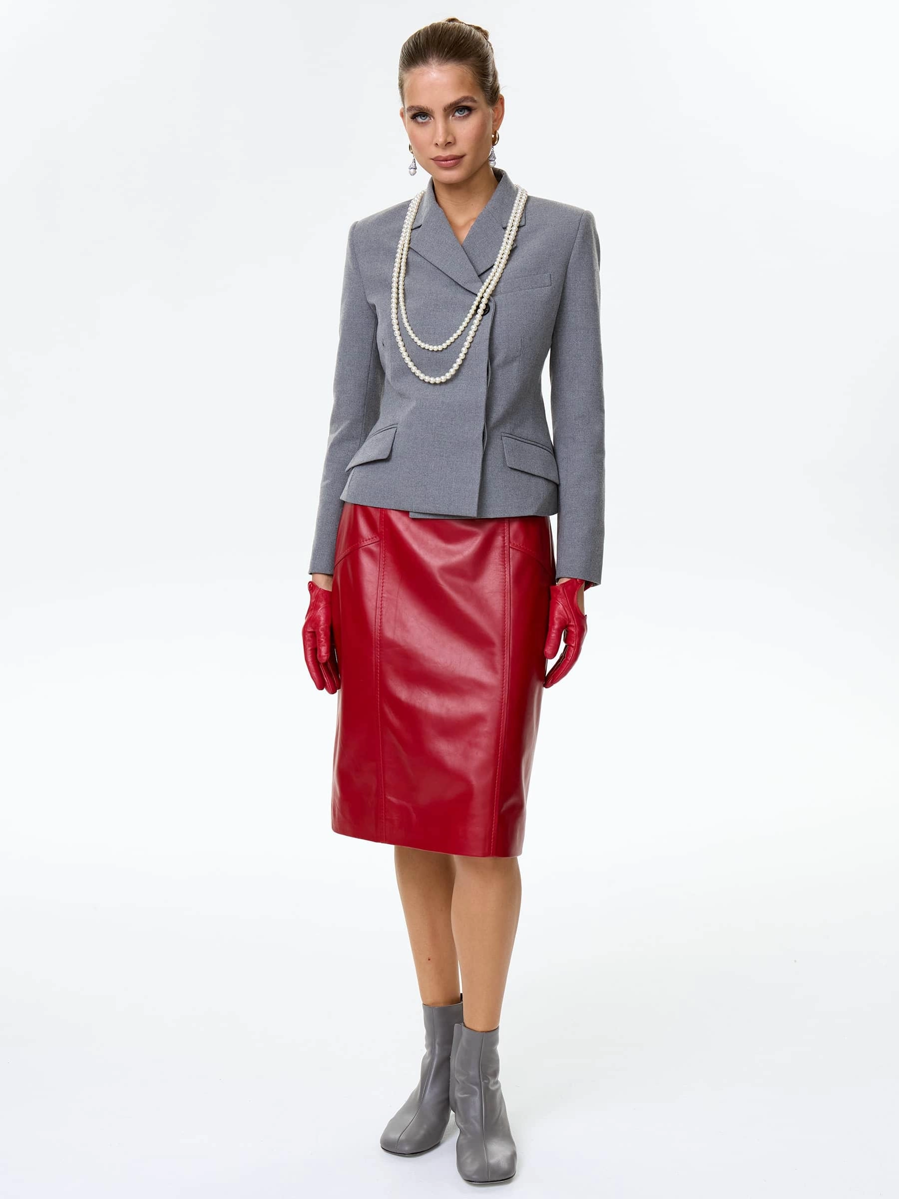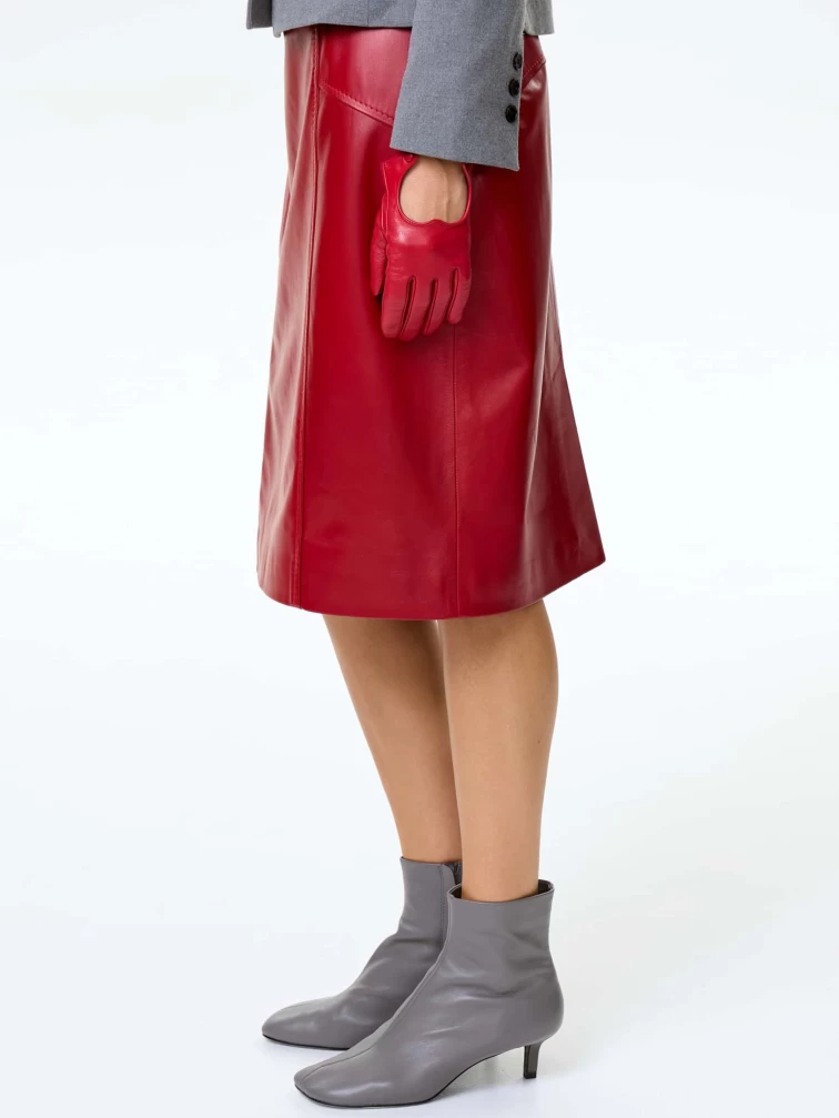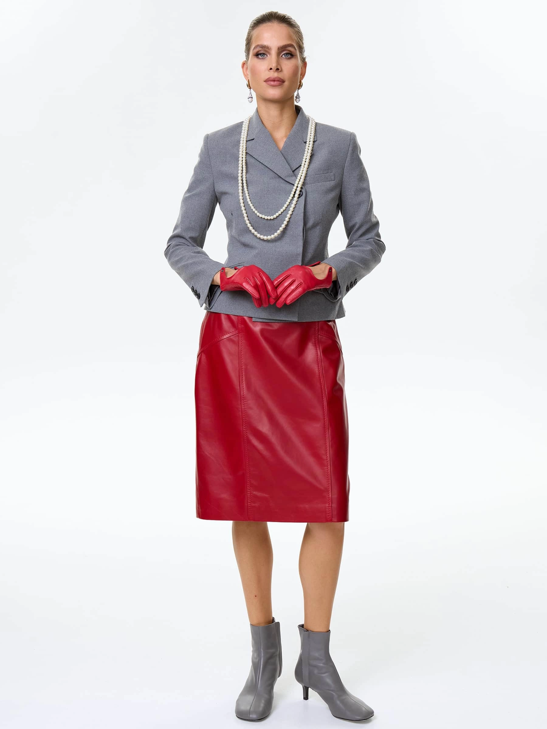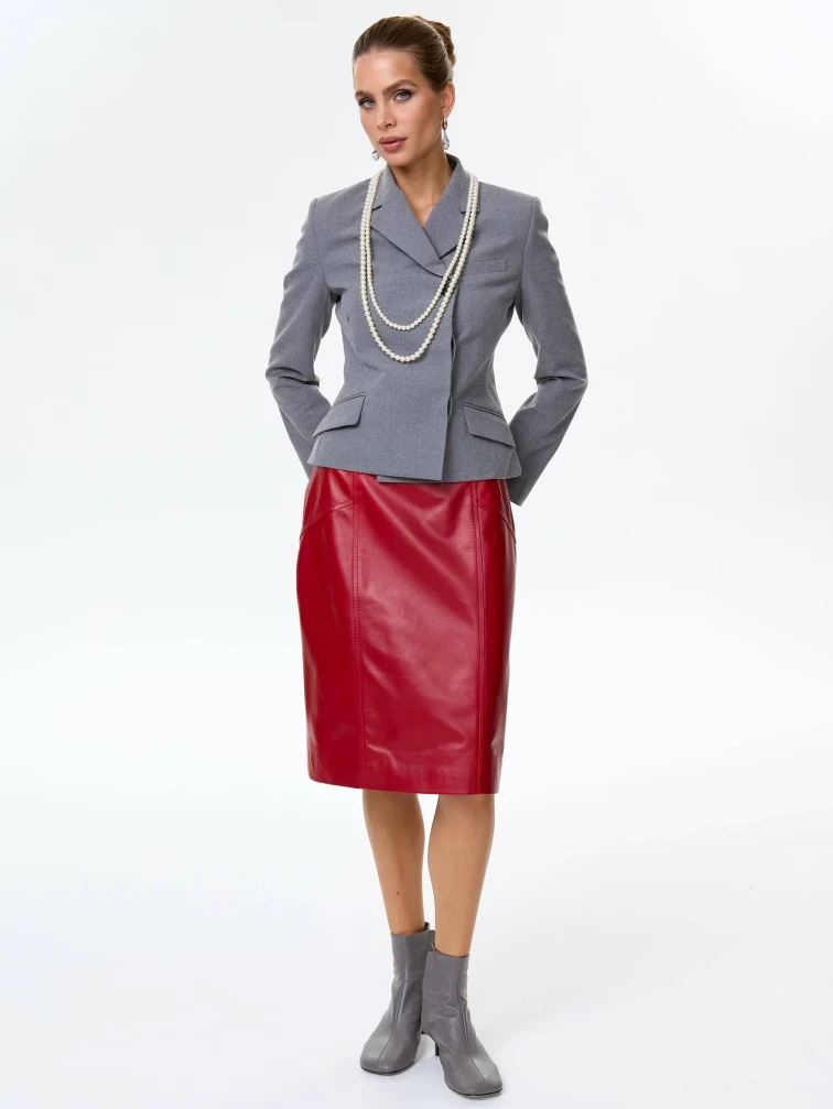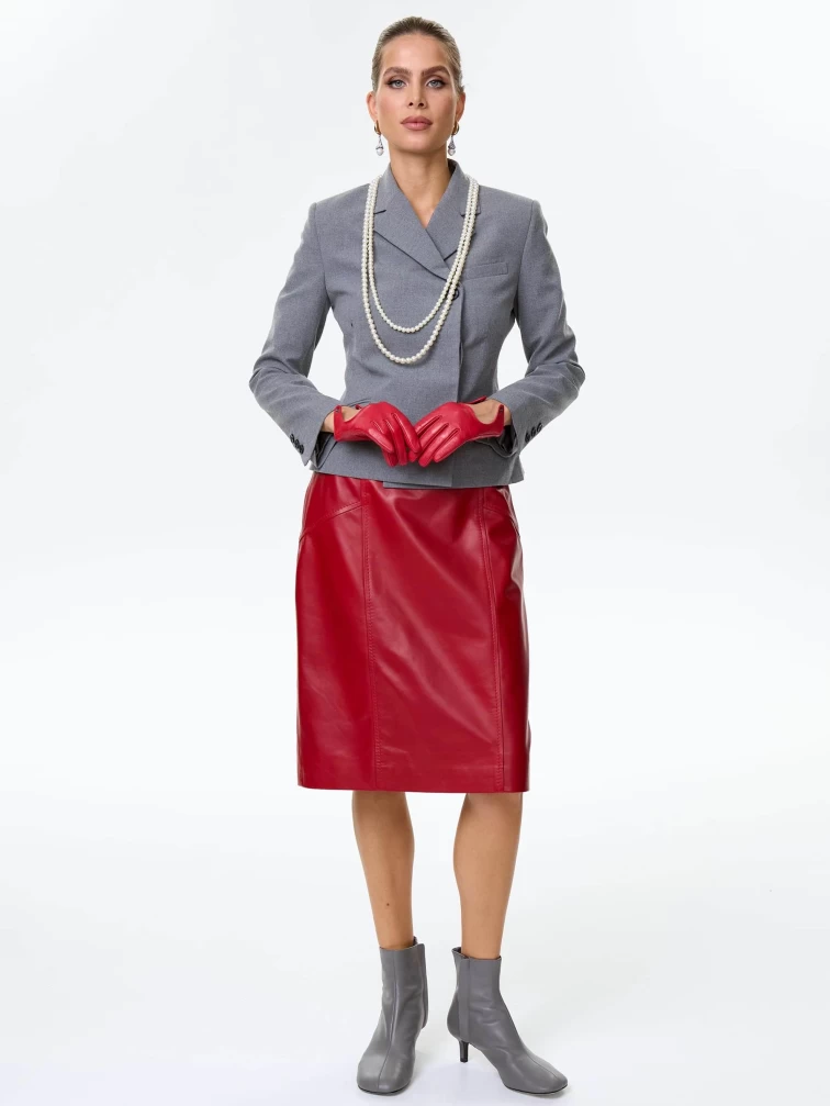 Юбка-карандаш из мягкой натуральной кожи насыщенного красного оттенка сочетает строгий прямой силуэт с элегантными деталями. Боковые кокетки с деликатной строчкой подчеркивают качество исполнения, а практичная шлица сохраняет удобство носки. Идеально комбинируется с монохромными блузами для делового стиля или с контрастными жакетами для создания акцентного образа.