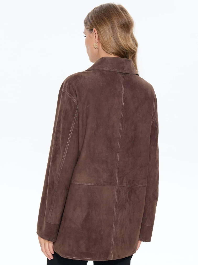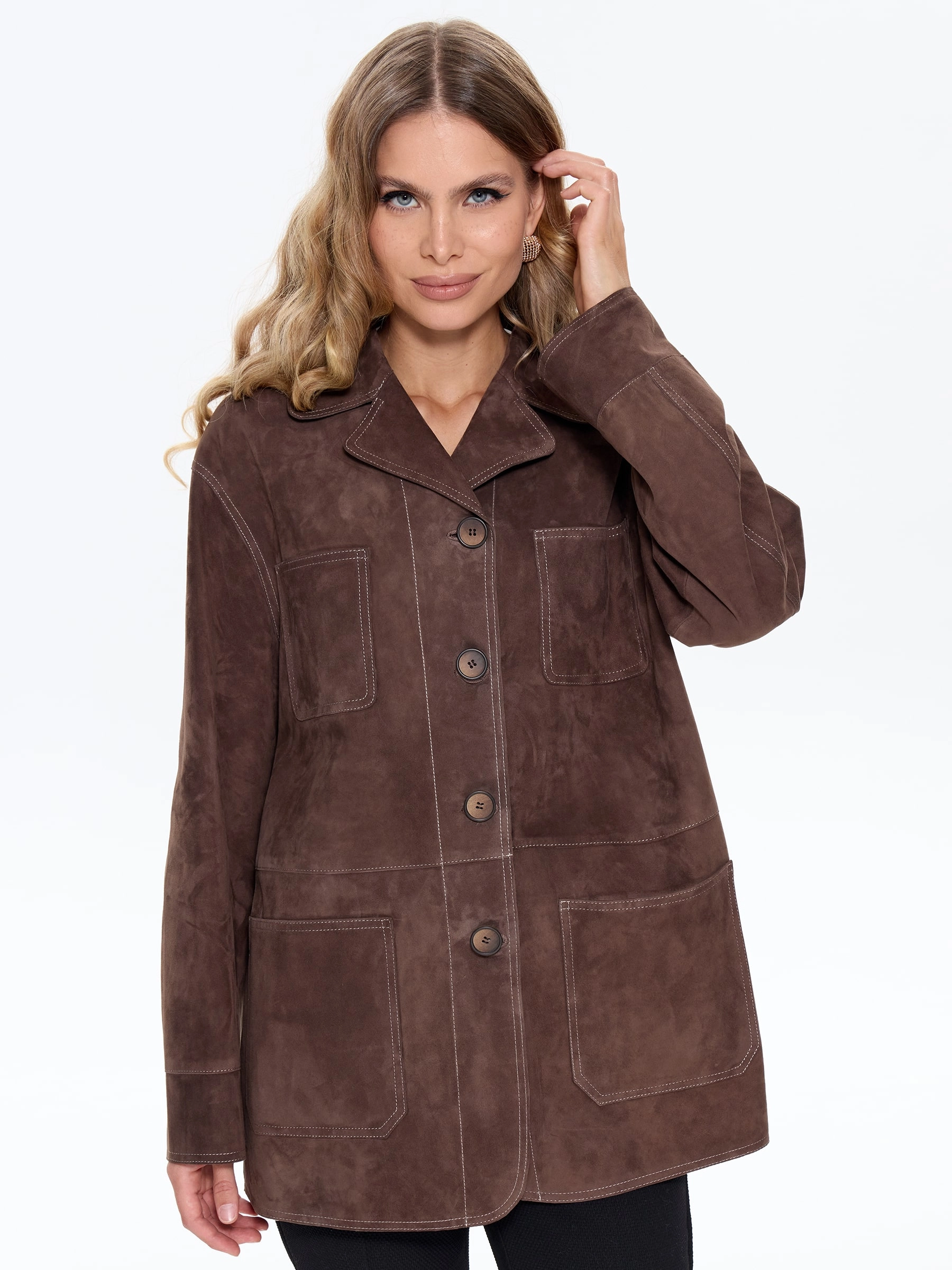 Пиджак с английским воротником выполнен из светло-коричневой замши с контрастной отстрочкой премиум-класса. Прямой силуэт изделия комфортно сидит по фигуре, не сковывая движений. Застёжка на пуговицы. Модель дополнена четырьмя накладными карманами.