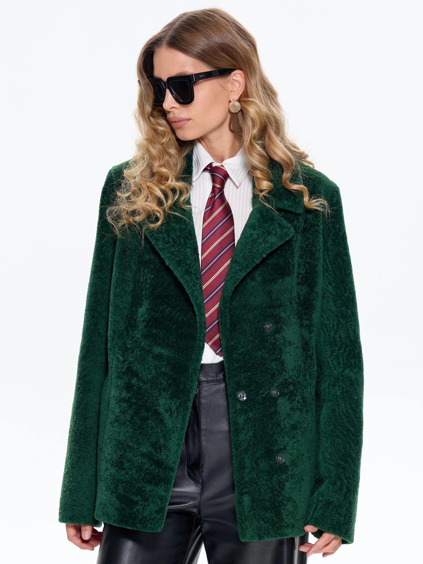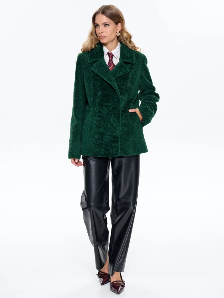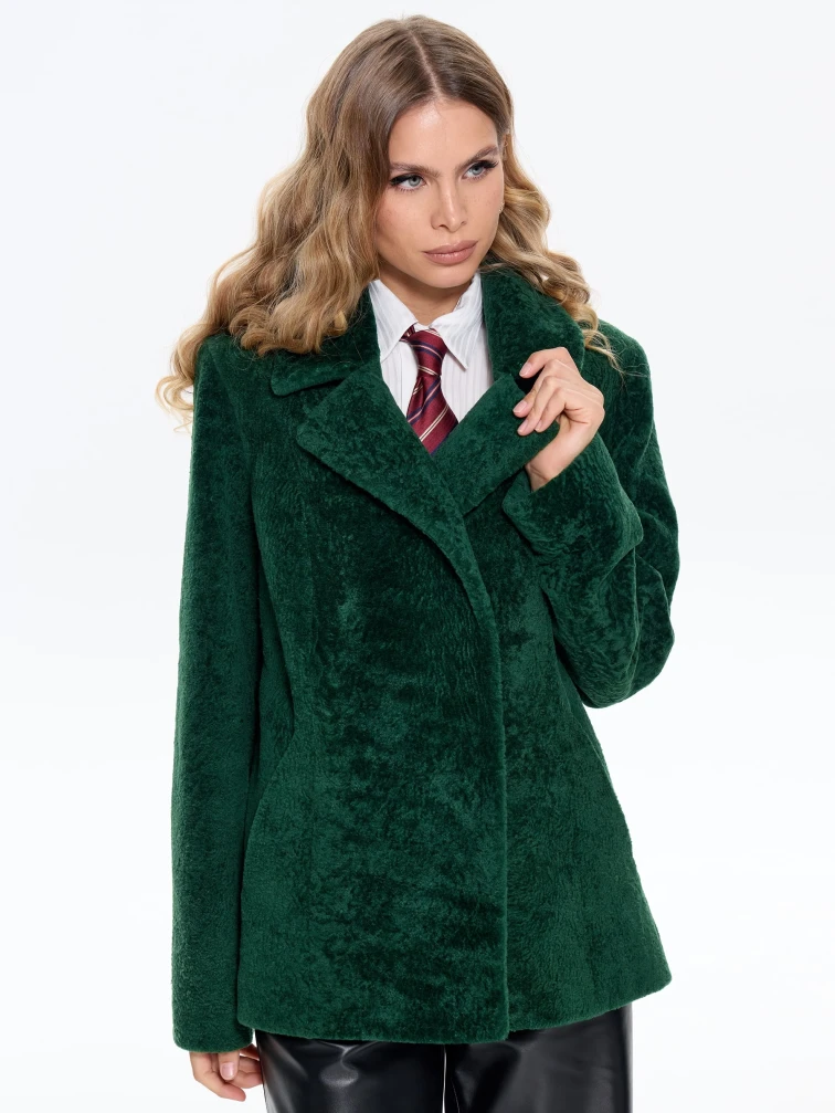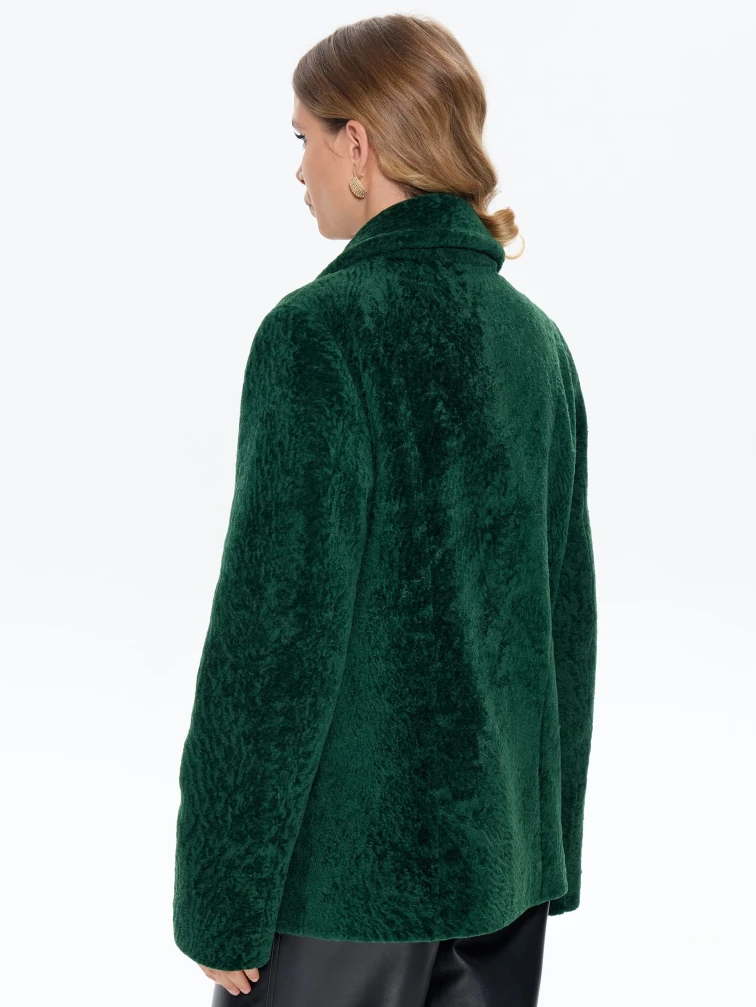 Товар зеленая дубленка из астрагана 58мех, размер 46, артикул 64760 выполнен из астраган с застежкой кнопки. Рассчитан на сезон: осень-зима. Длина изделия 70 см, силуэт прямой.