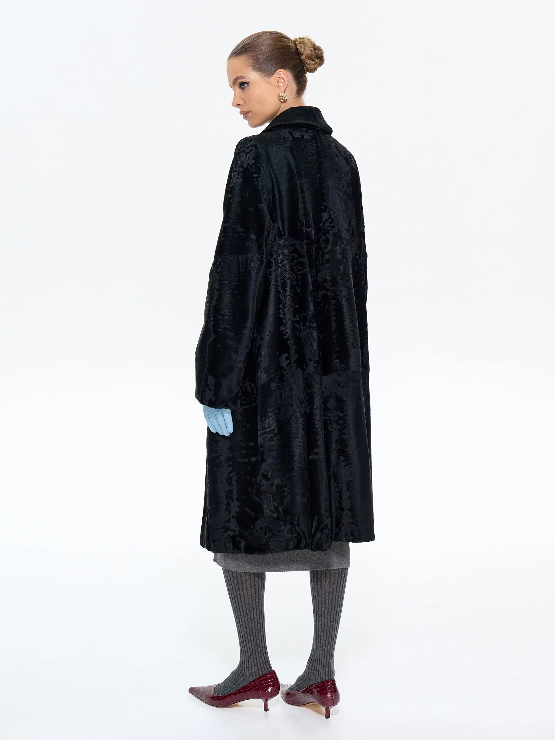 Элегантная длинная шуба из меха каракульчи премиум-класса в глубоком черном цвете с выразительным английским воротником. Модель прямого силуэта длиной 108 см создает вытянутый стройный силуэт, подчеркивая аристократическую элегантность. Стилисты рекомендуют носить эту шубу с кожаными перчатками и сапогами по колено, дополнив структурированной сумкой, или с платьем-футляром и жемчужными серьгами для вечернего выхода. Эта модель — воплощение вечной классики и неповторимого шарма, который подчеркнет ваш утонченный вкус в любом сезоне.