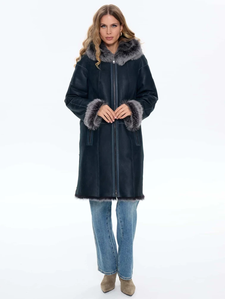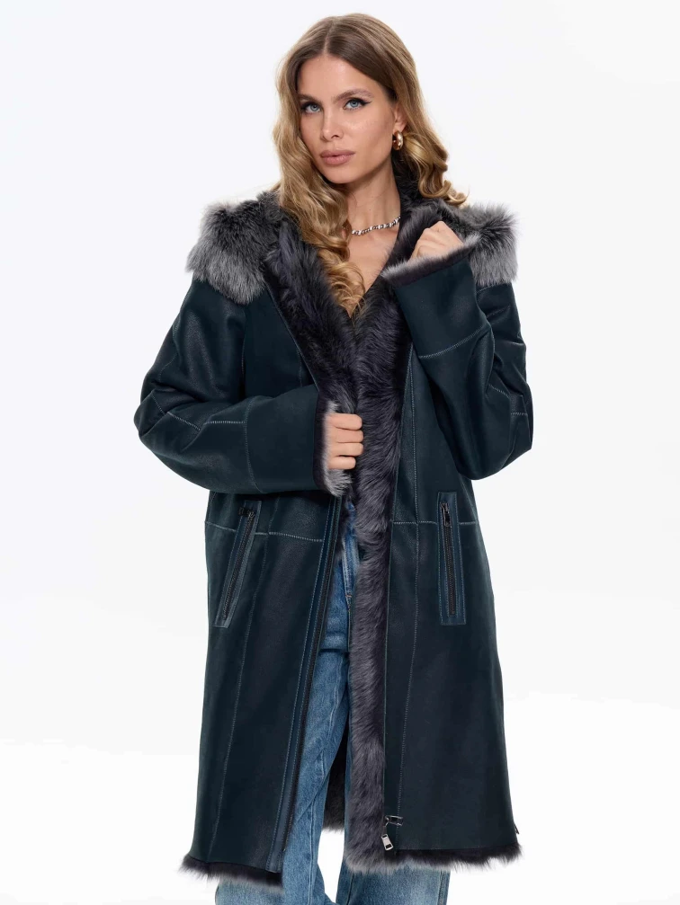 Женская дубленка с капюшоном из тосканы 2067, синяя, размер 48, артикул 64740