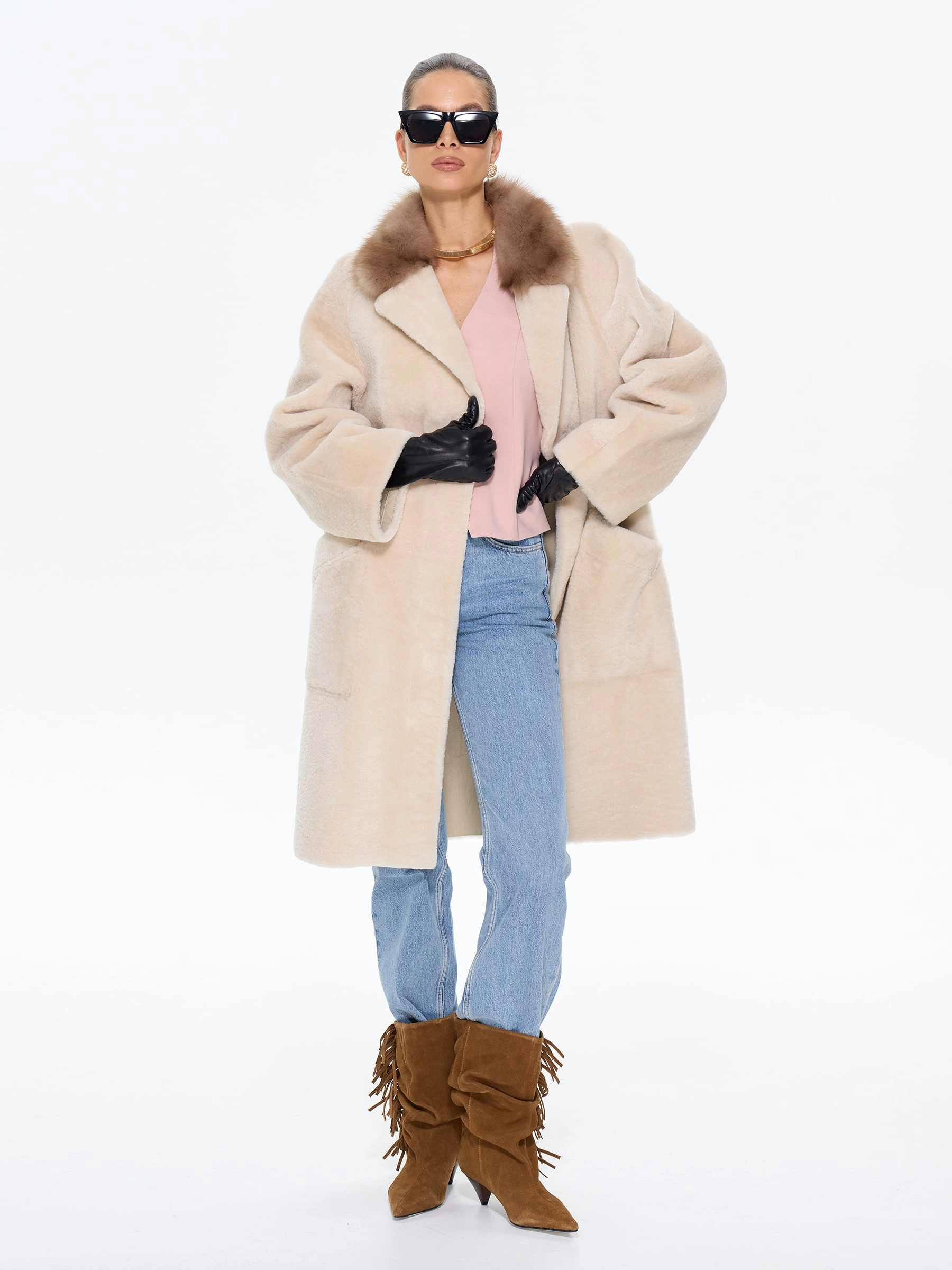 Женская дубленка свободного кроя с куницей 2070, бежевая, размер 48, артикул 65220