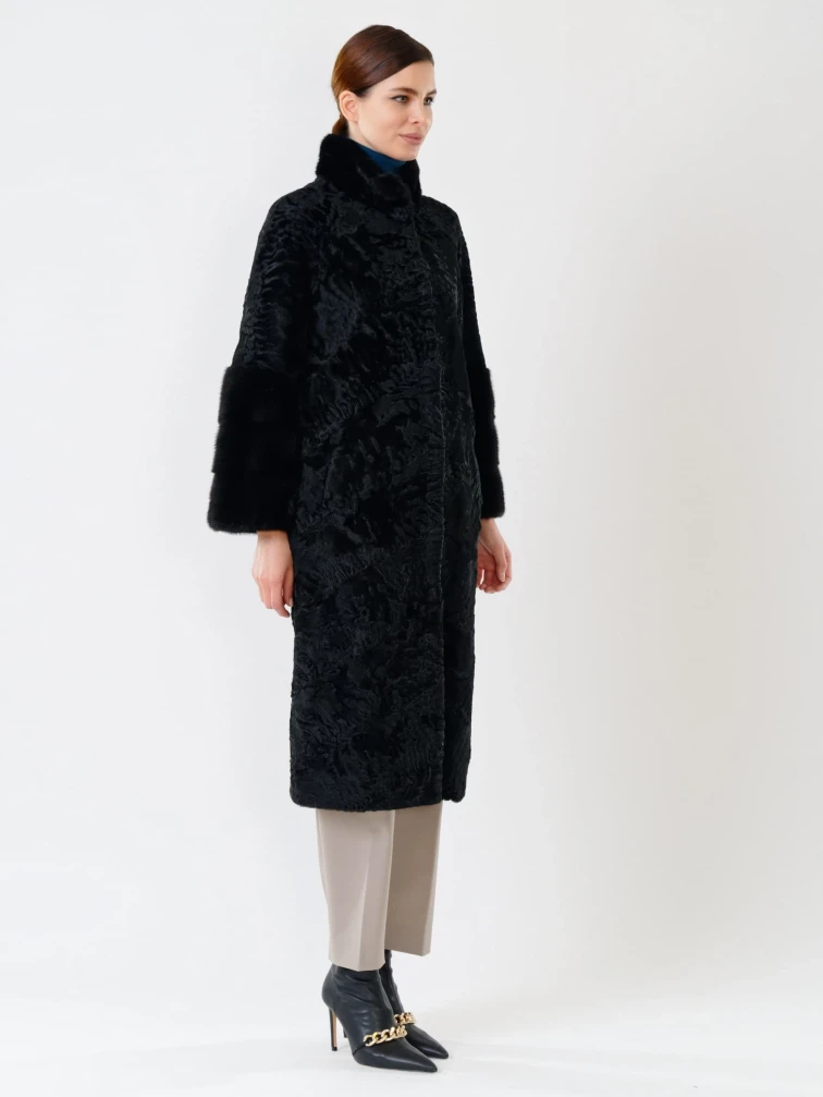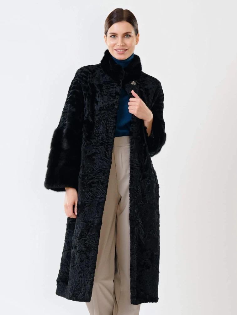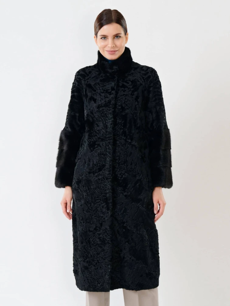 Товар женская шуба из меха каракуля с мехом норки 17101д(сн), черная, размер 44, артикул 22650 выполнен из каракуль с застежкой клипсы. Рассчитан на сезон: осень-зима. Длина изделия свыше 90 см, силуэт прямой.