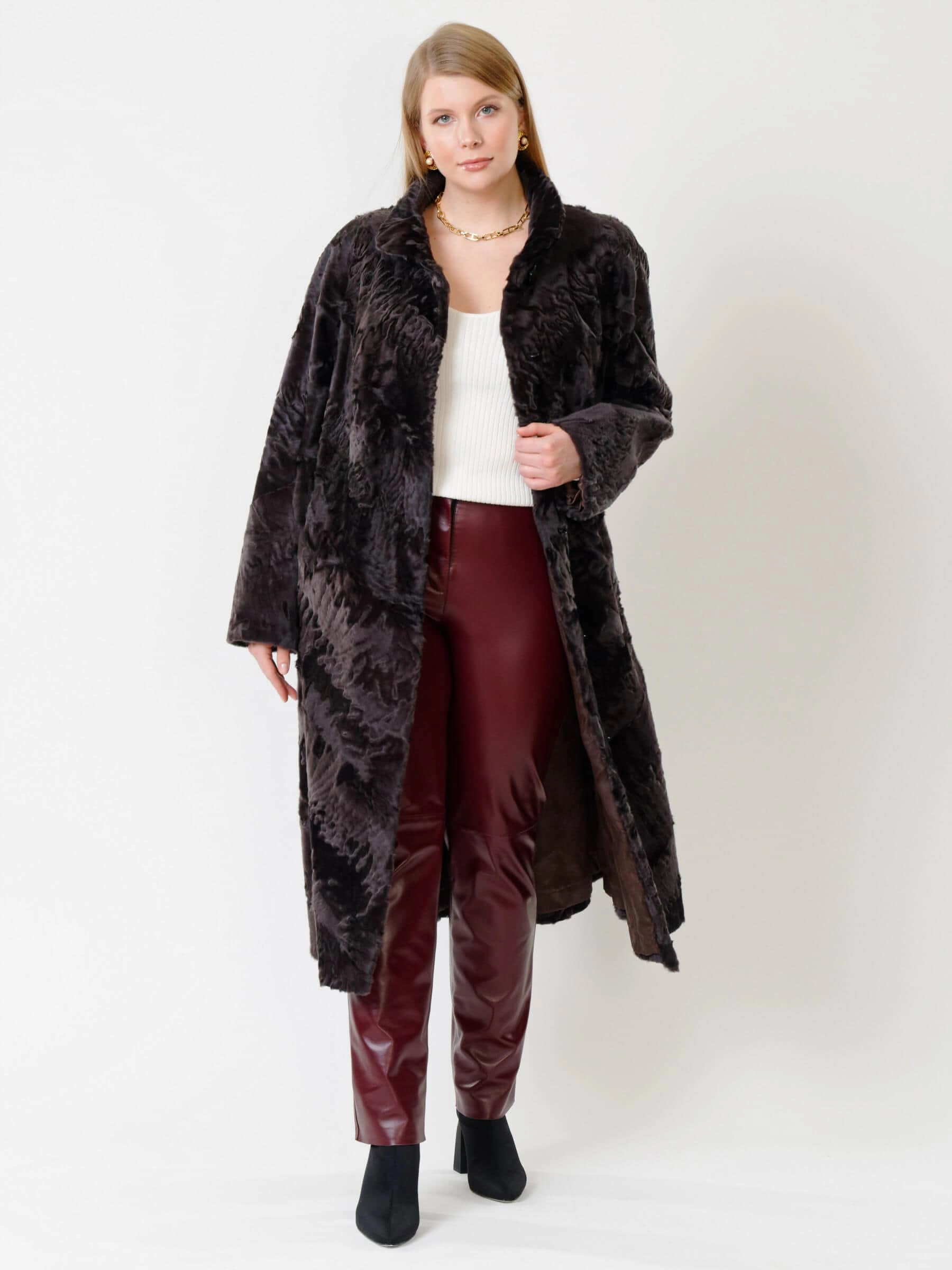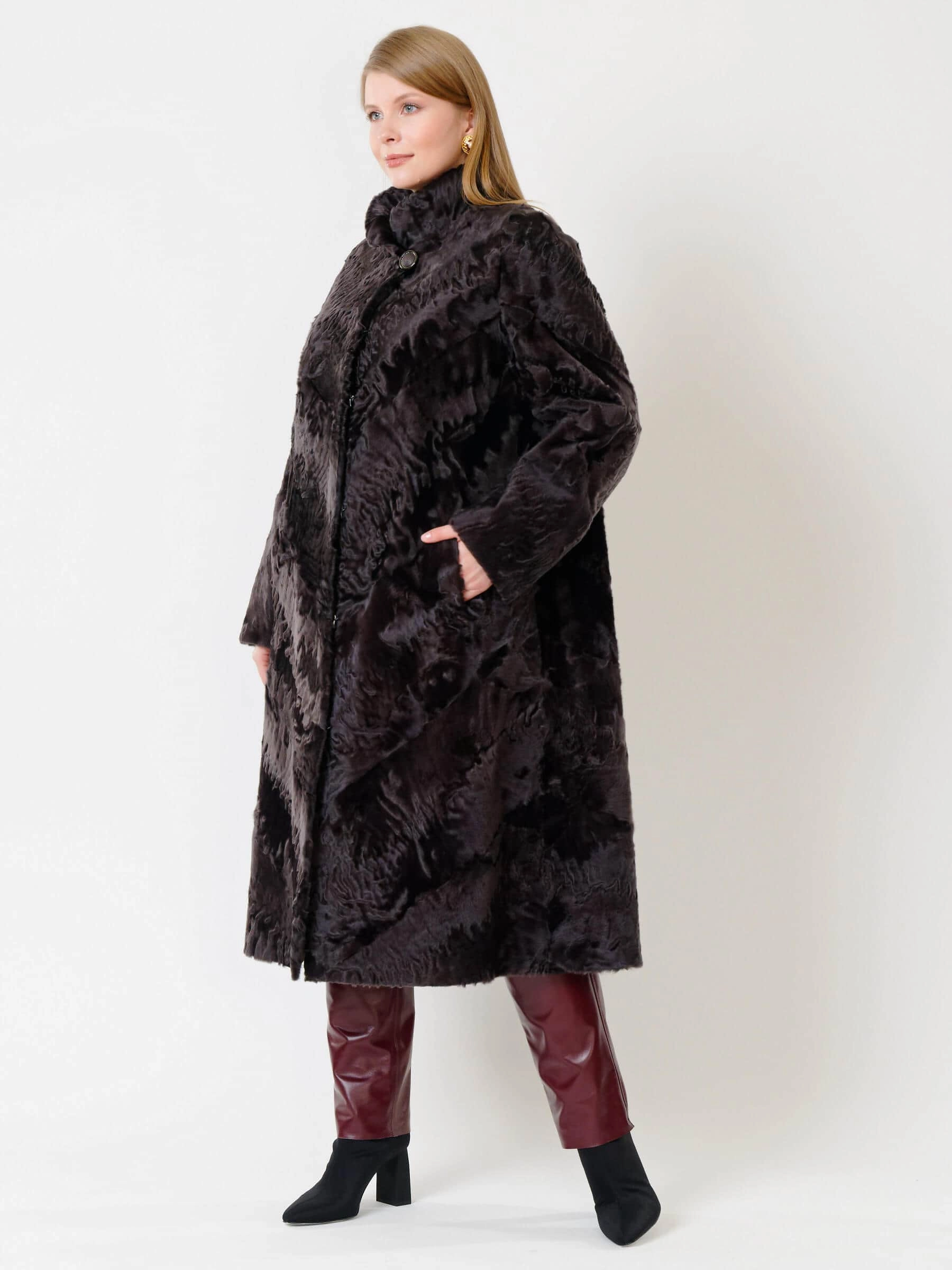 Товар длинная женская каракулевая шуба елизавета(с), коричневая, размер 56, артикул 22680 выполнен из каракуль с застежкой клипсы. Рассчитан на сезон: осень-зима. Длина изделия свыше 90 см, силуэт трапеция.