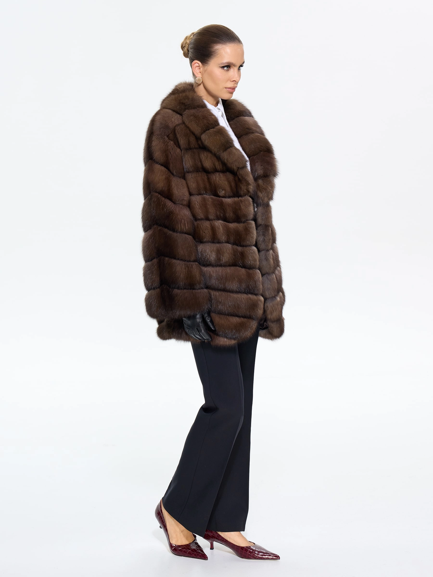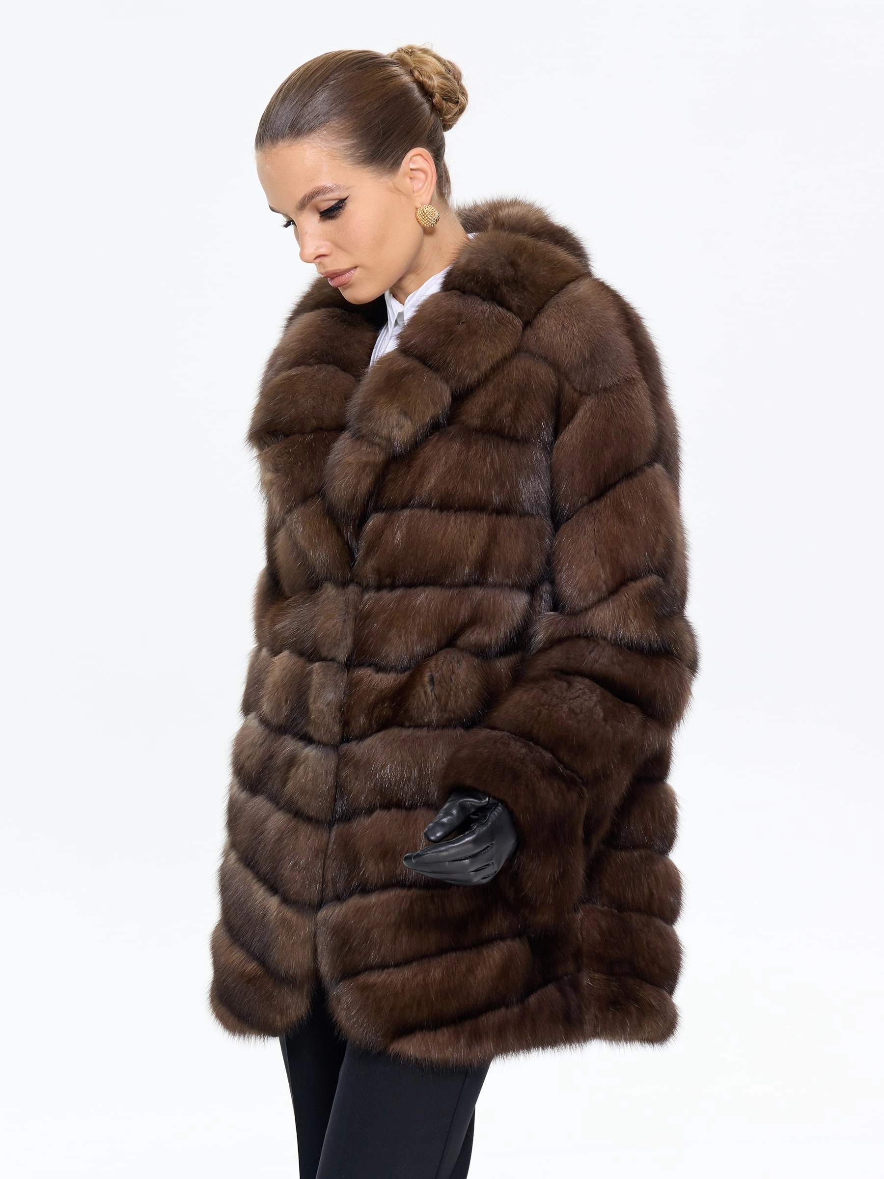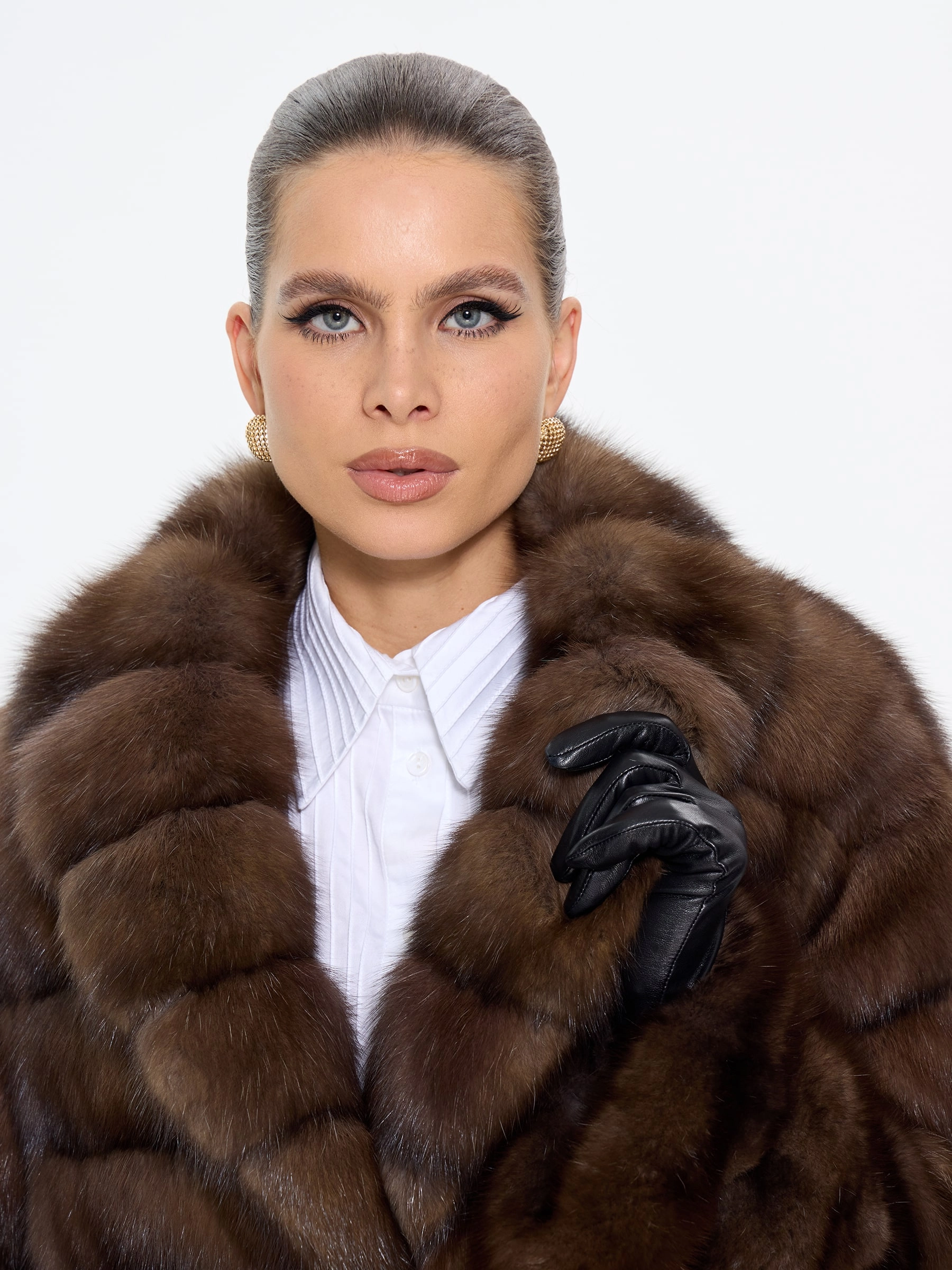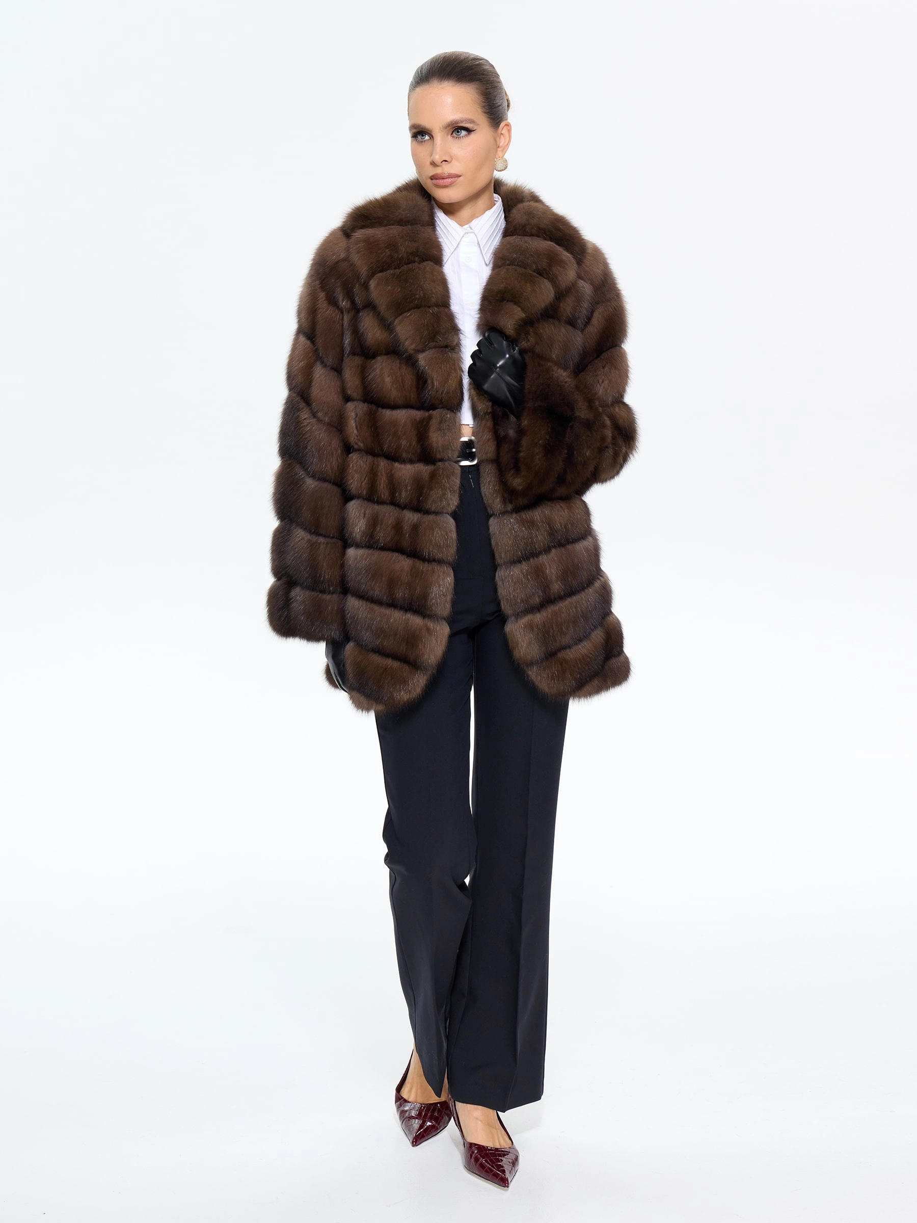 Роскошная шуба из меха соболя премиум-класса длиной 75 см с элегантным шалевидным воротником — это воплощение утонченности. Модель прямого силуэта с втачными рукавами и изящными клипсами безупречно дополнит вашу коллекцию. Стилисты рекомендуют носить ее с тонкими свитерами и кожаными брюками для дневного образа или накинуть поверх вечернего платья, чтобы подчеркнуть статус и чувство стиля.