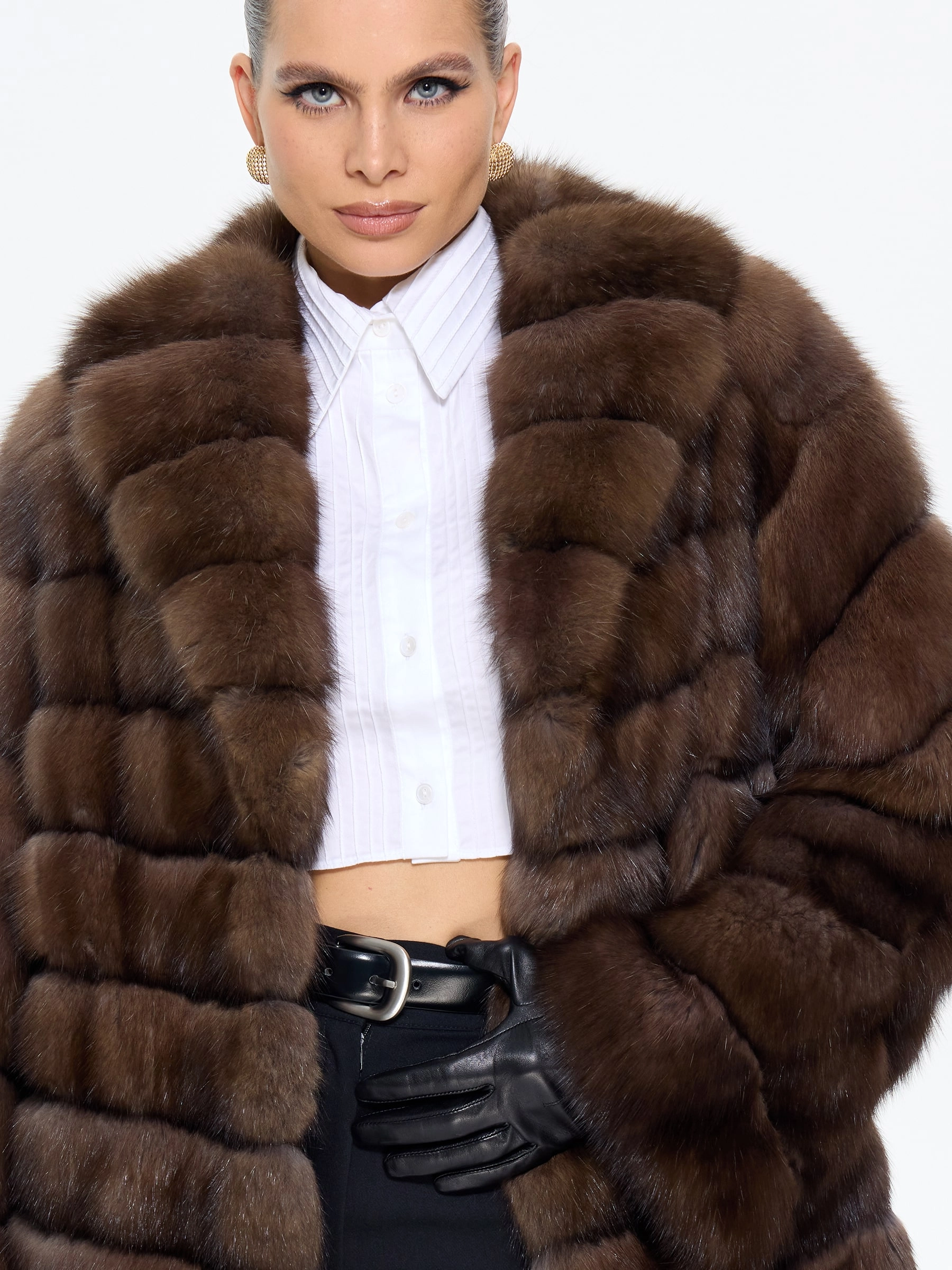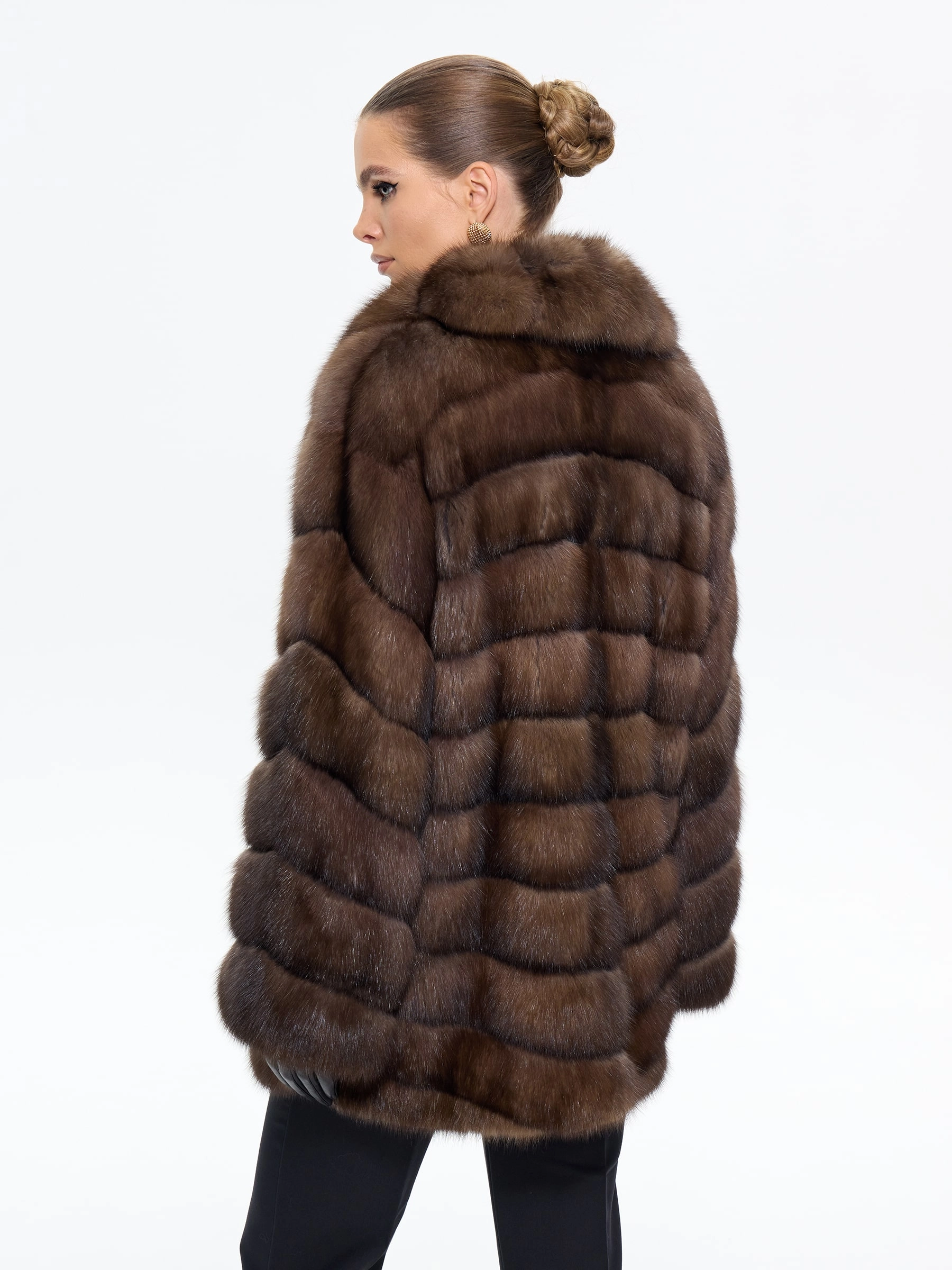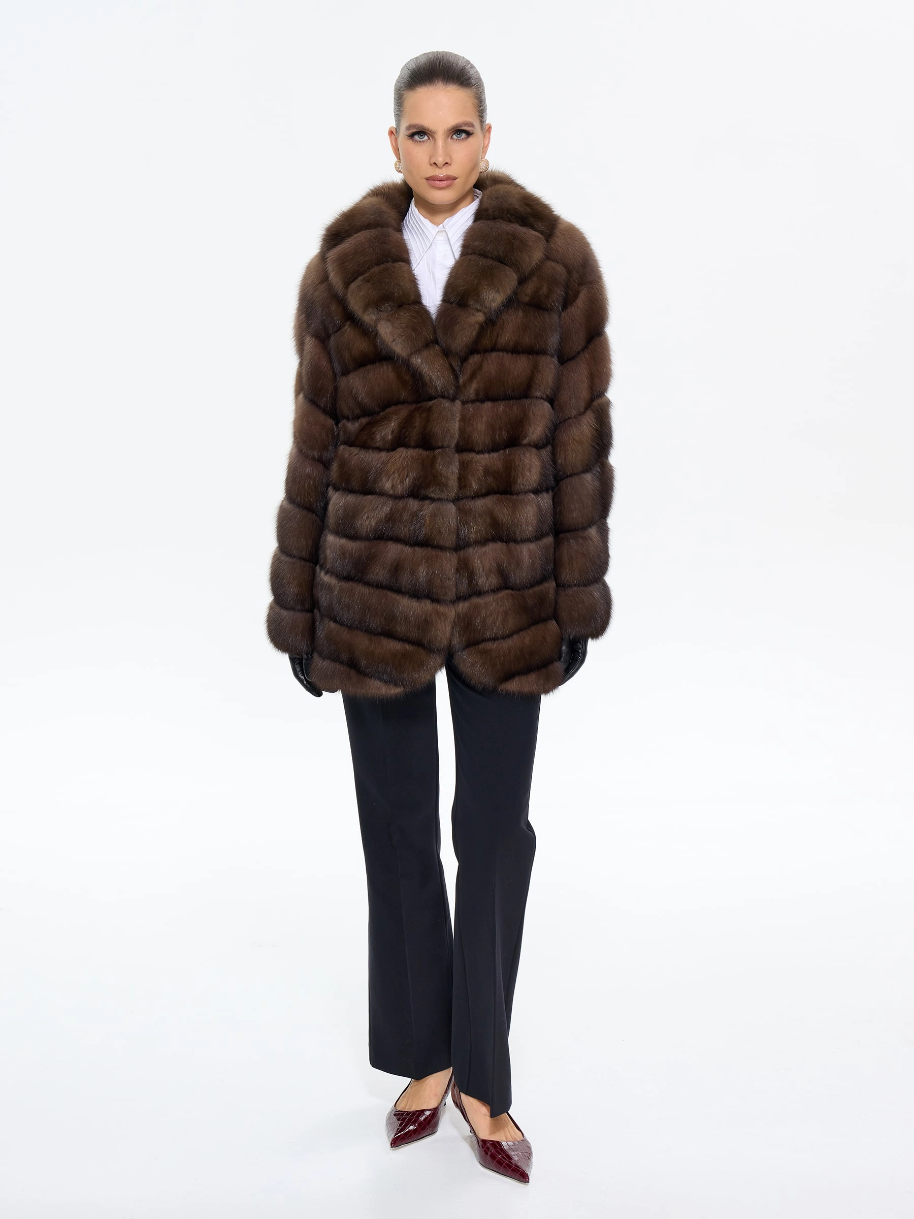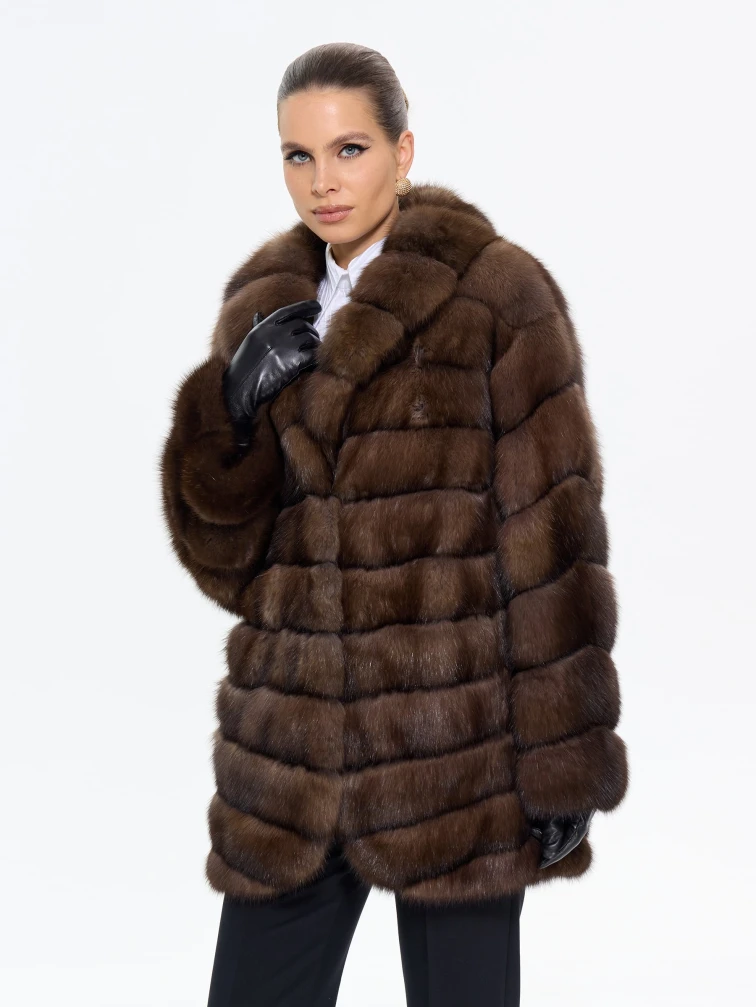 Роскошная шуба из меха соболя премиум-класса длиной 75 см с элегантным шалевидным воротником — это воплощение утонченности. Модель прямого силуэта с втачными рукавами и изящными клипсами безупречно дополнит вашу коллекцию. Стилисты рекомендуют носить ее с тонкими свитерами и кожаными брюками для дневного образа или накинуть поверх вечернего платья, чтобы подчеркнуть статус и чувство стиля.